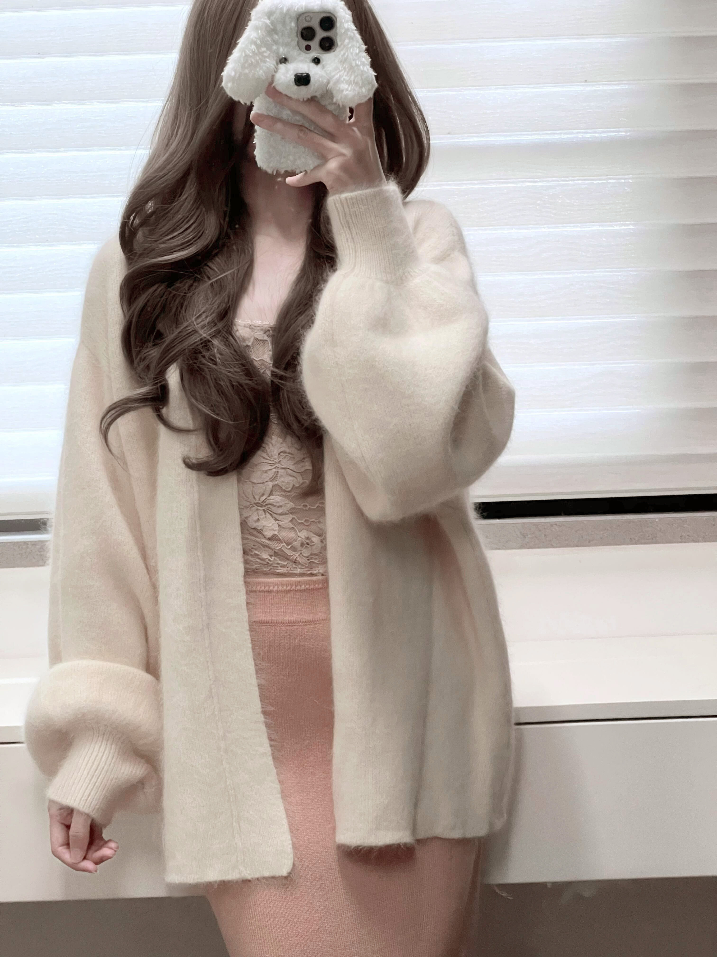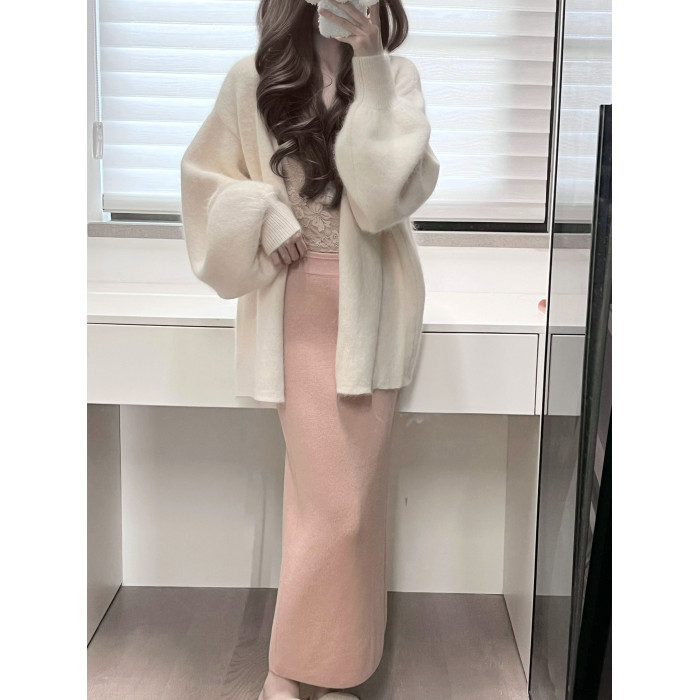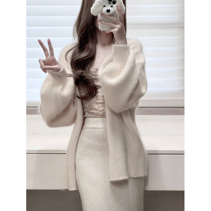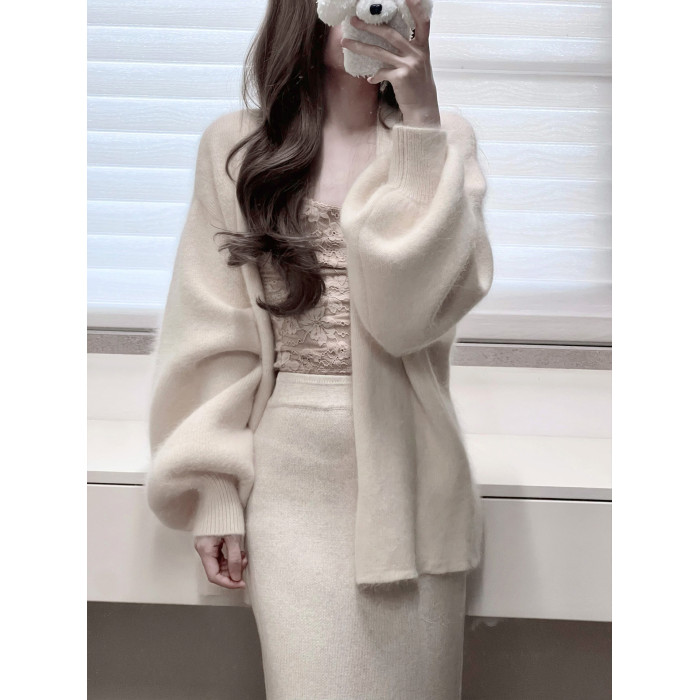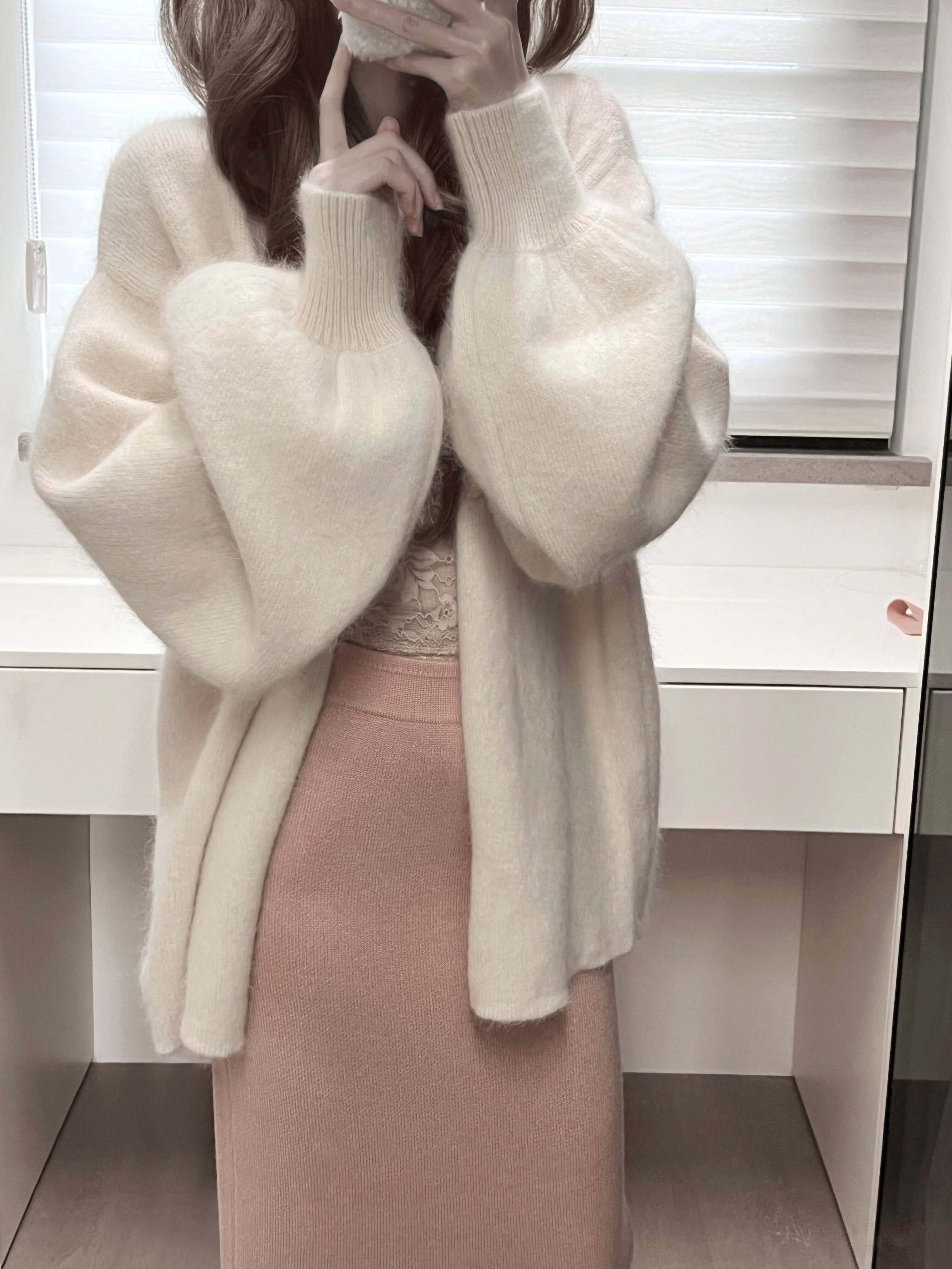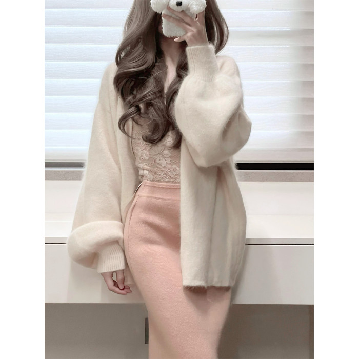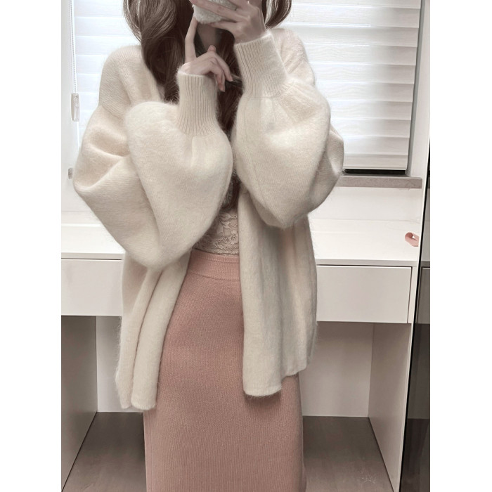 白色燈籠袖軟糯水貂絨開衫毛衣女秋冬寬松慵懶風高級感針織衫外套