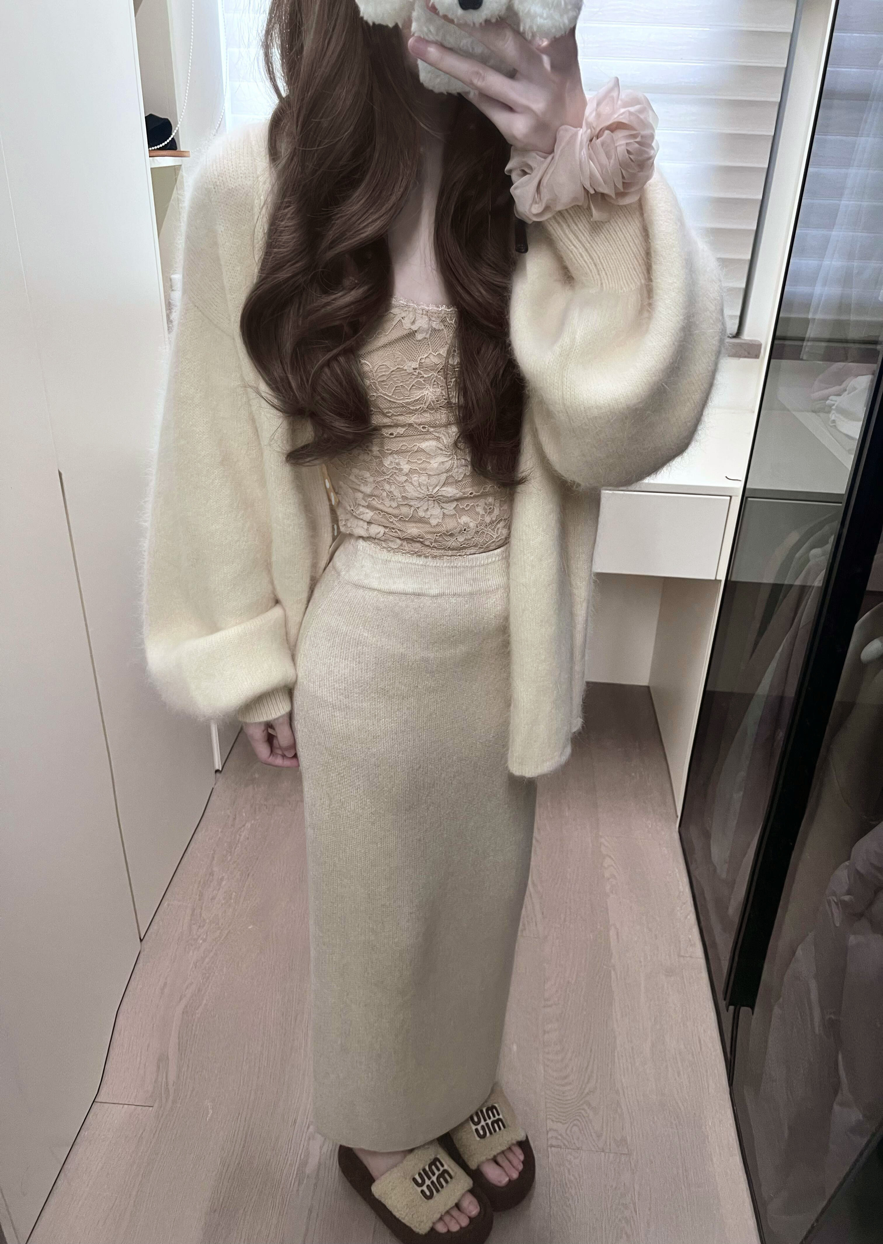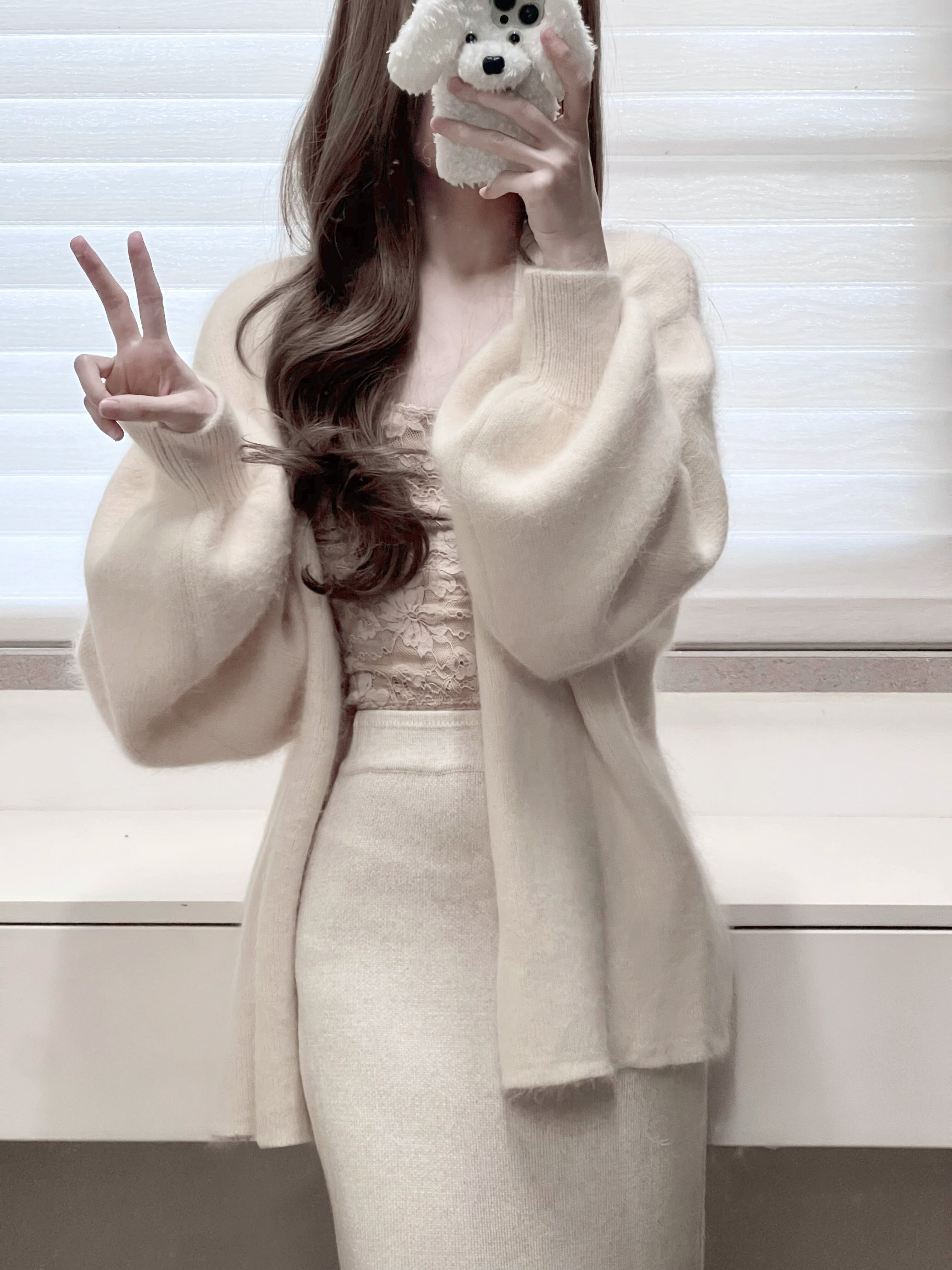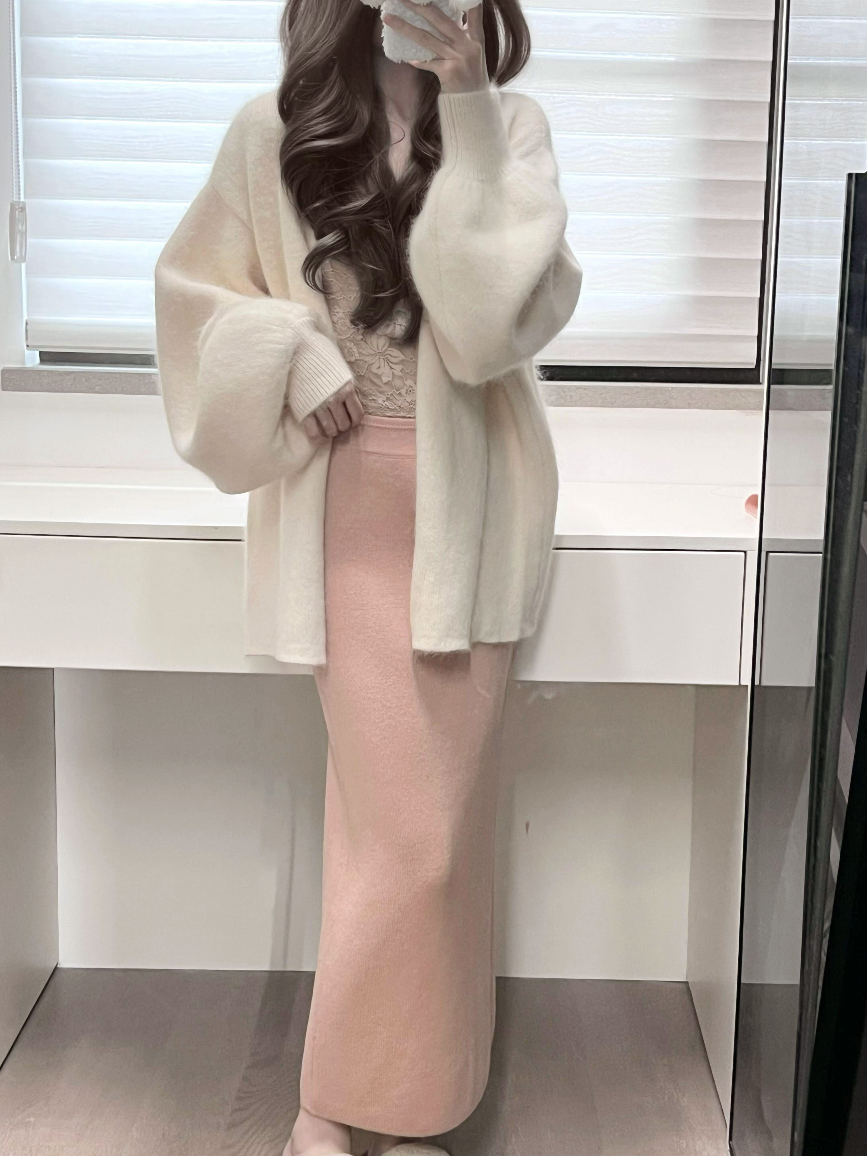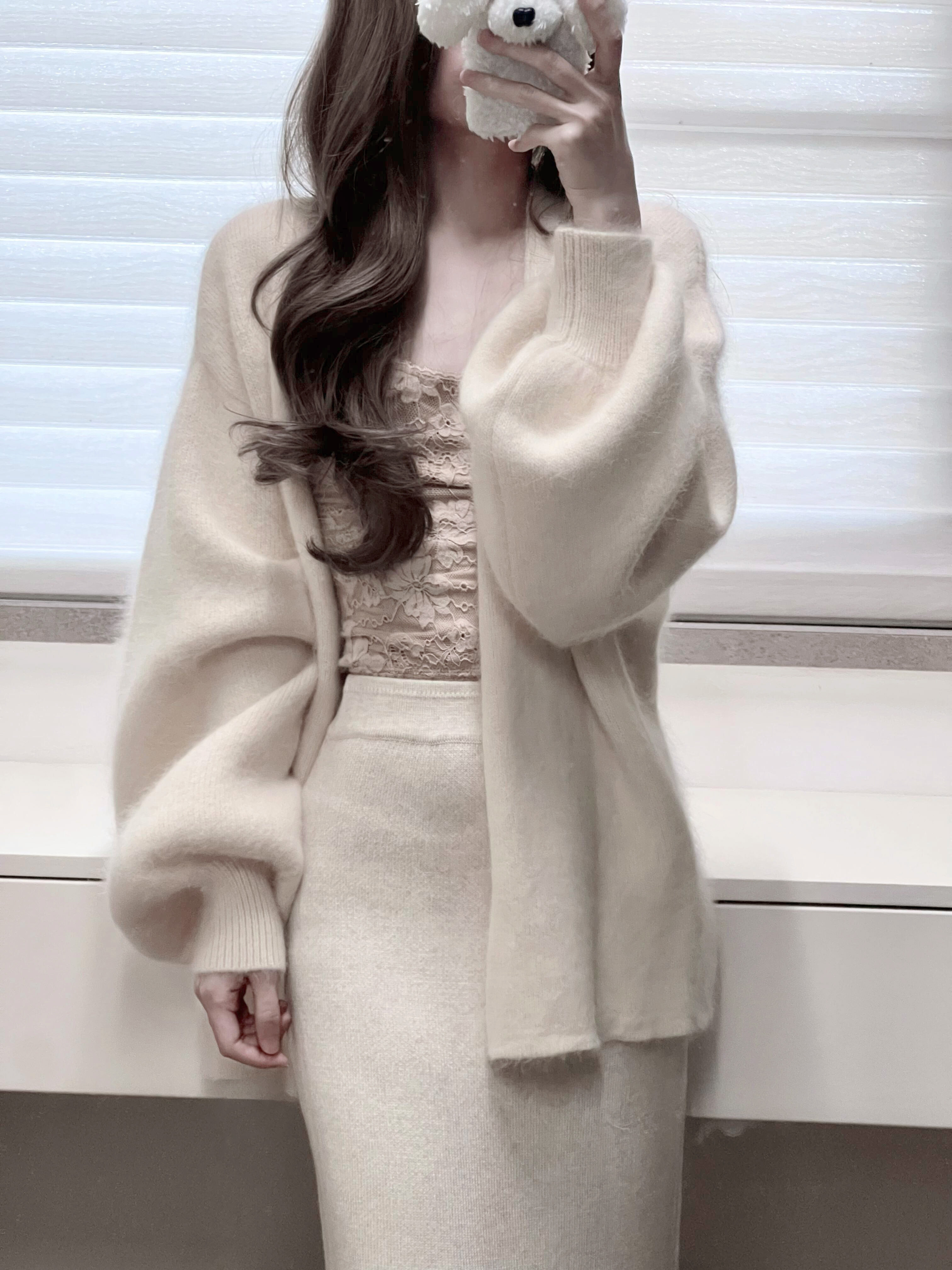 白色燈籠袖軟糯水貂絨開衫毛衣女秋冬寬松慵懶風高級感針織衫外套