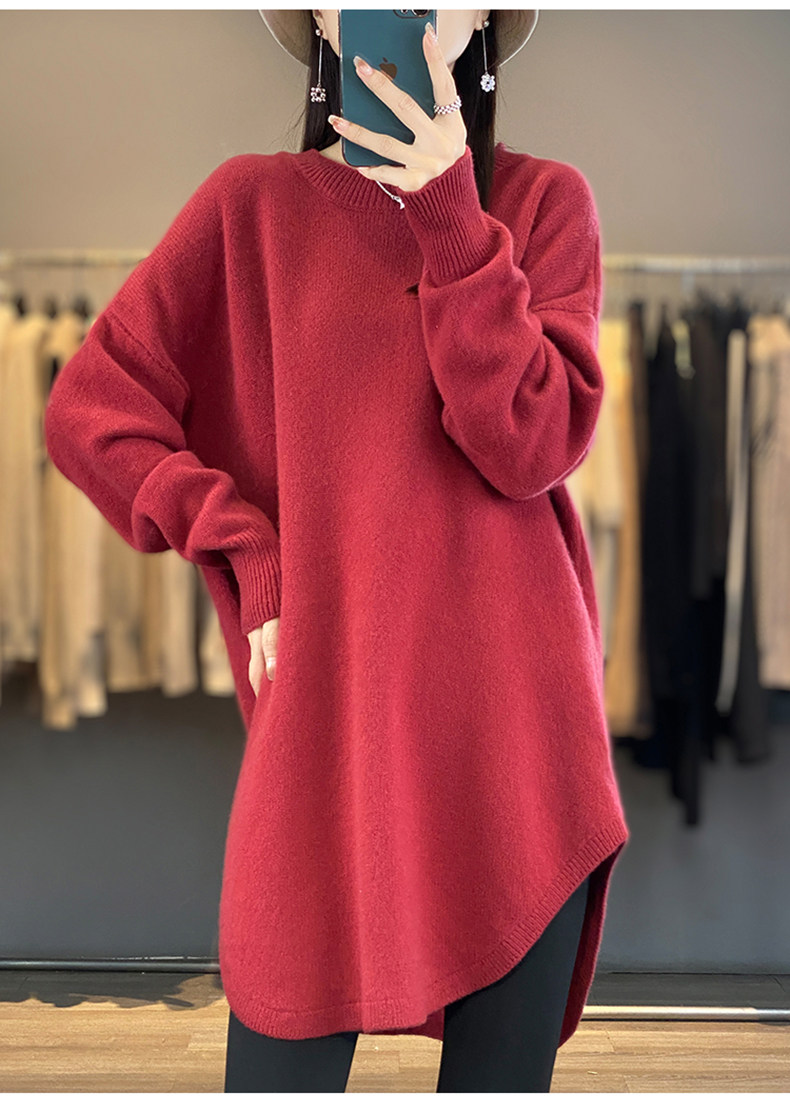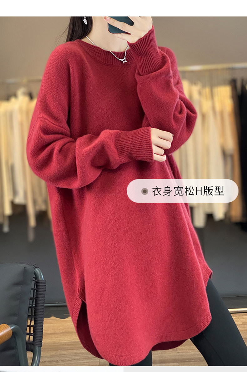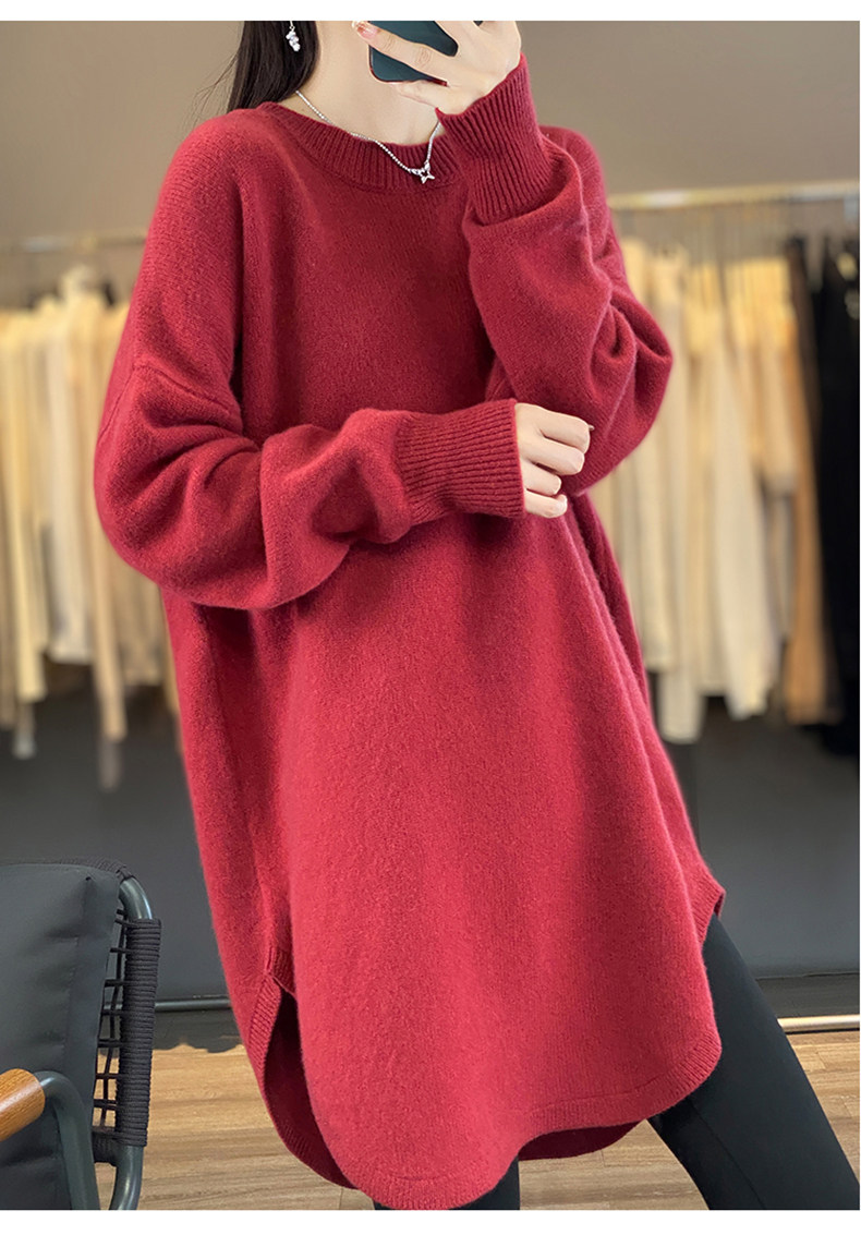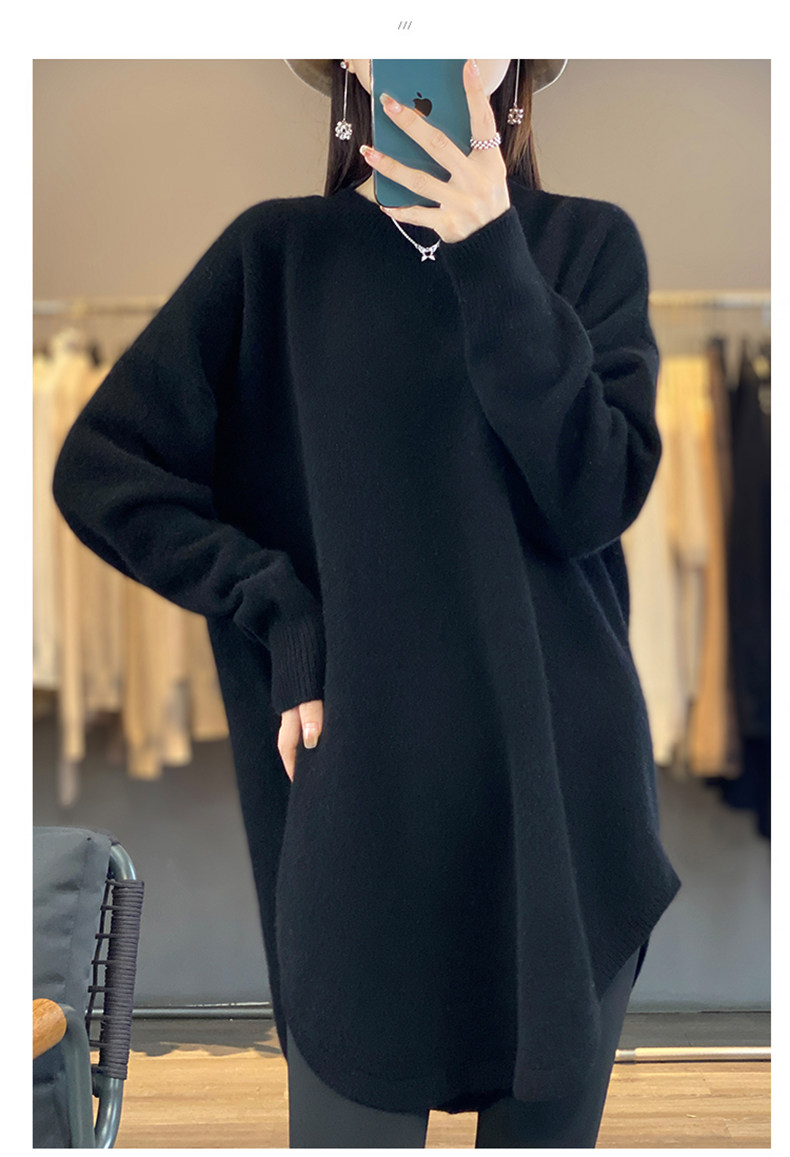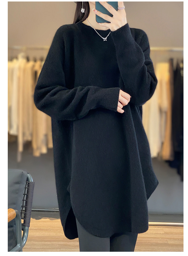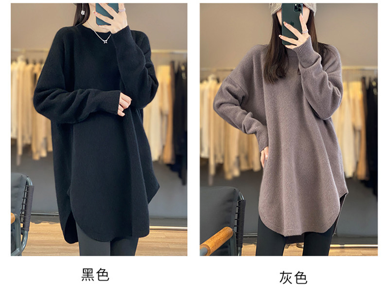 秋冬圓領中長款圓弧毛衣女寬松大碼慵懶風加厚休閒針織打底衫上衣