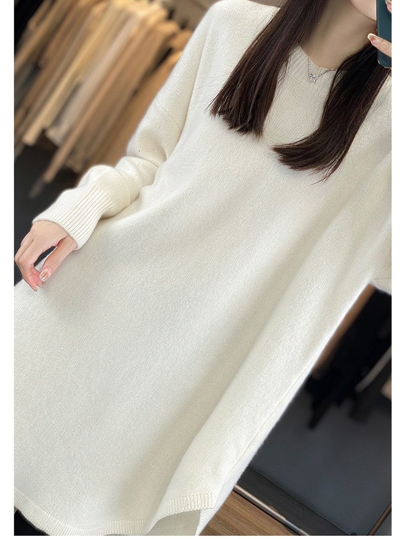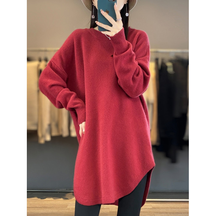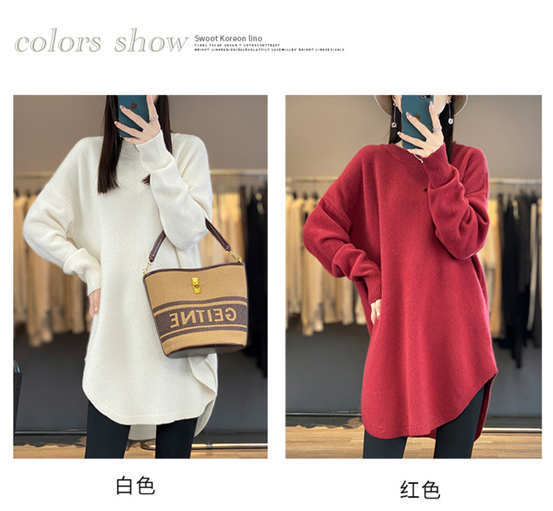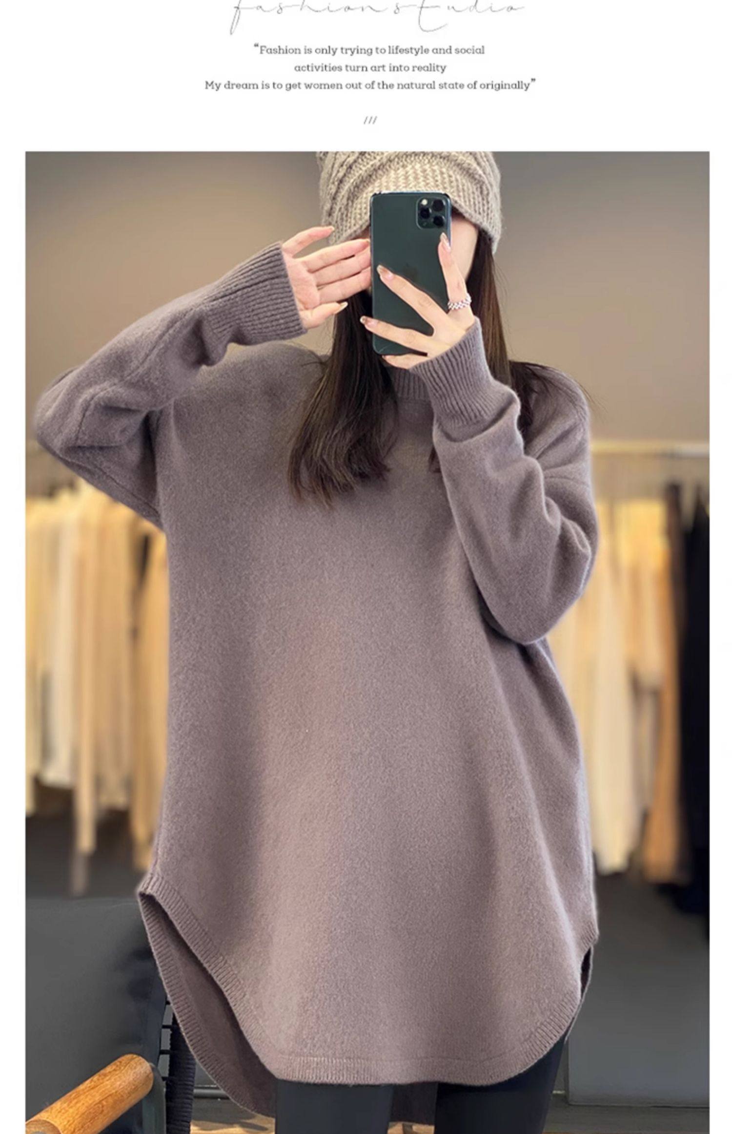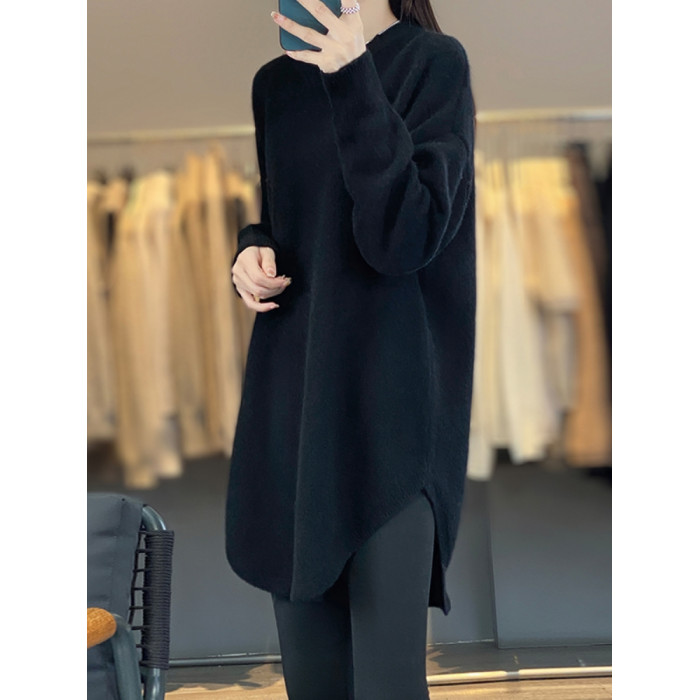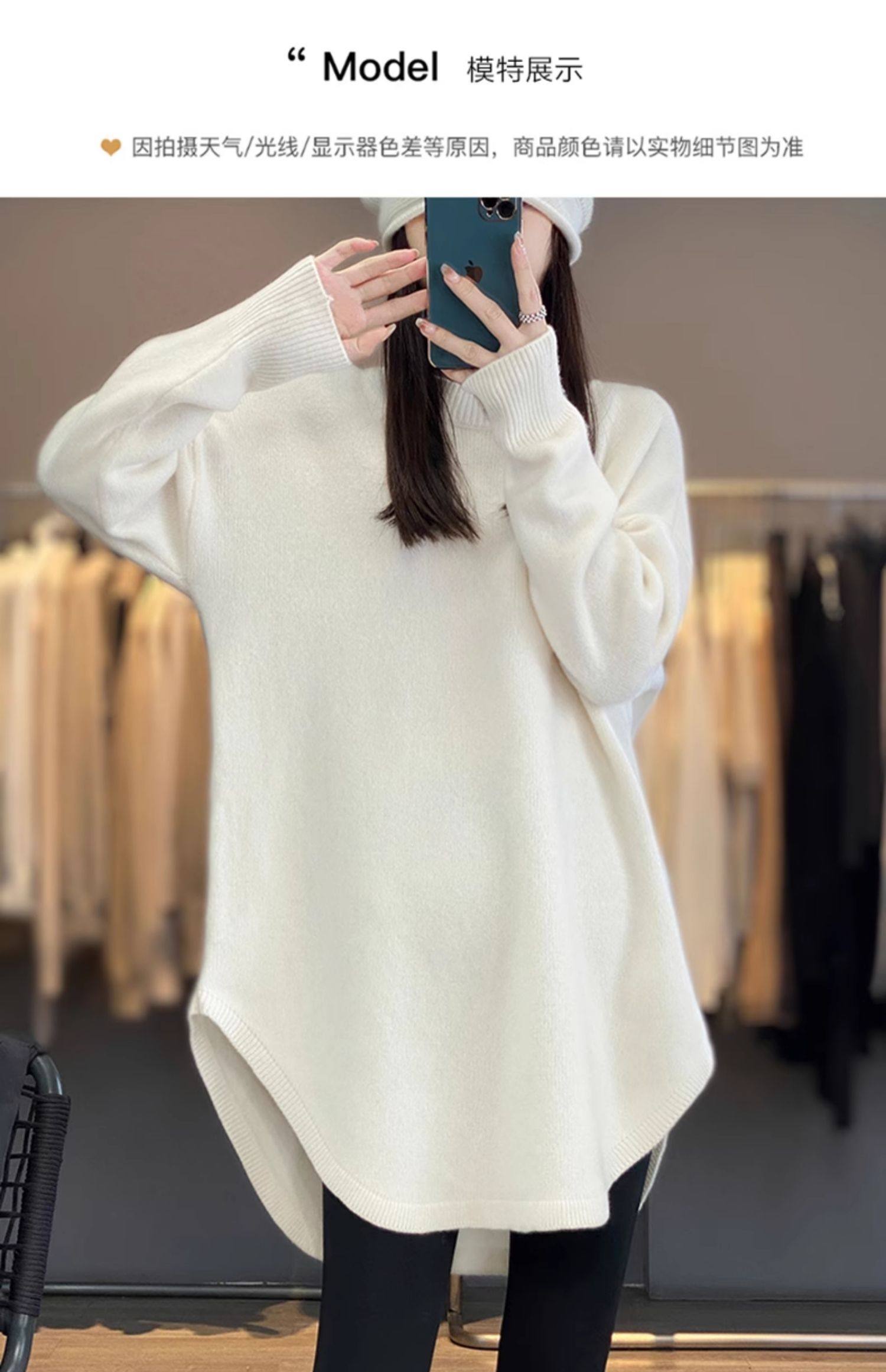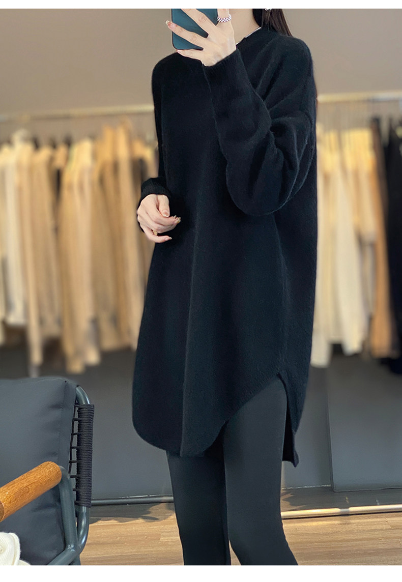 秋冬圓領中長款圓弧毛衣女寬松大碼慵懶風加厚休閒針織打底衫上衣