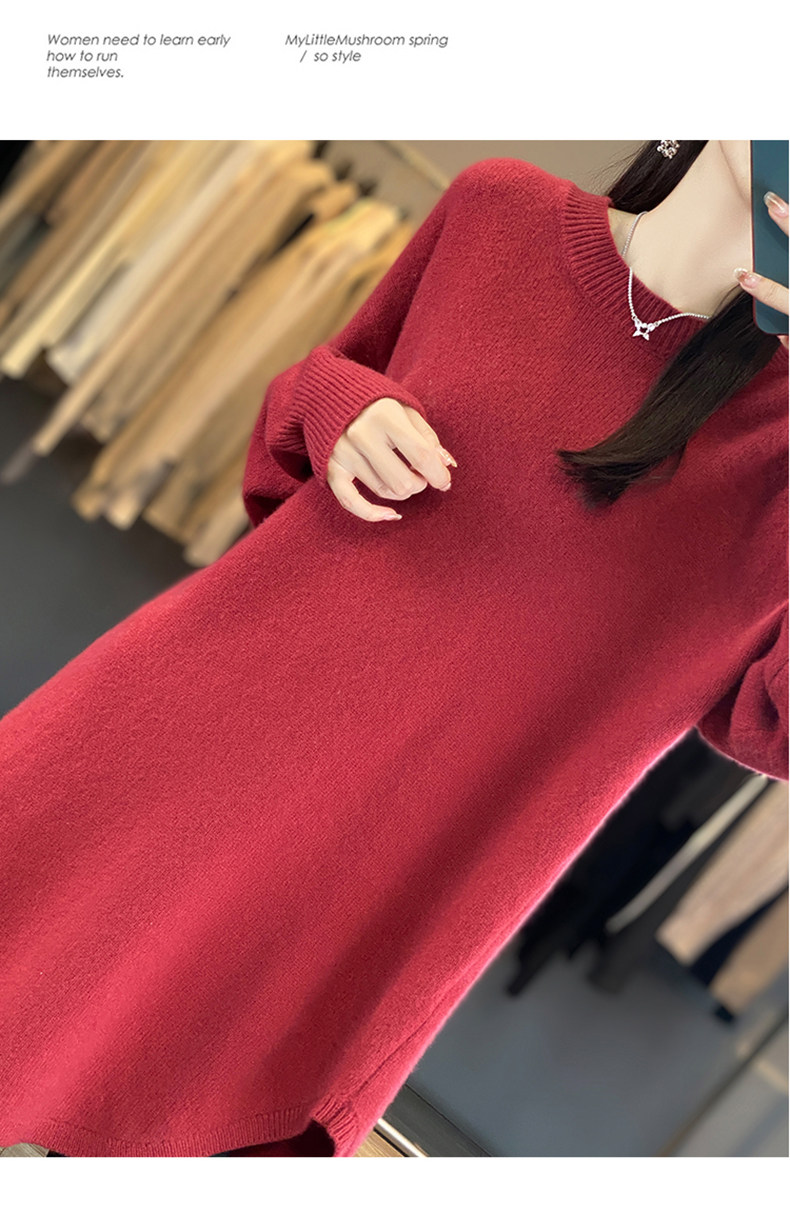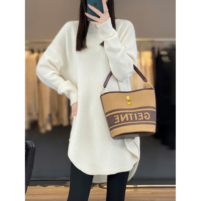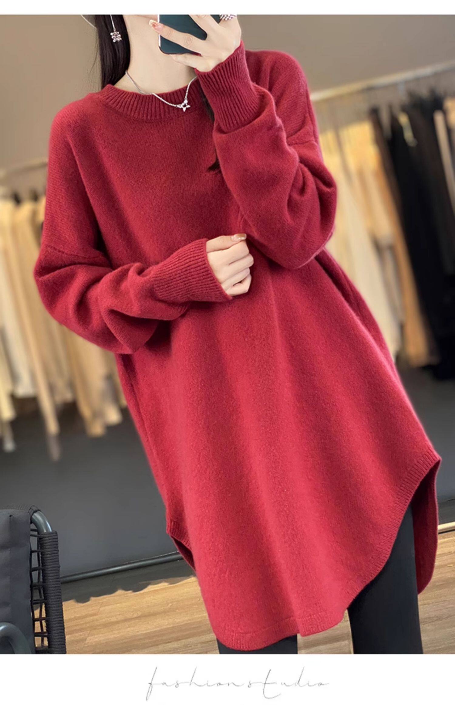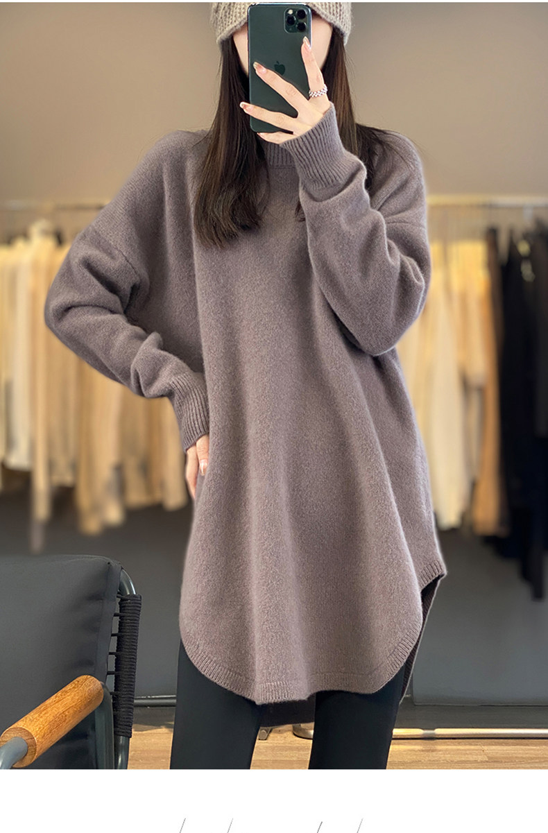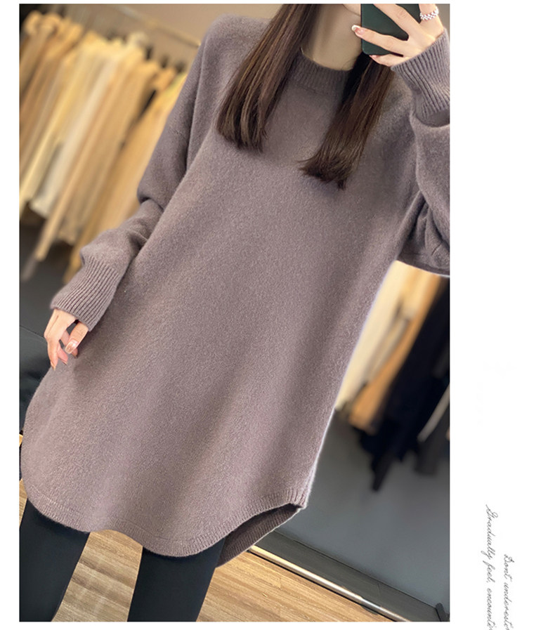 秋冬圓領中長款圓弧毛衣女寬松大碼慵懶風加厚休閒針織打底衫上衣