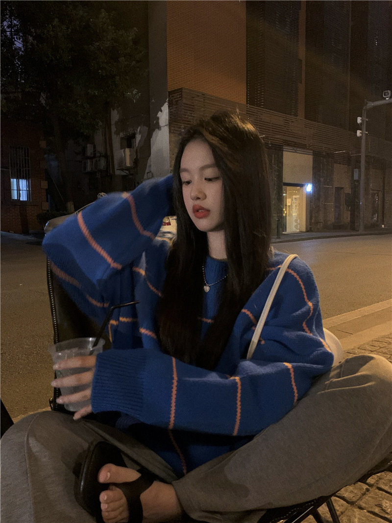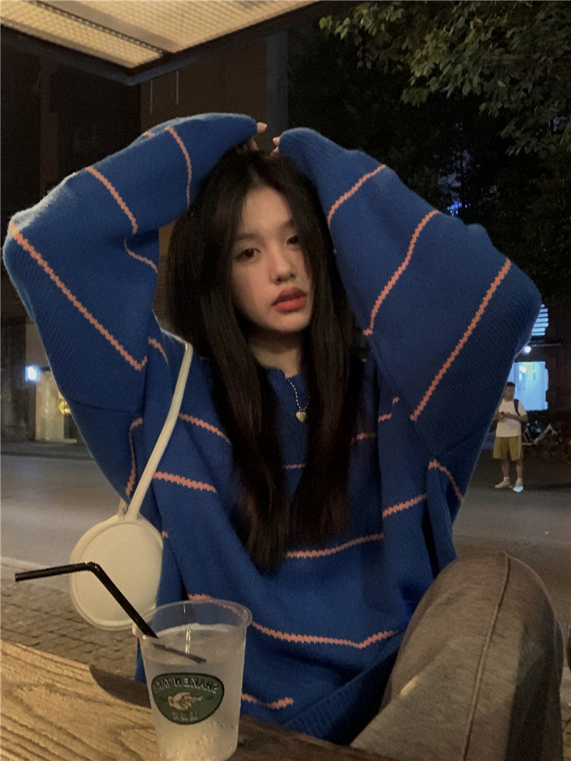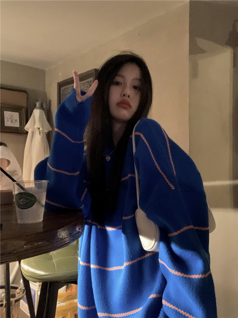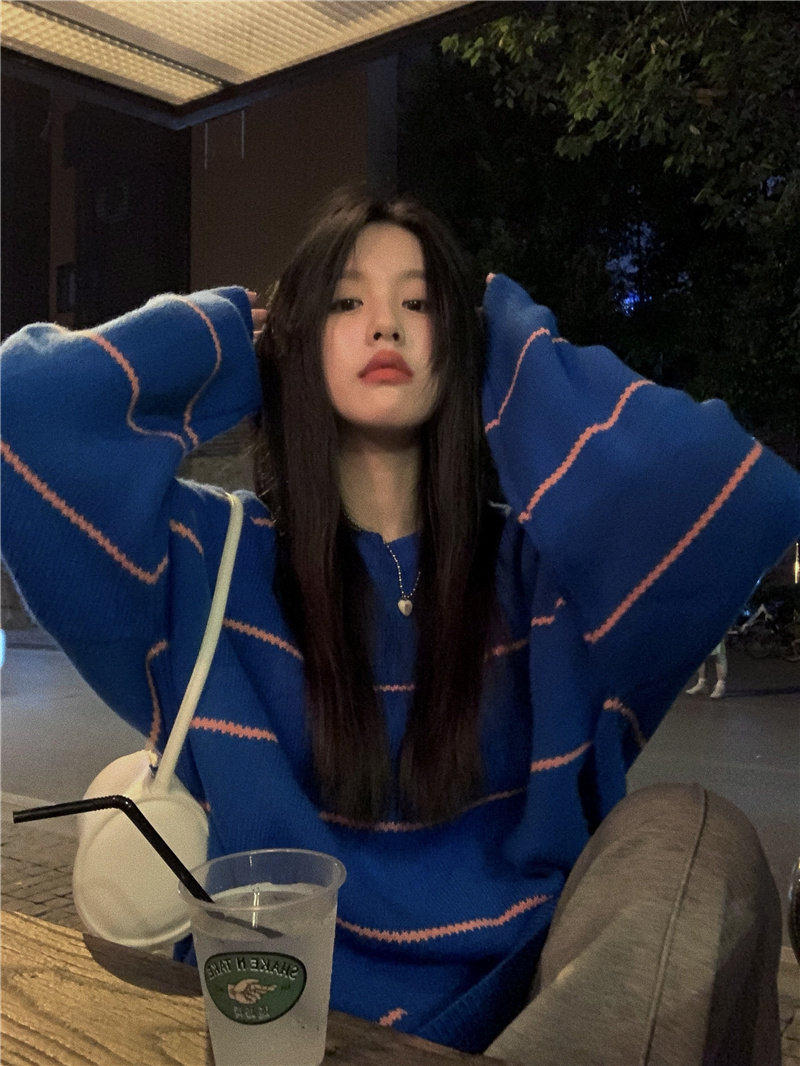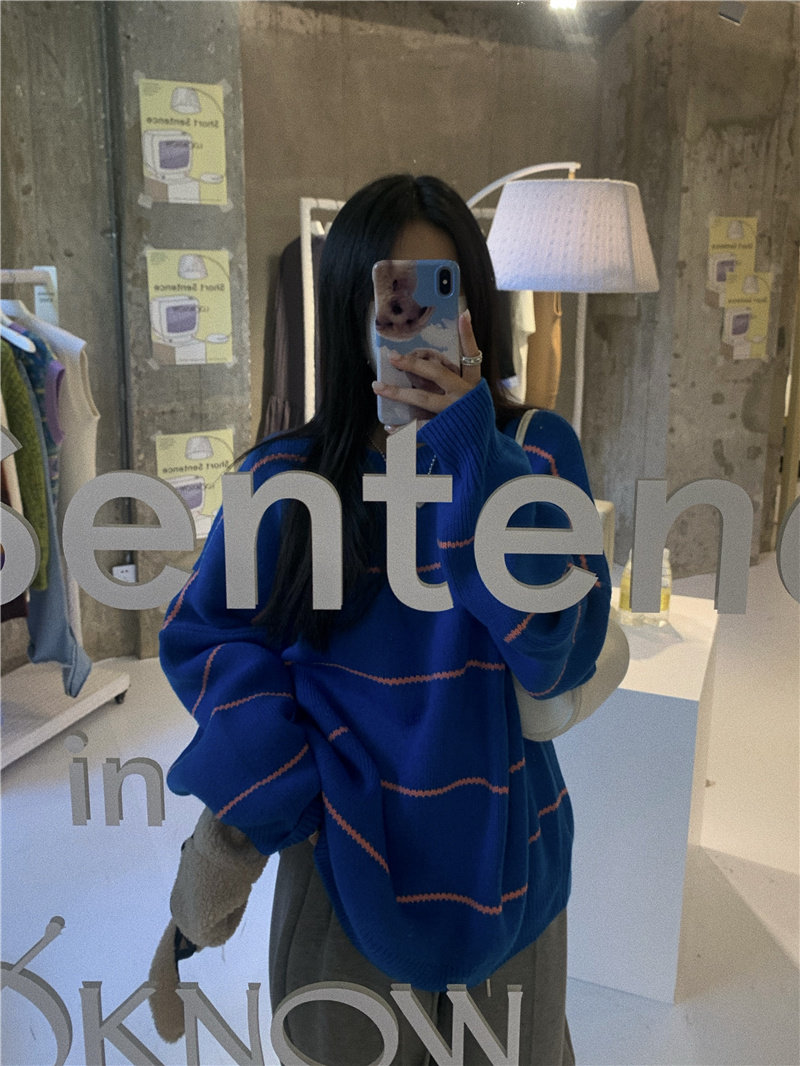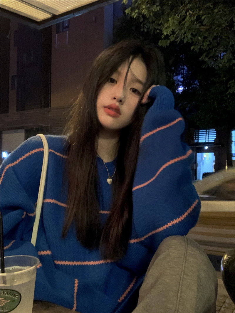 撞色條紋套頭慵懶風藍色毛衣女秋冬軟糯韓系高級感寬松針織衫上衣