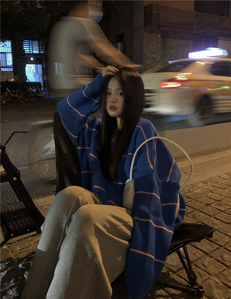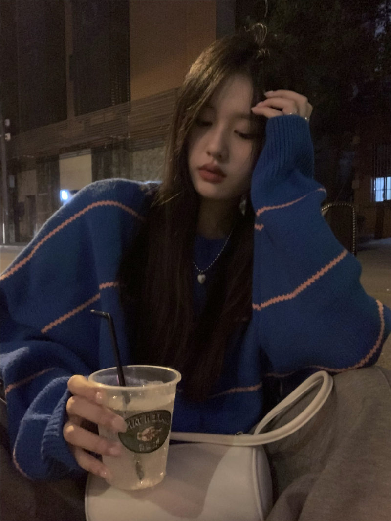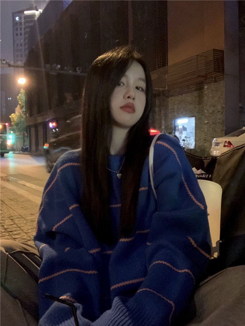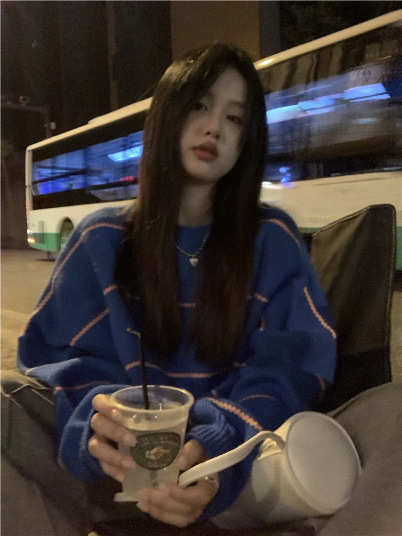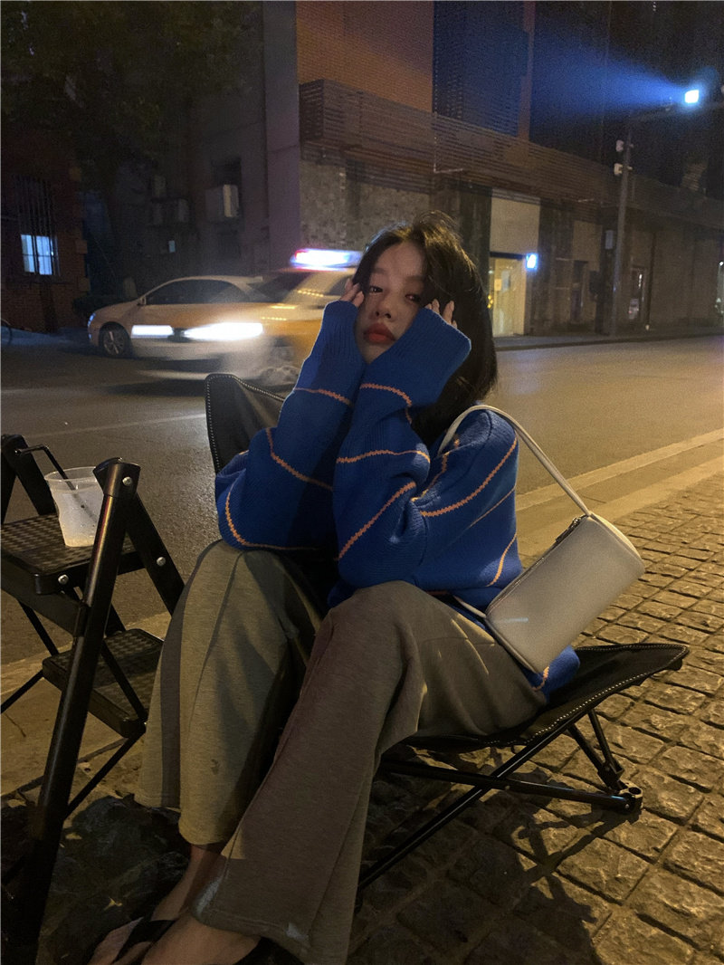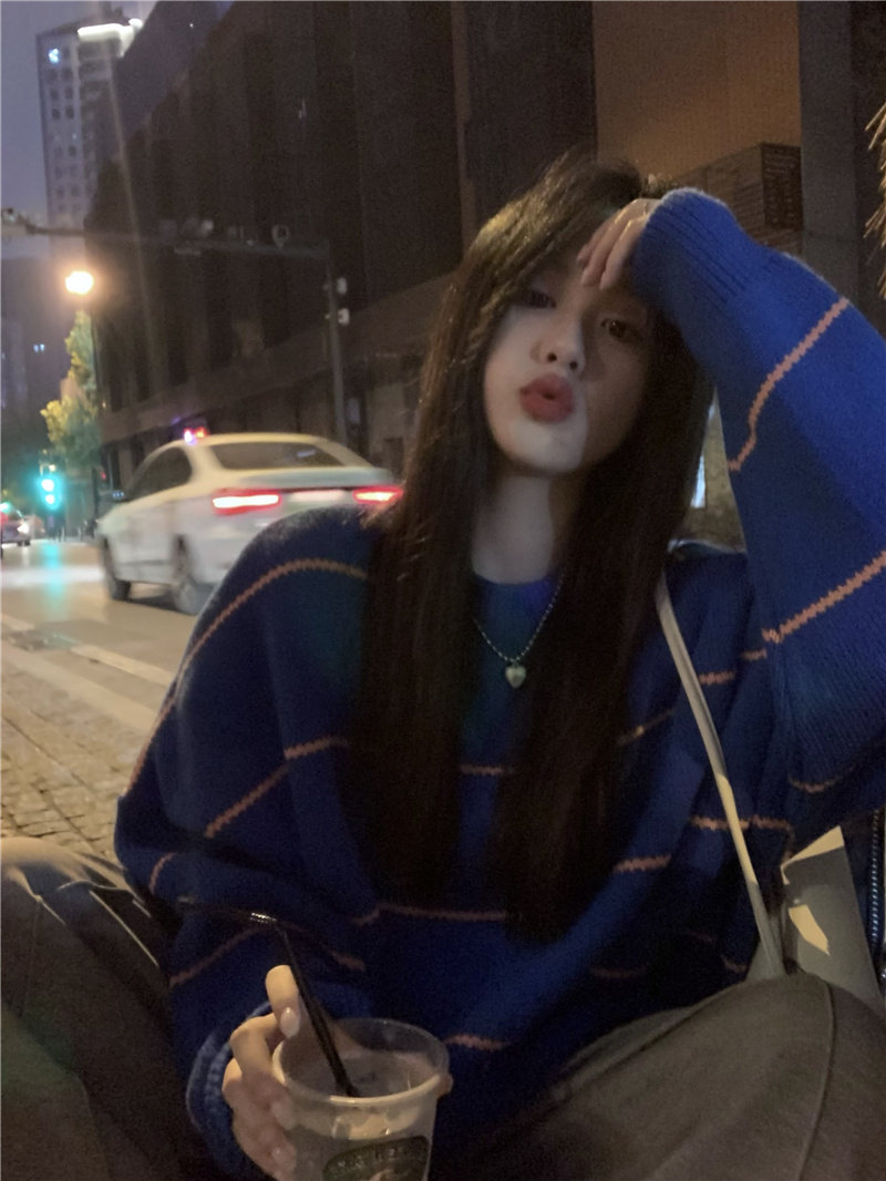 撞色條紋套頭慵懶風藍色毛衣女秋冬軟糯韓系高級感寬松針織衫上衣