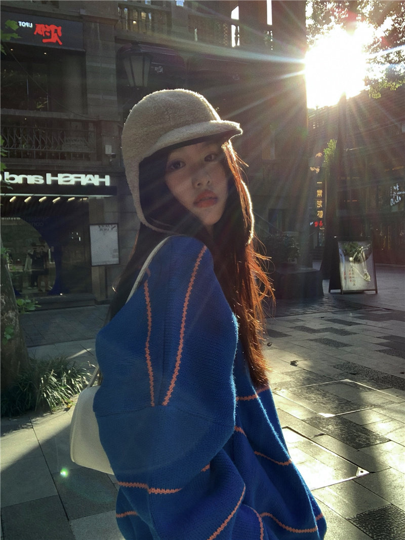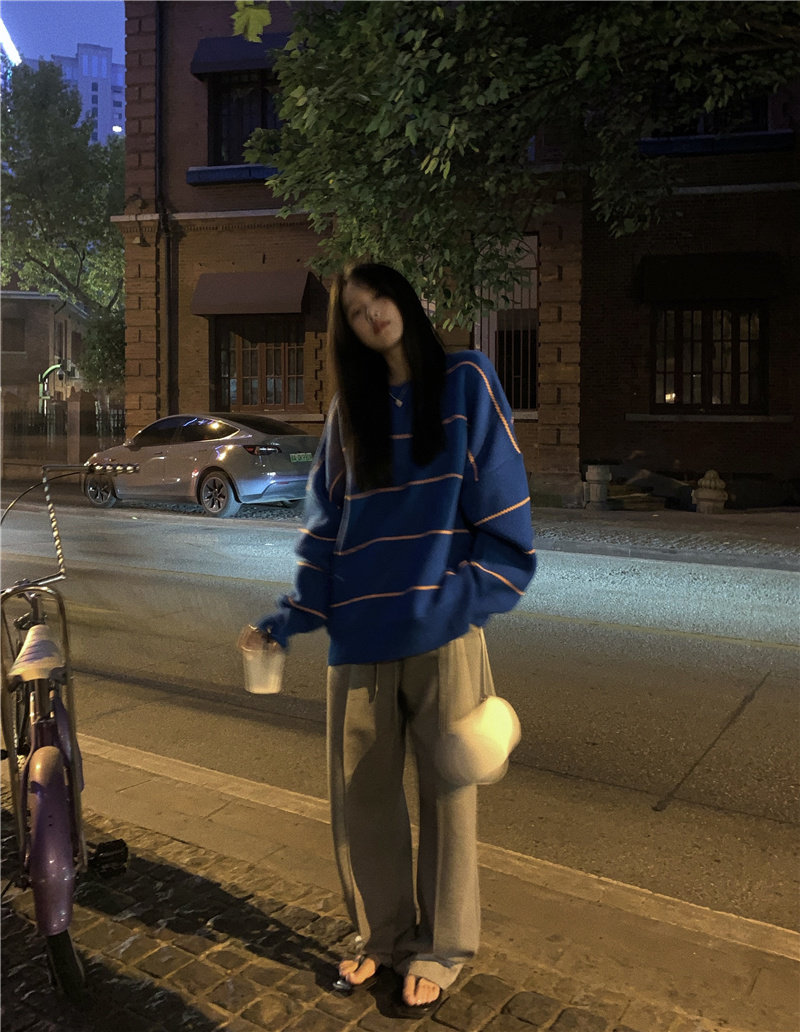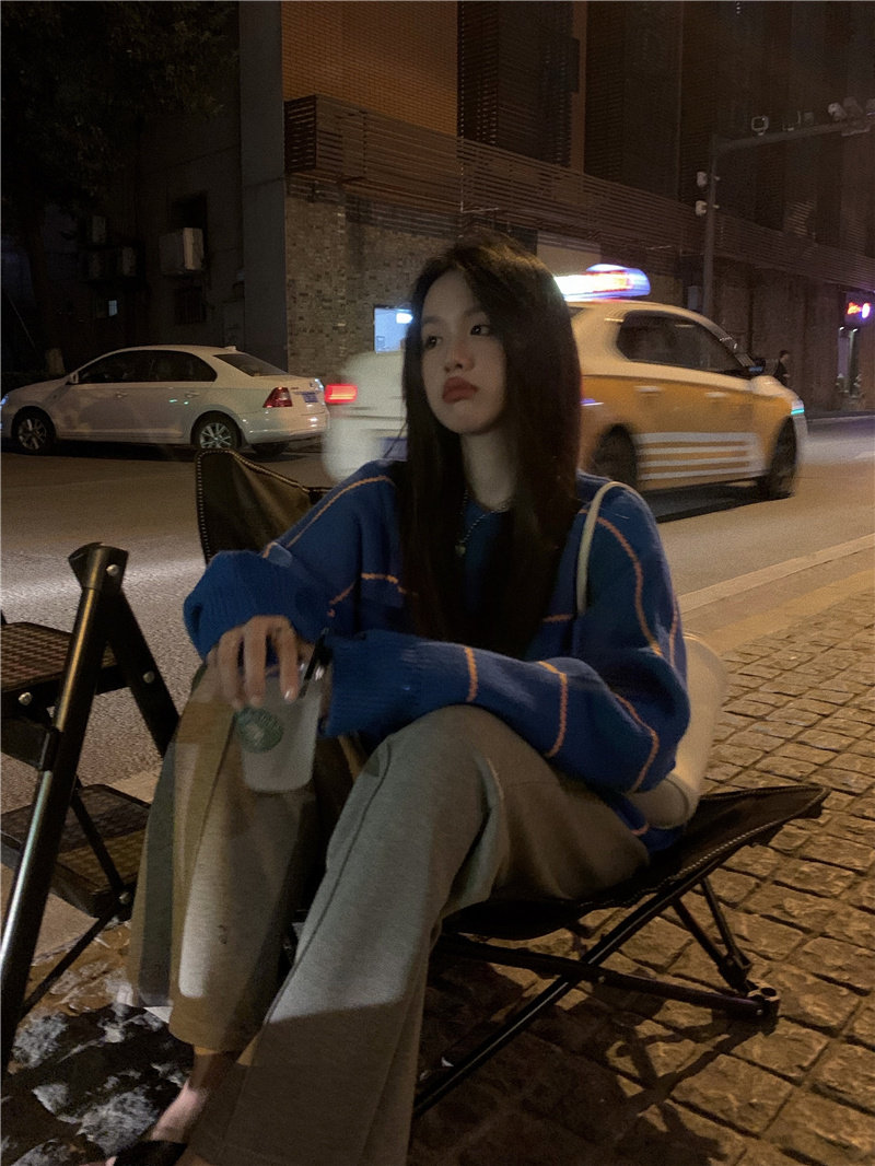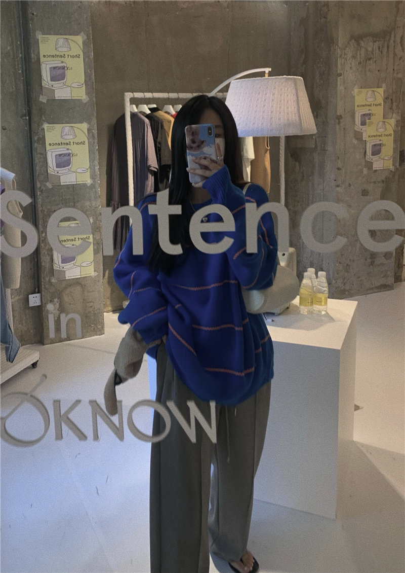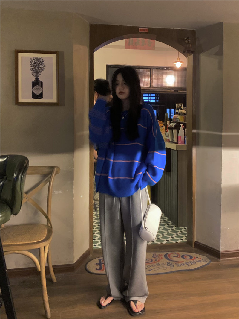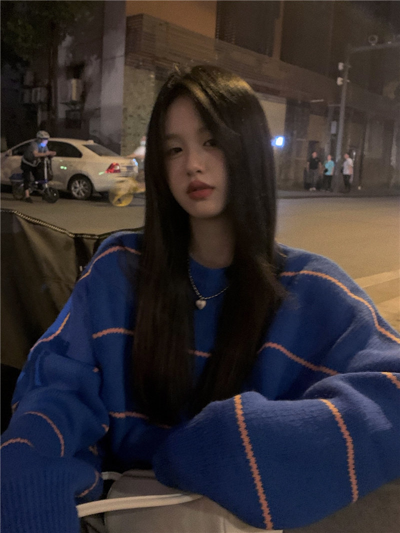 撞色條紋套頭慵懶風藍色毛衣女秋冬軟糯韓系高級感寬松針織衫上衣
