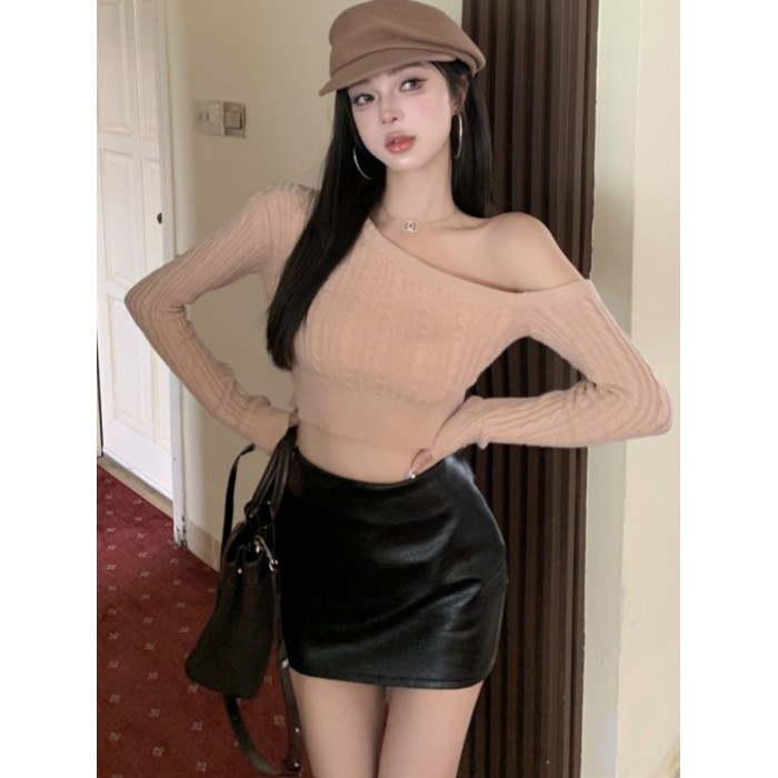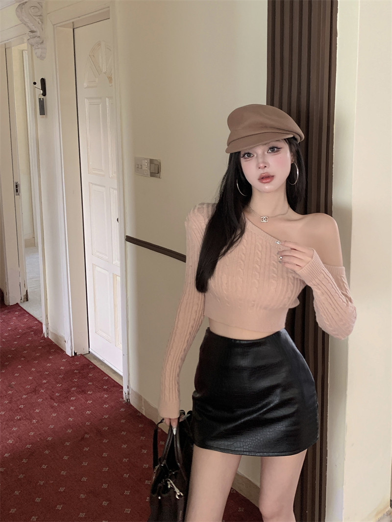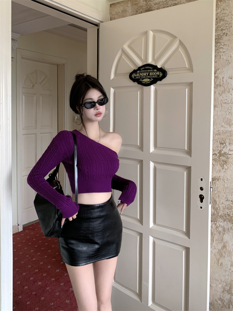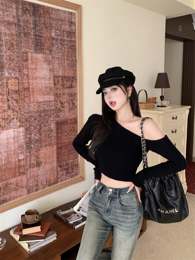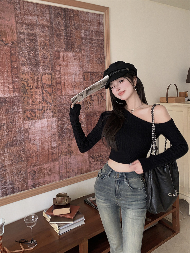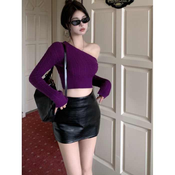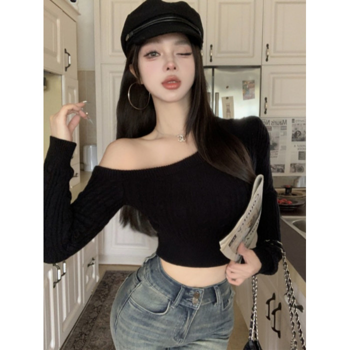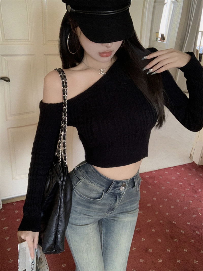 純欲短款露臍麻花長袖針織衫女秋冬季毛衣斜領露肩設計感辣妹上衣