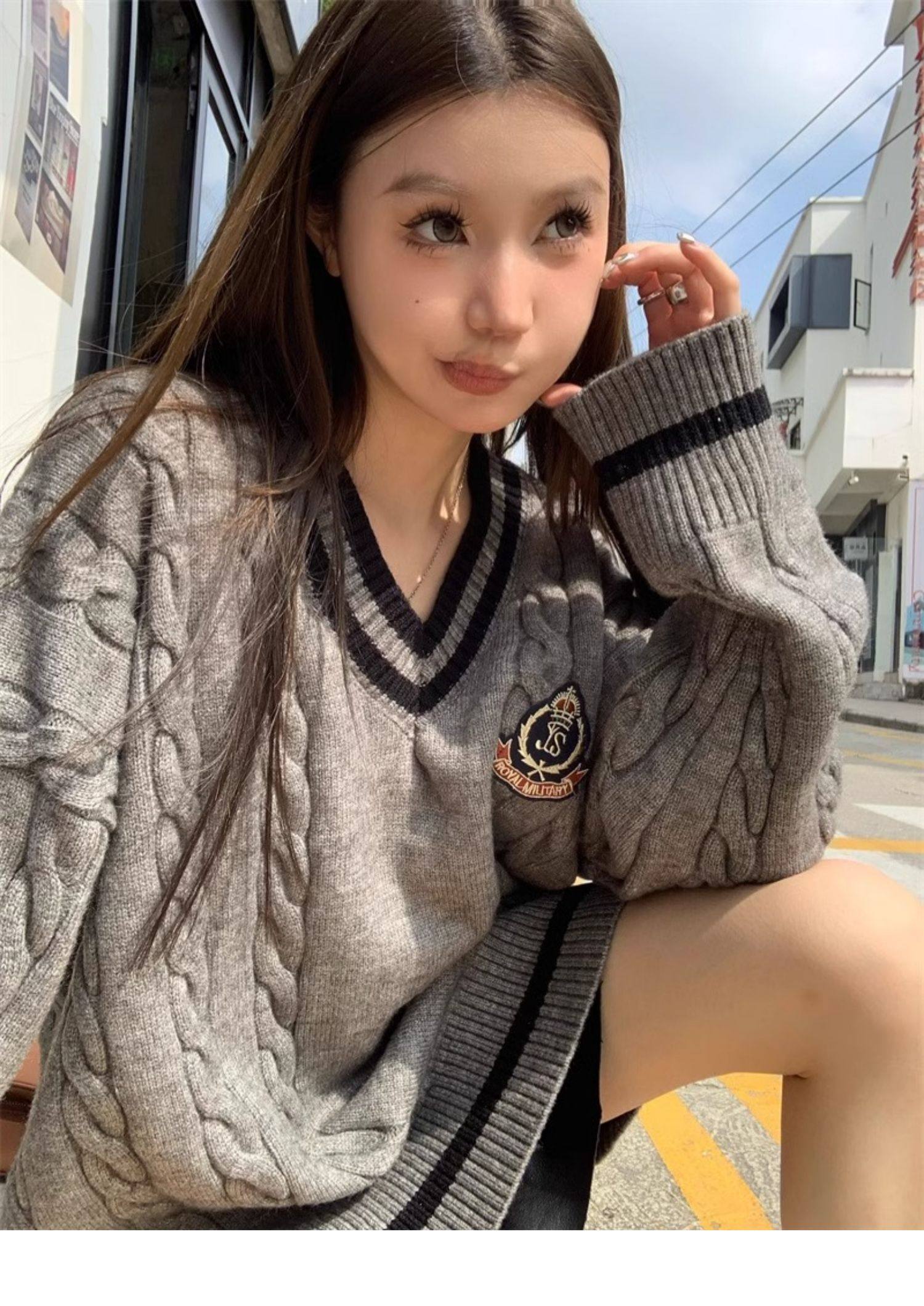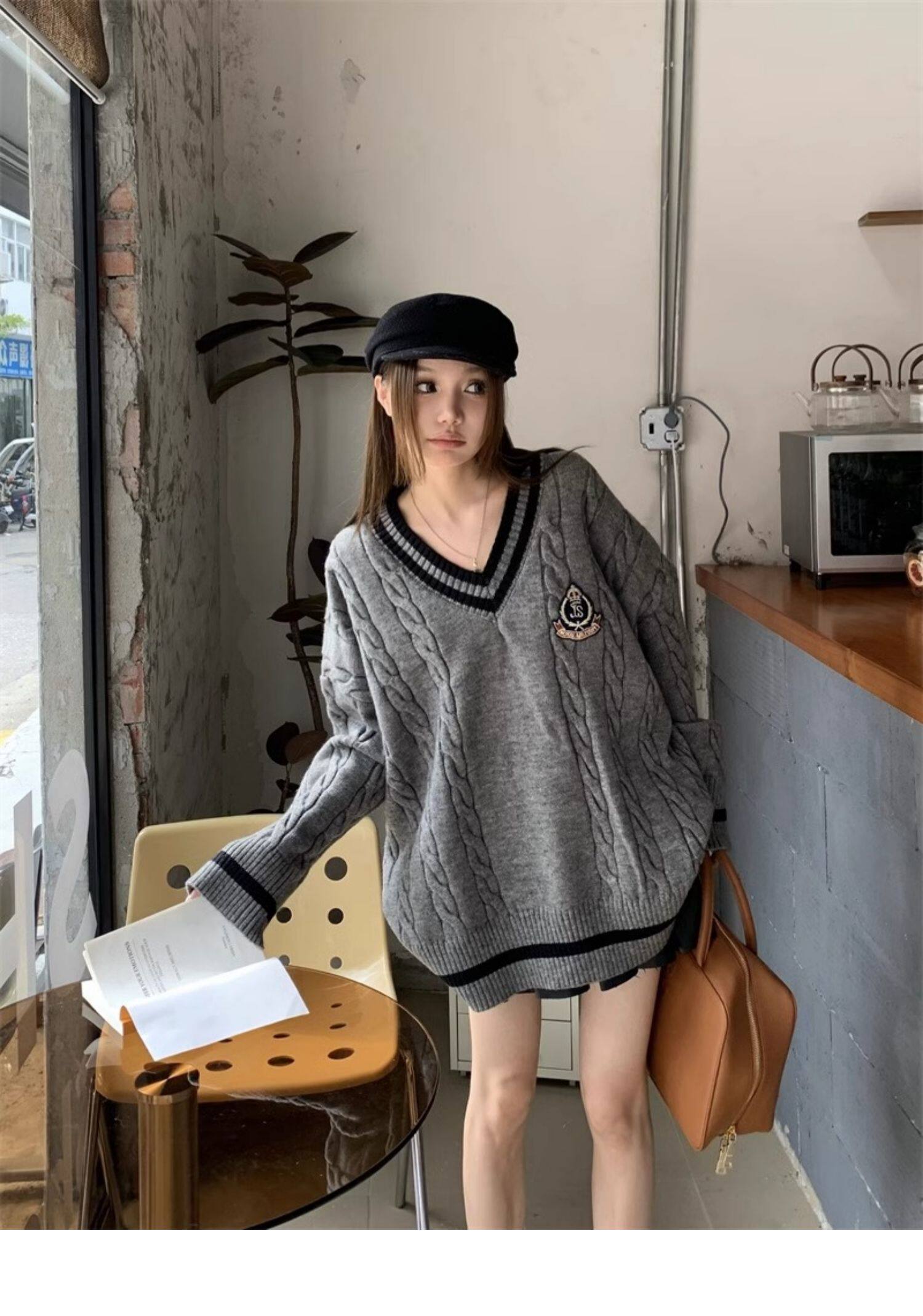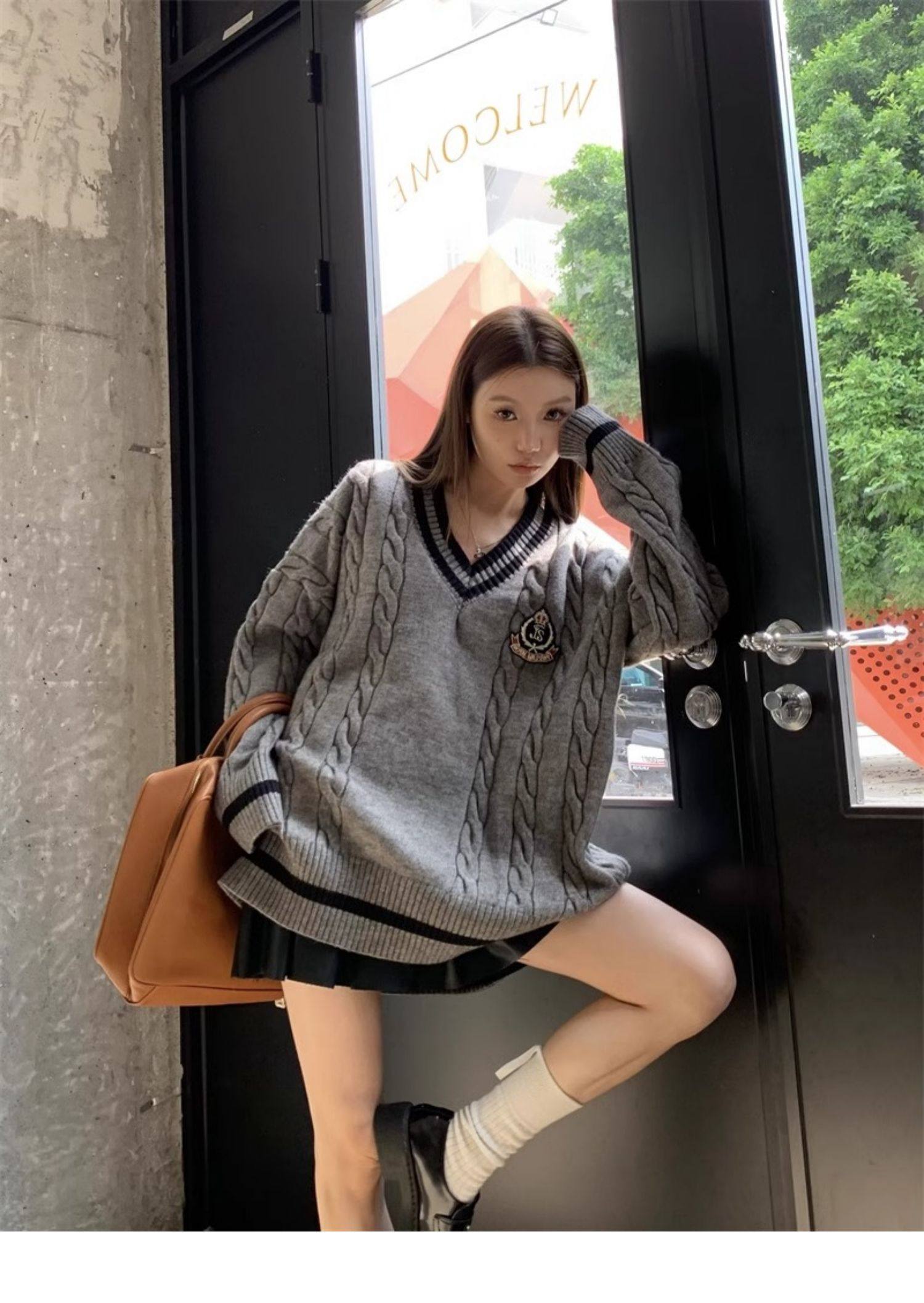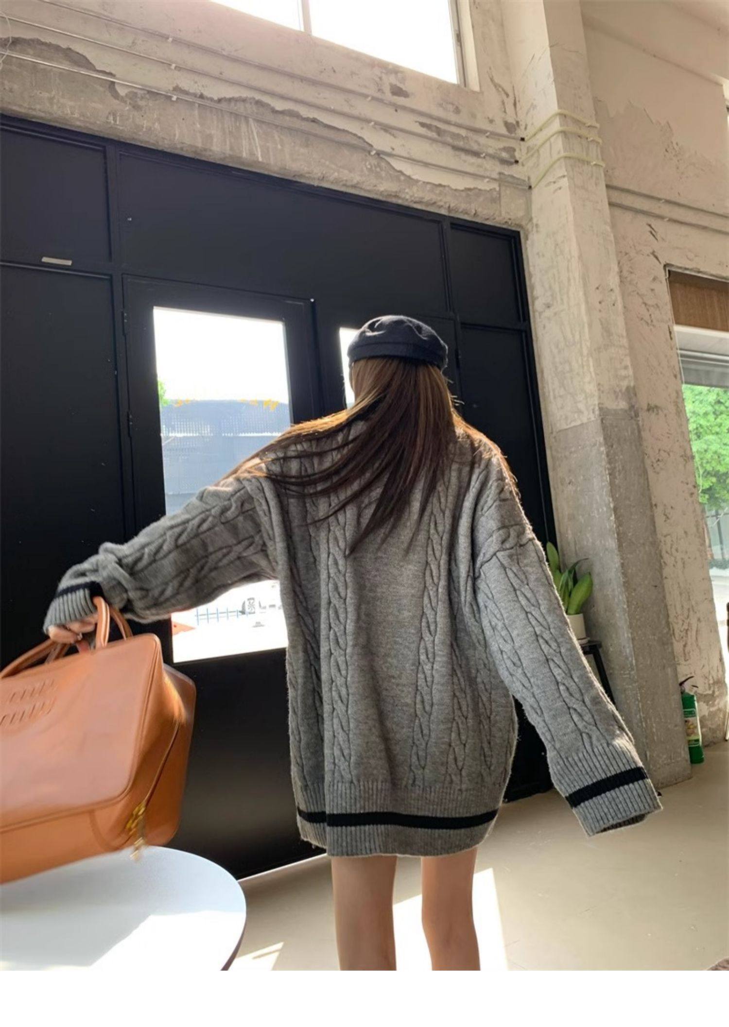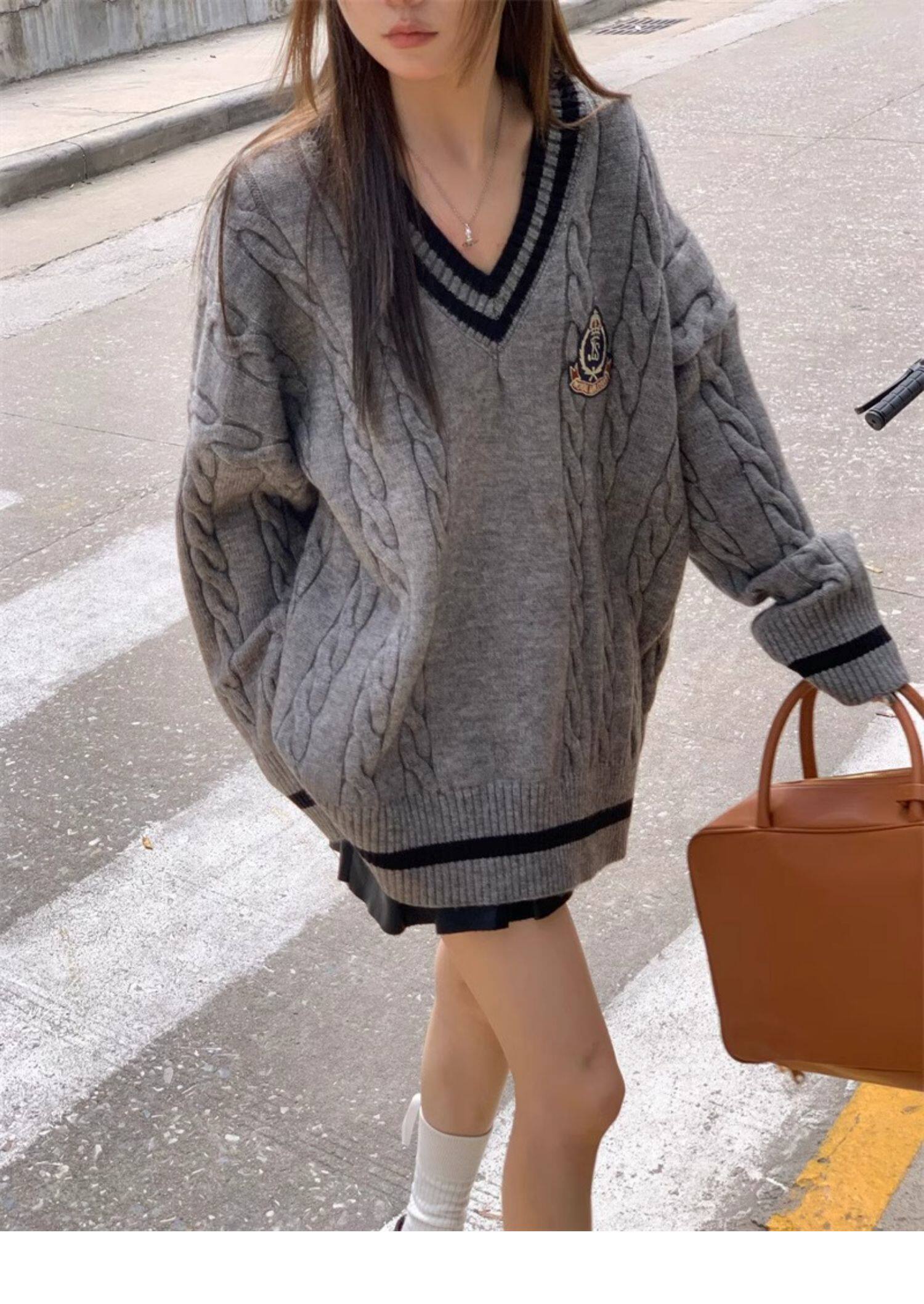 美式學院風撞色V領麻花毛衣女秋冬慵懶中長款休閒寬松顯瘦針織衫