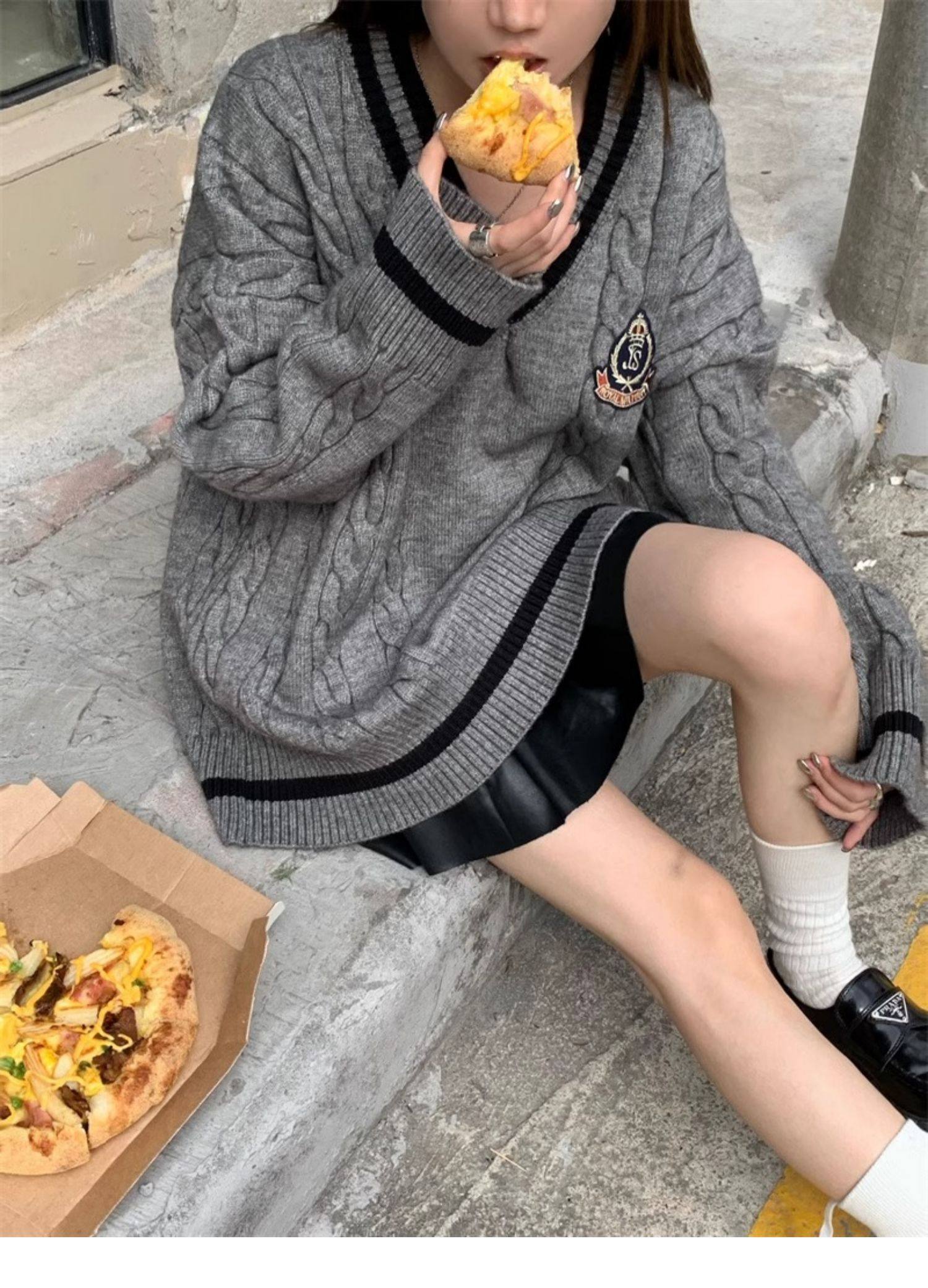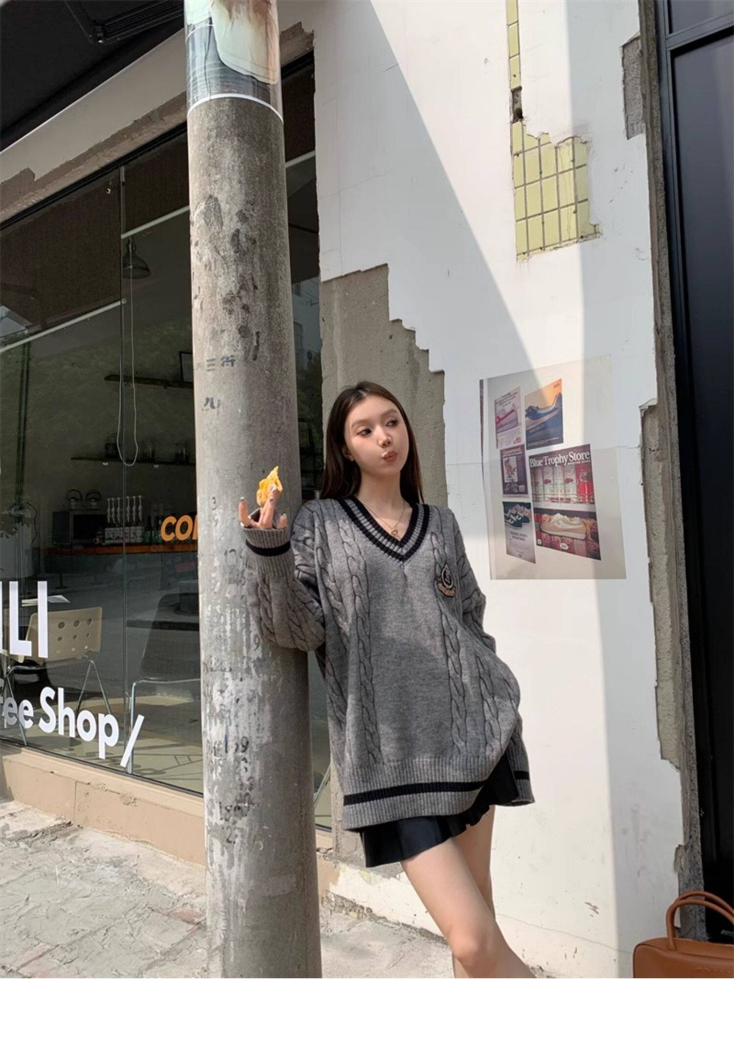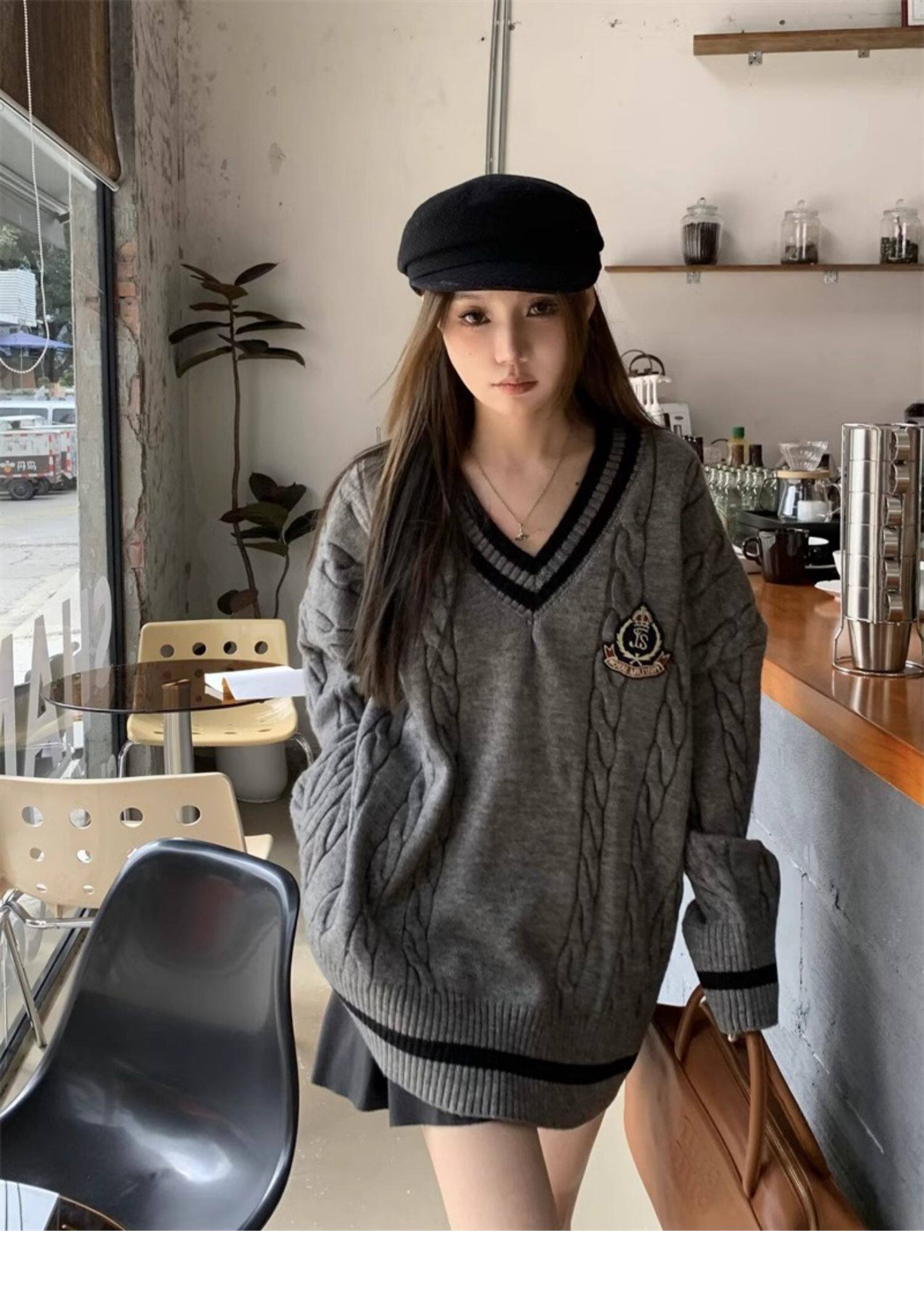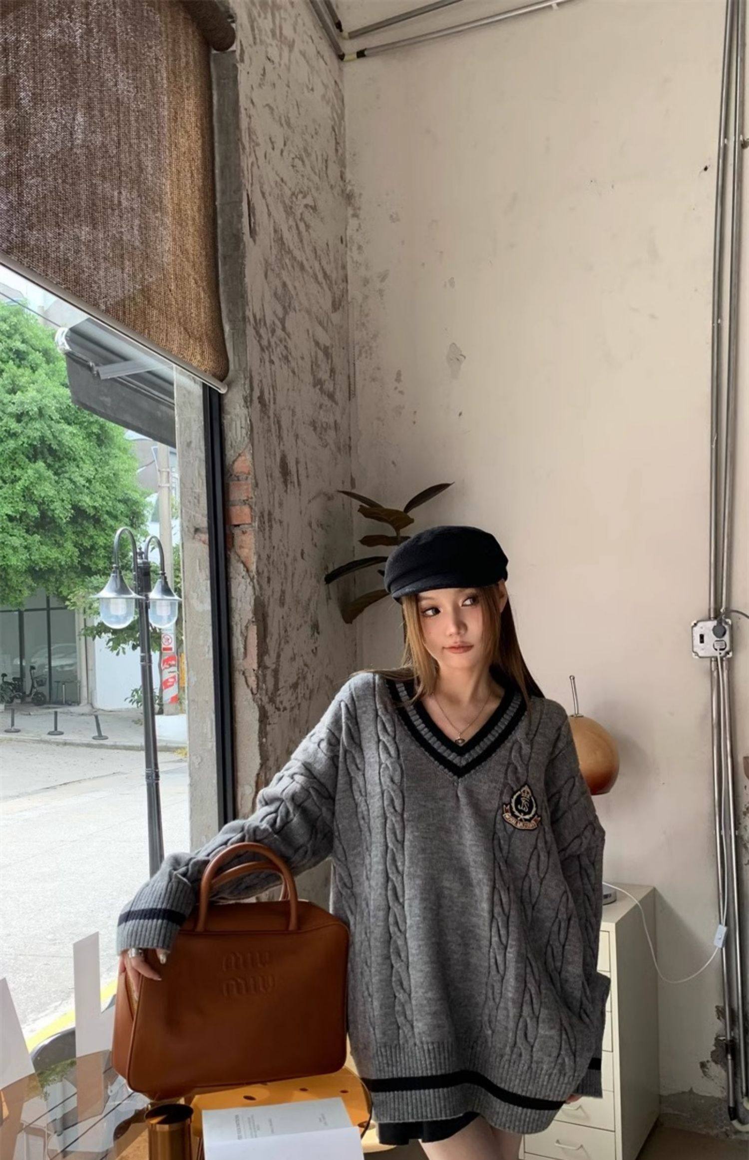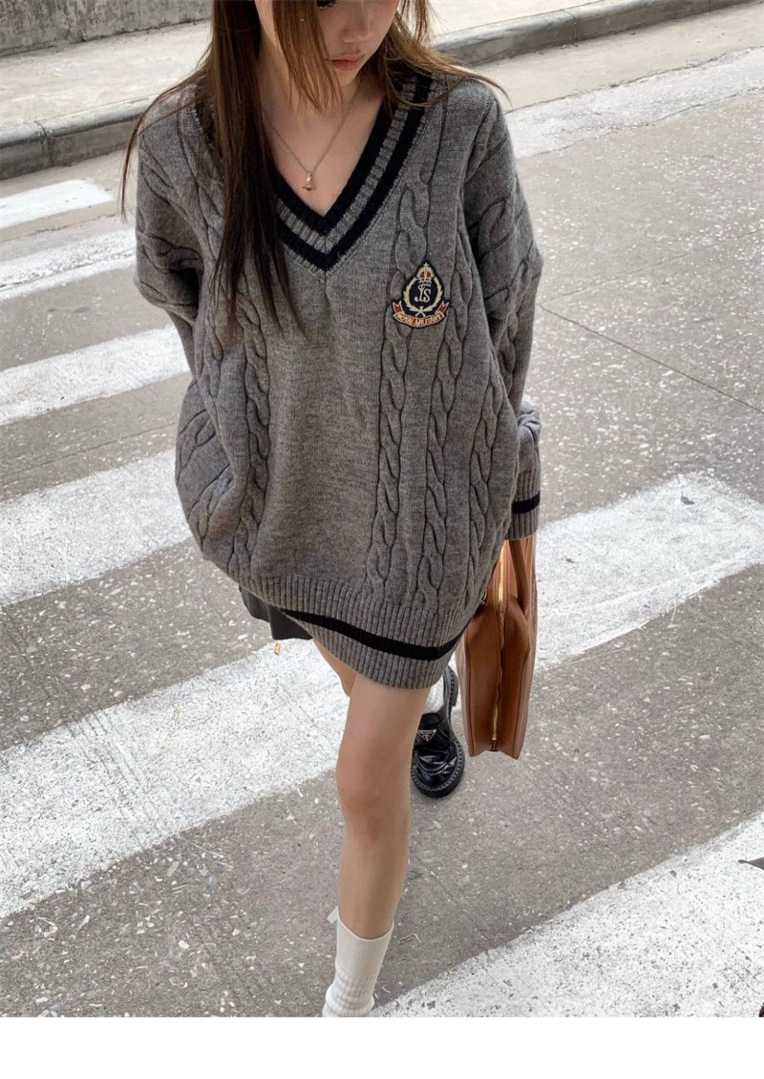 美式學院風撞色V領麻花毛衣女秋冬慵懶中長款休閒寬松顯瘦針織衫
