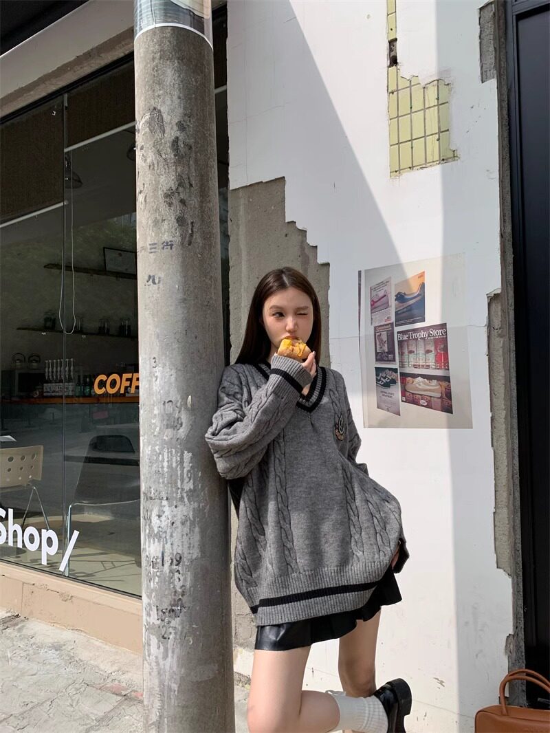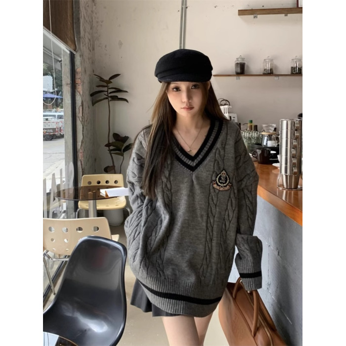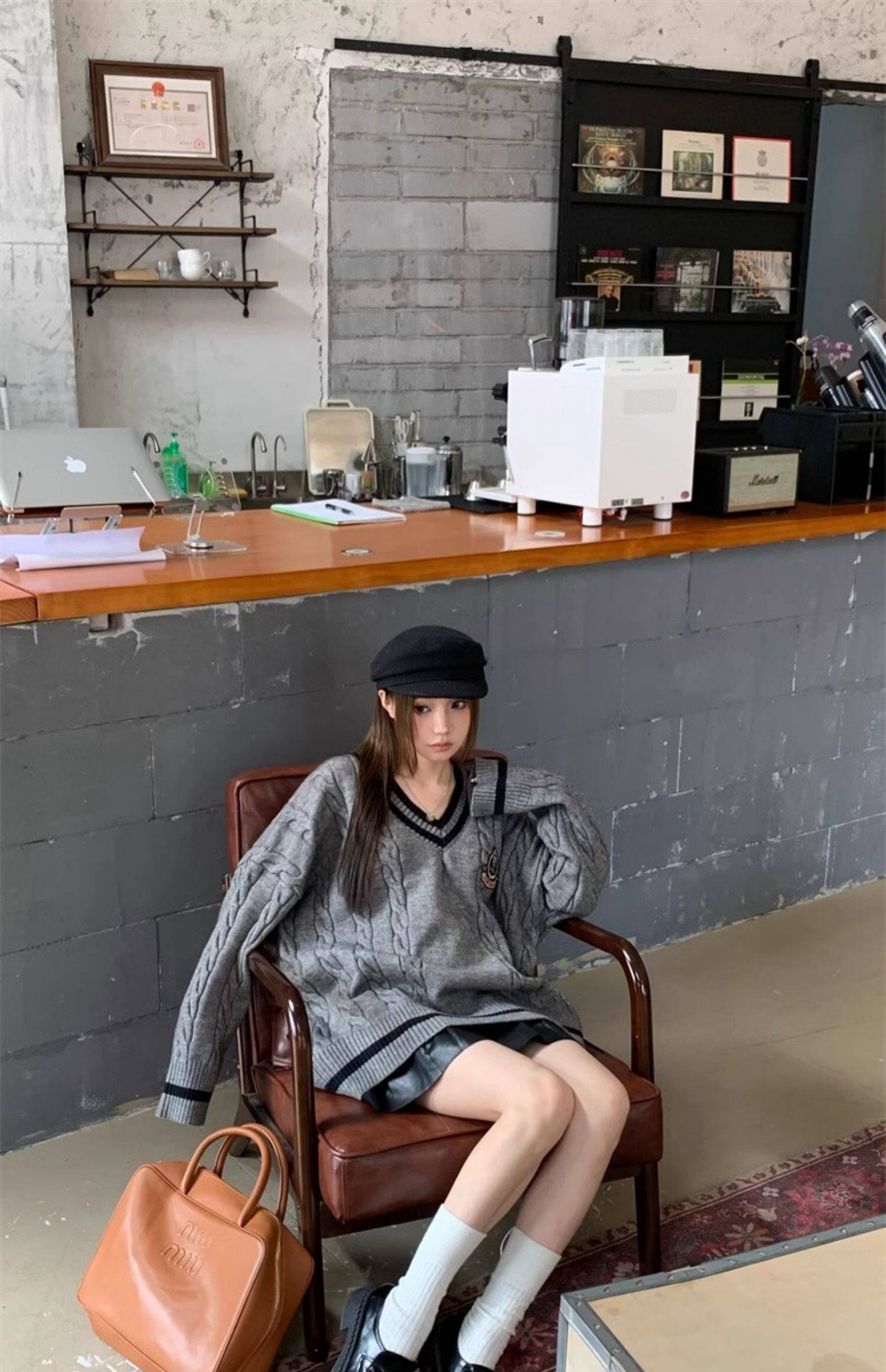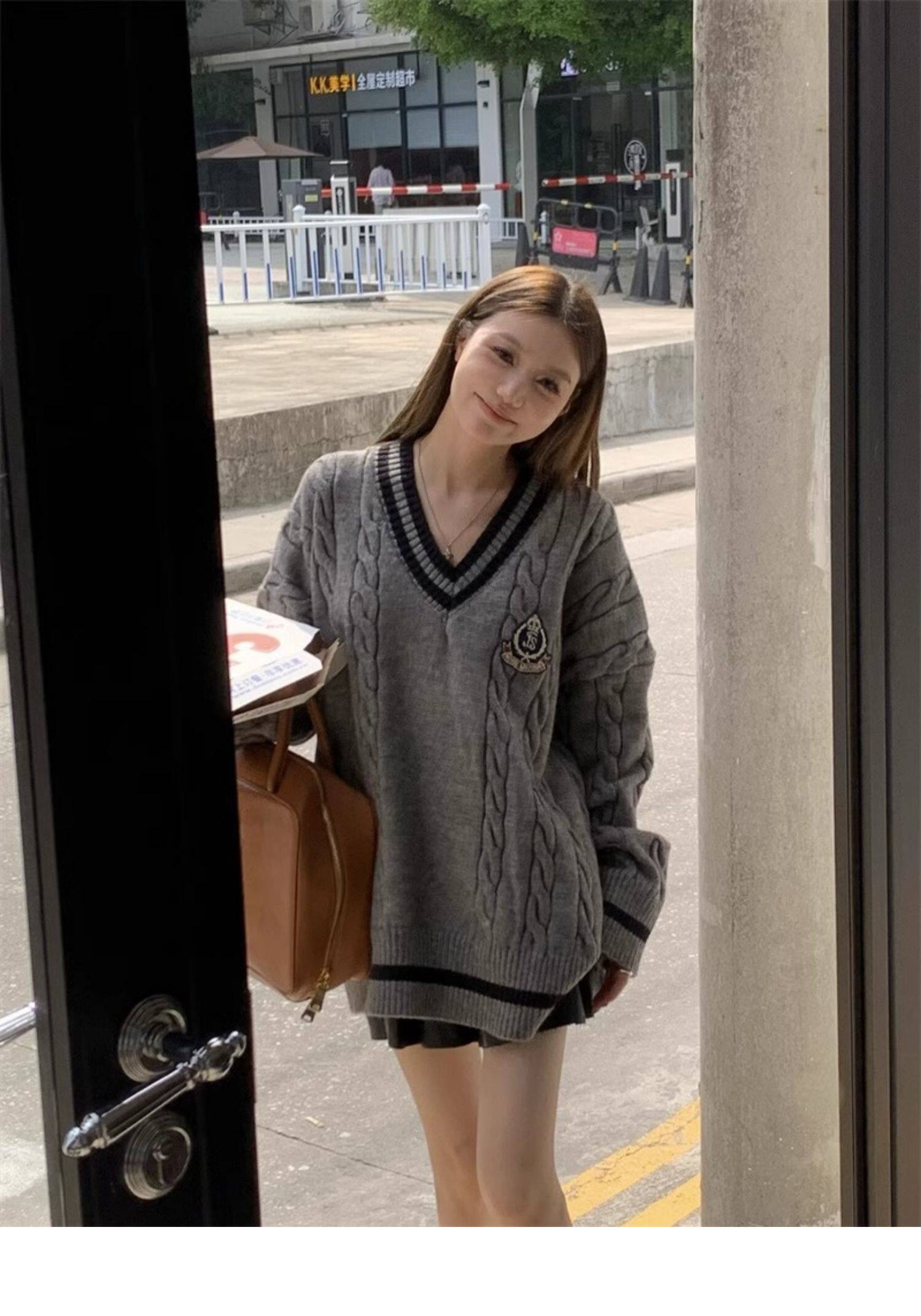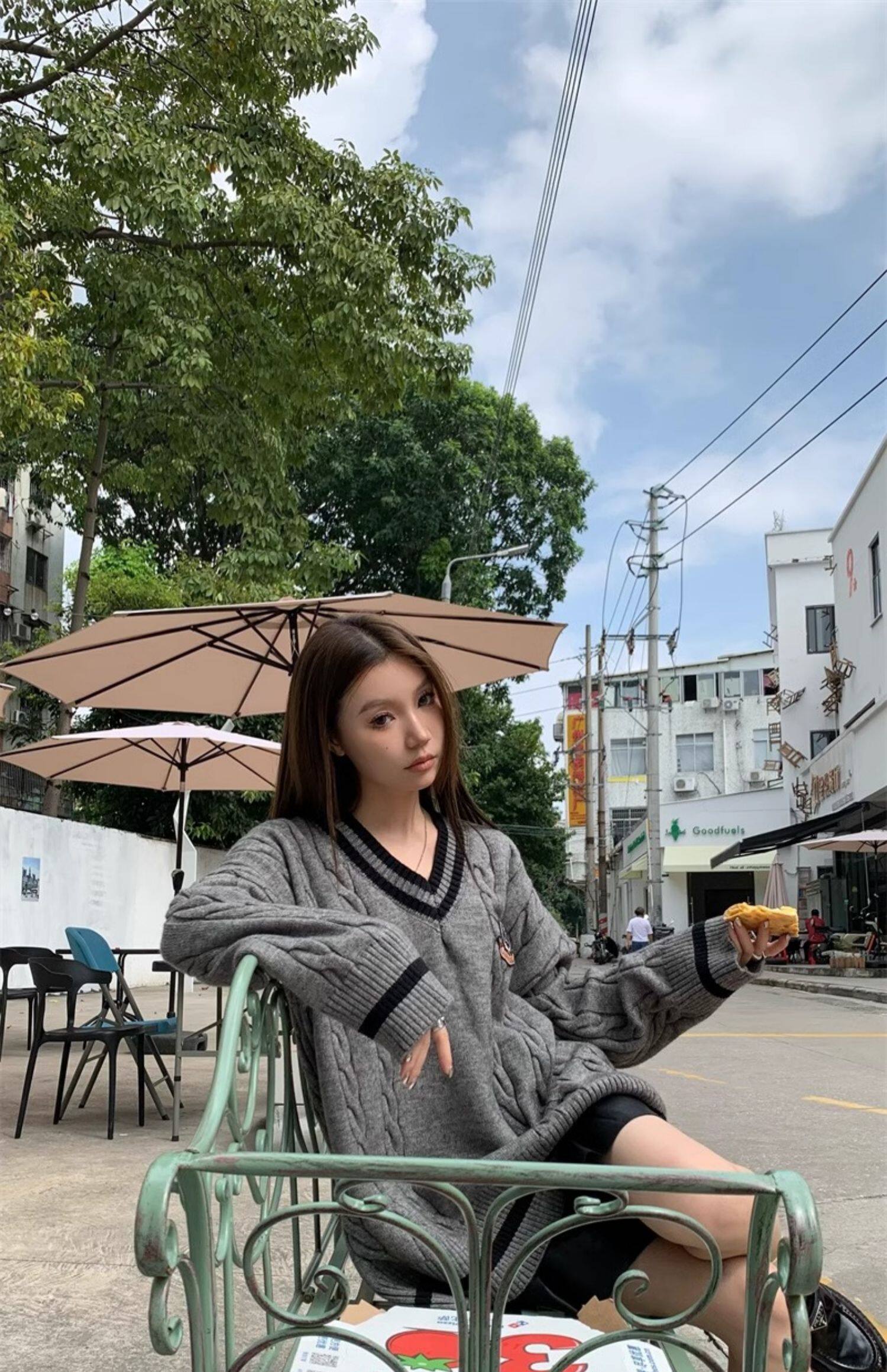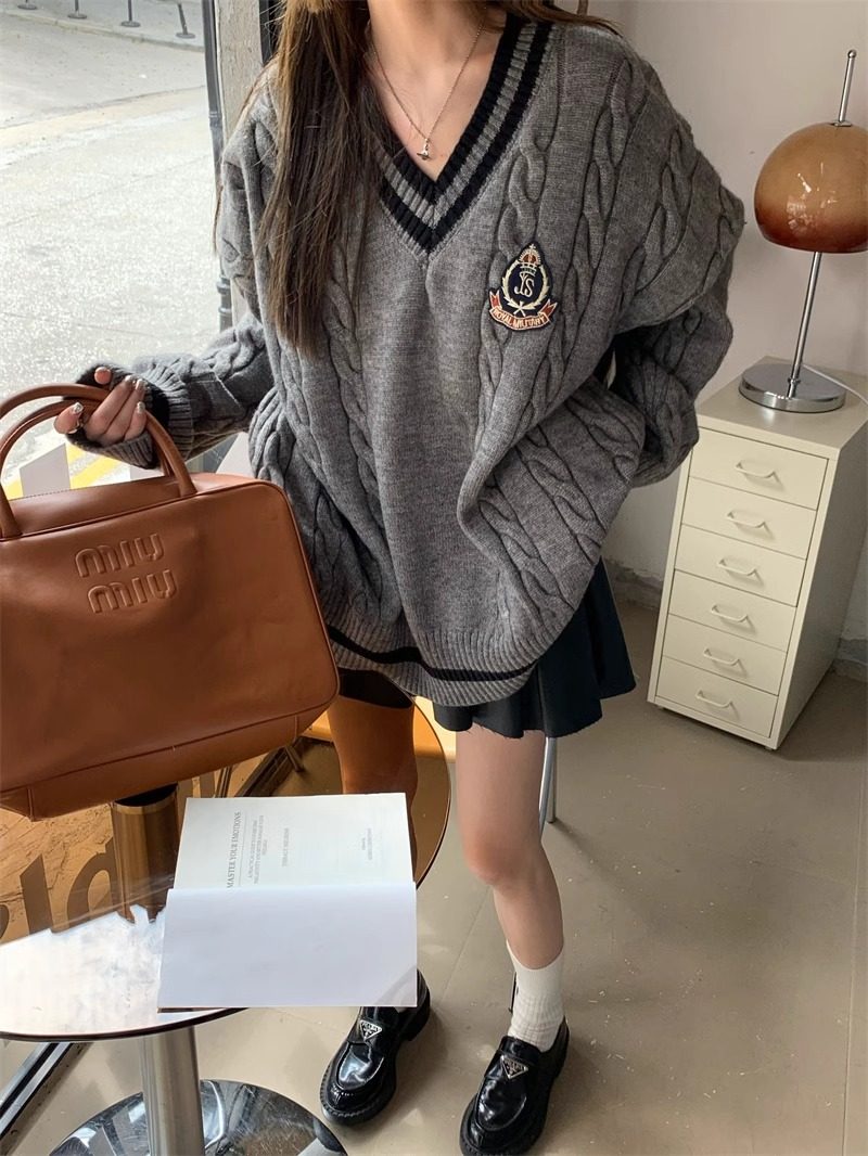 美式學院風撞色V領麻花毛衣女秋冬慵懶中長款休閒寬松顯瘦針織衫