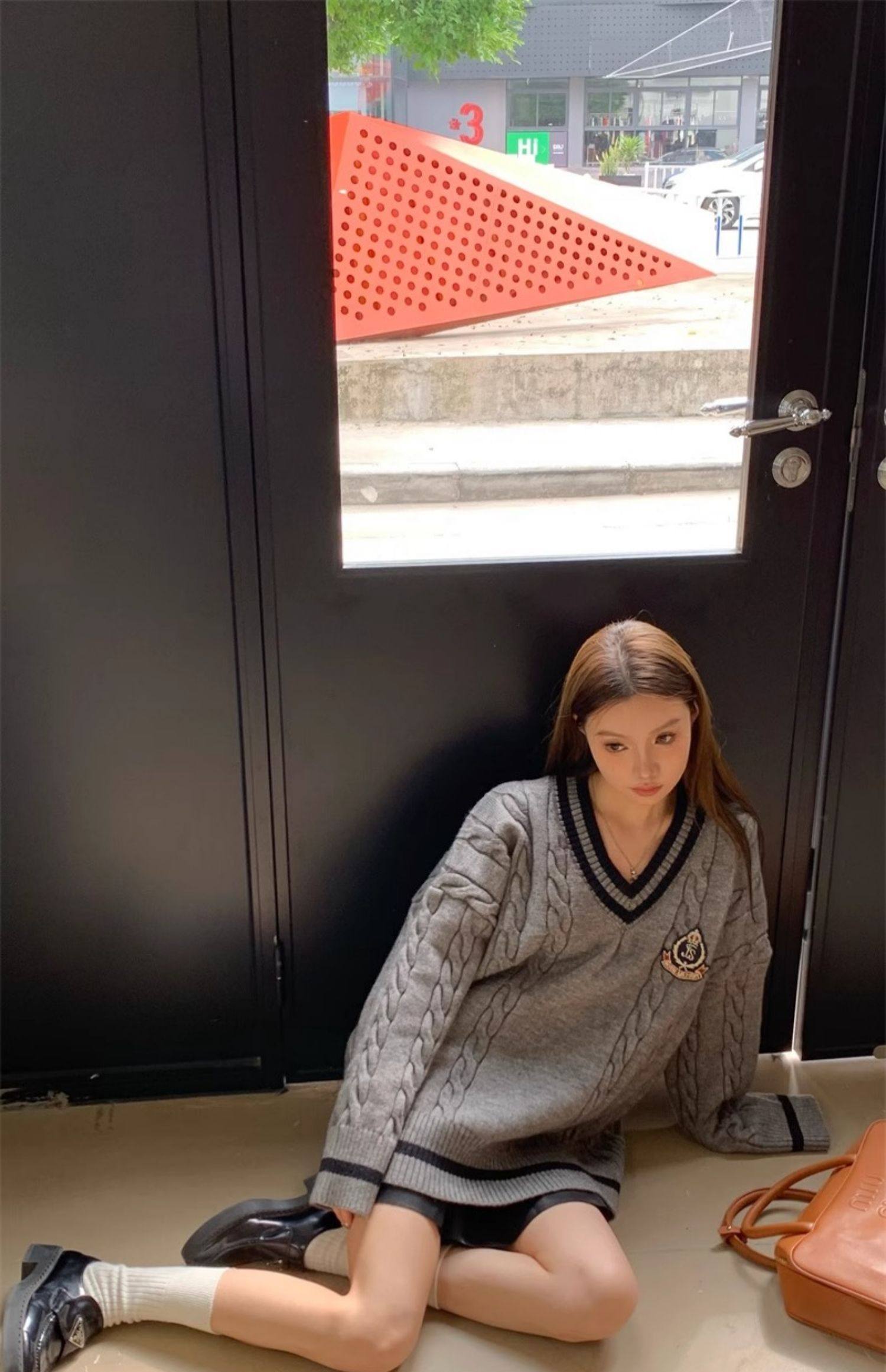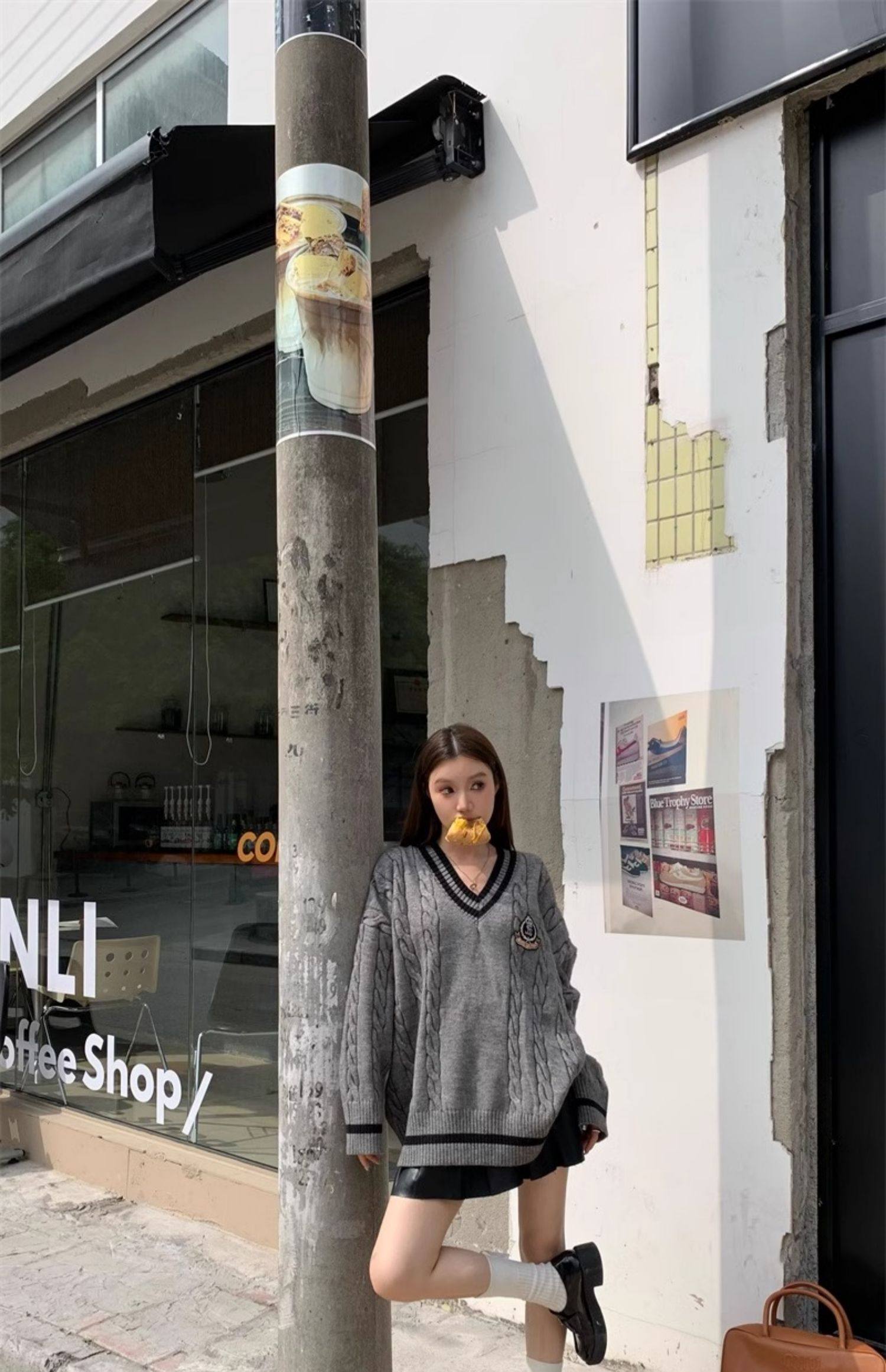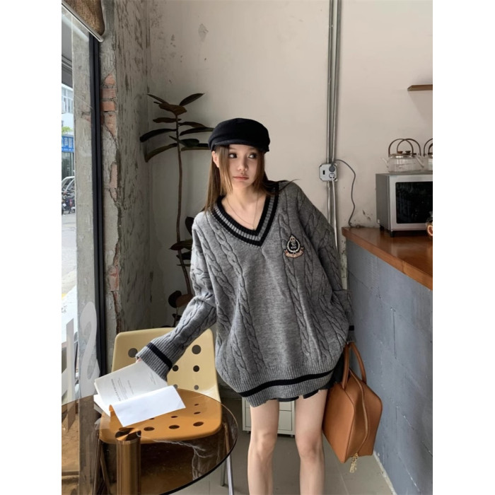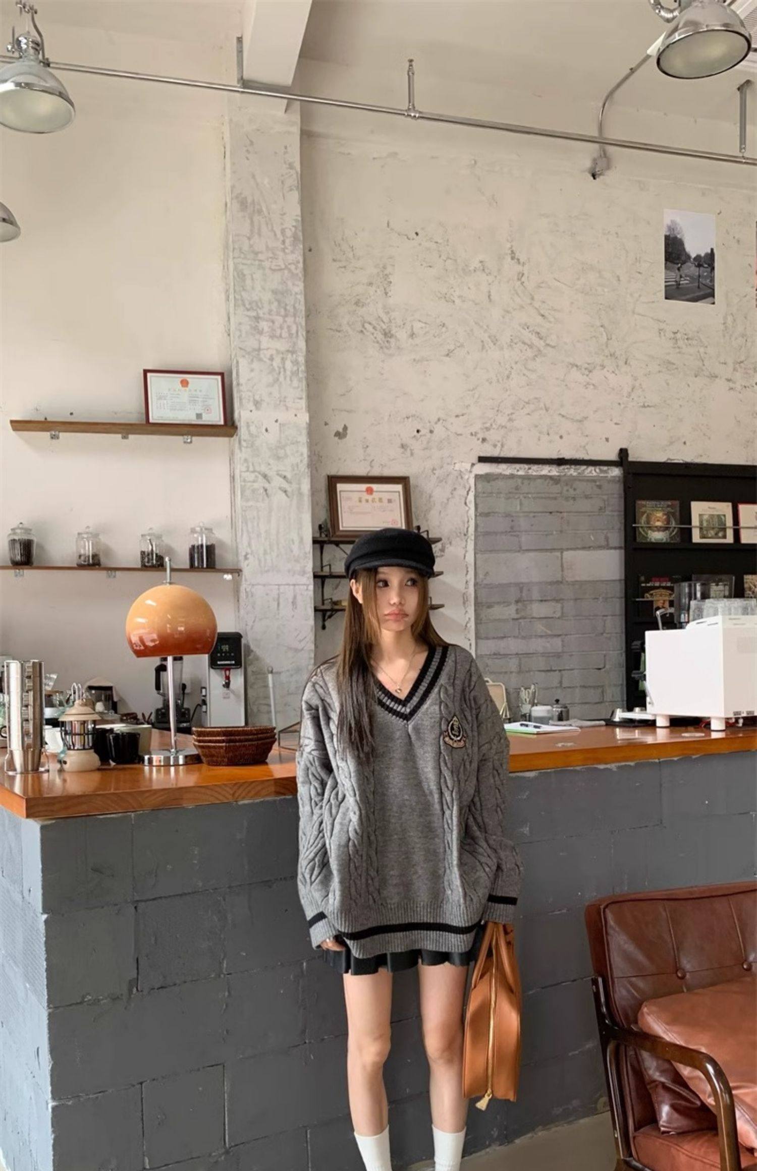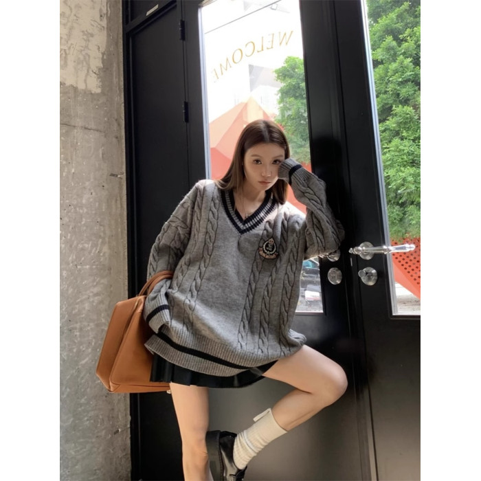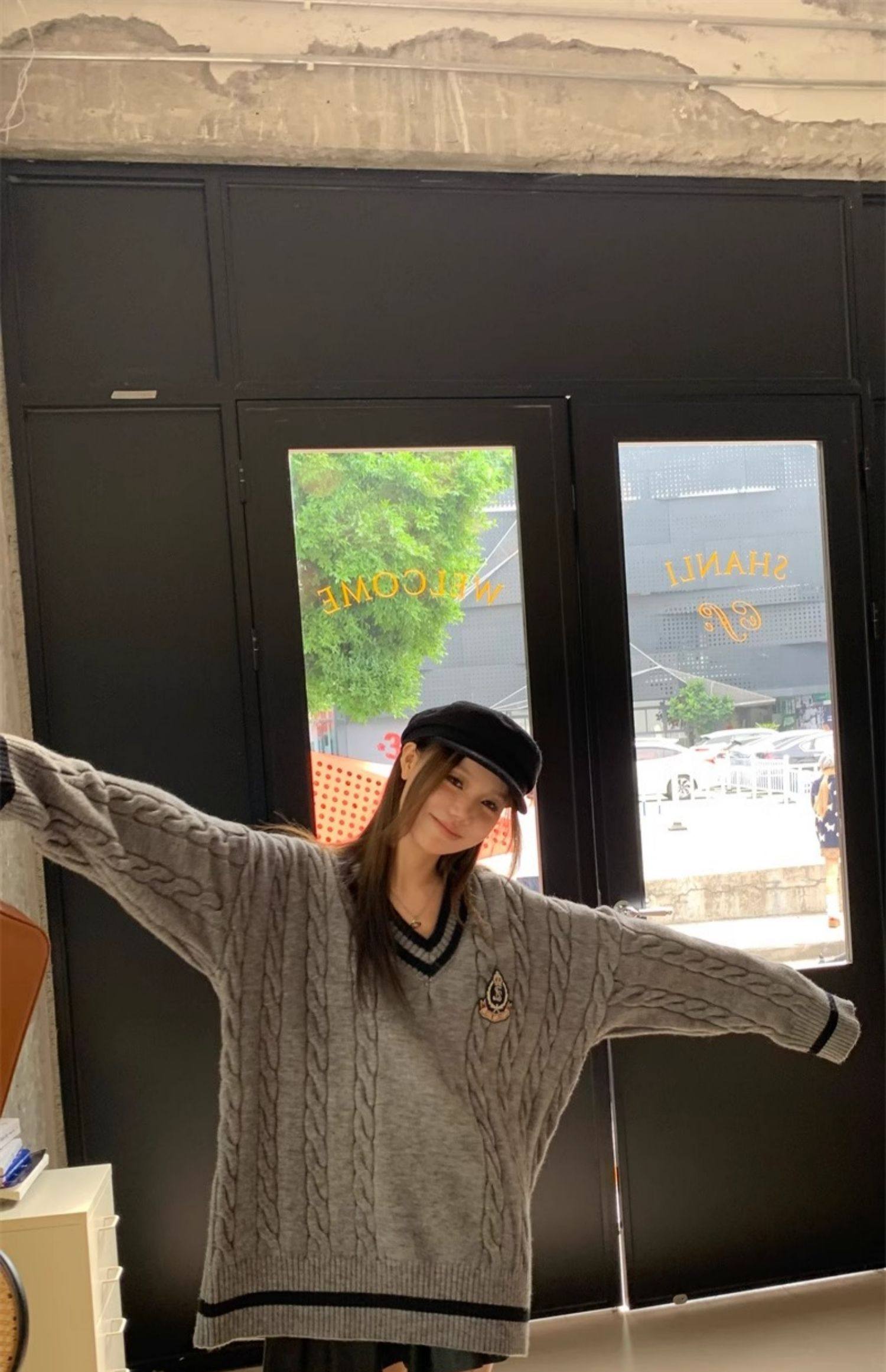 美式學院風撞色V領麻花毛衣女秋冬慵懶中長款休閒寬松顯瘦針織衫