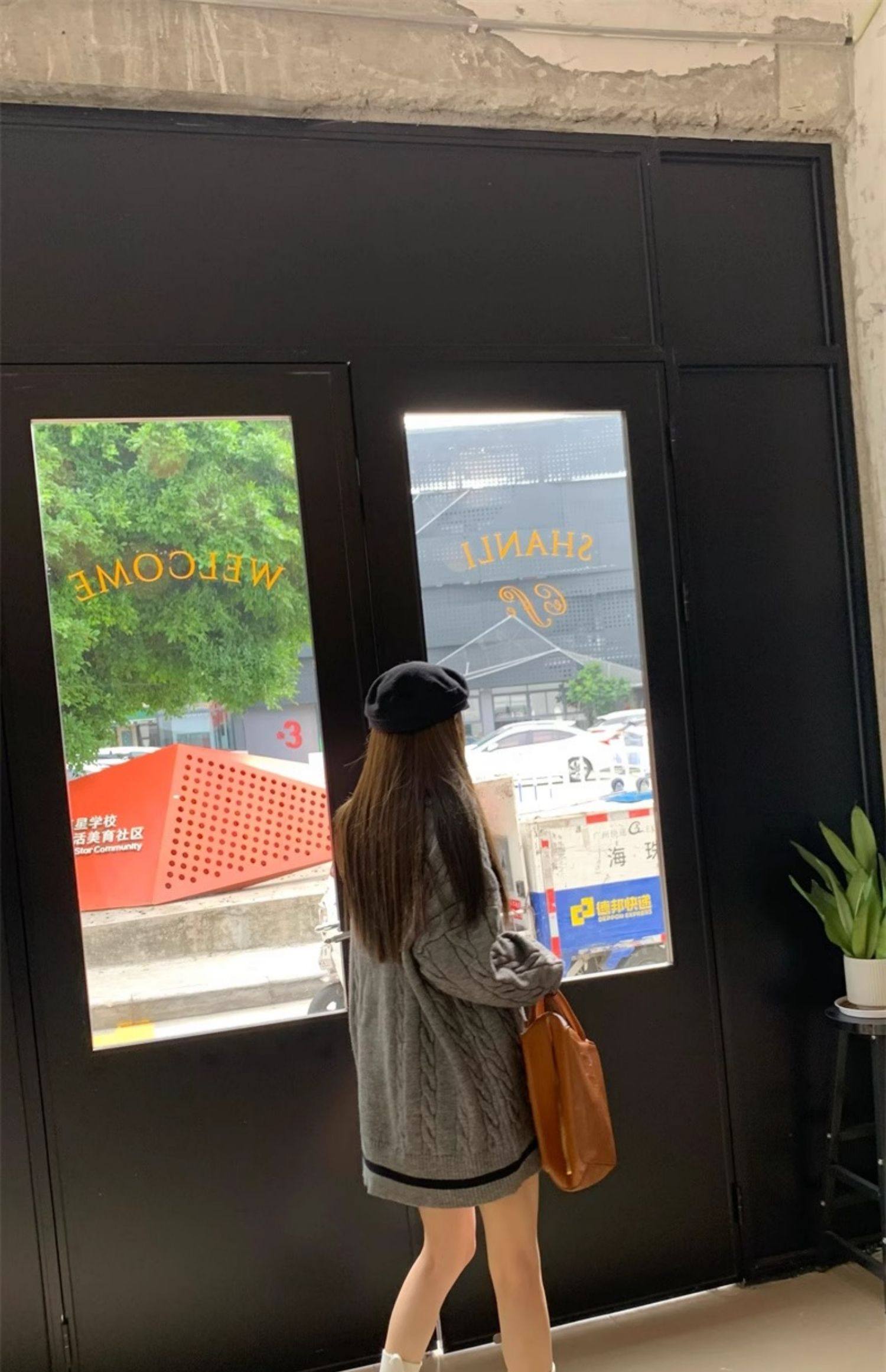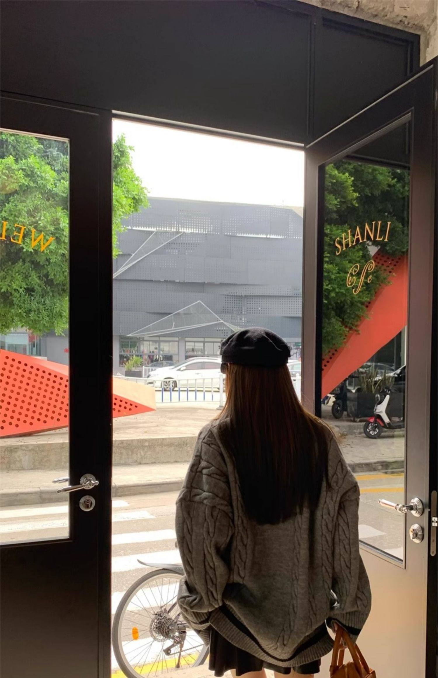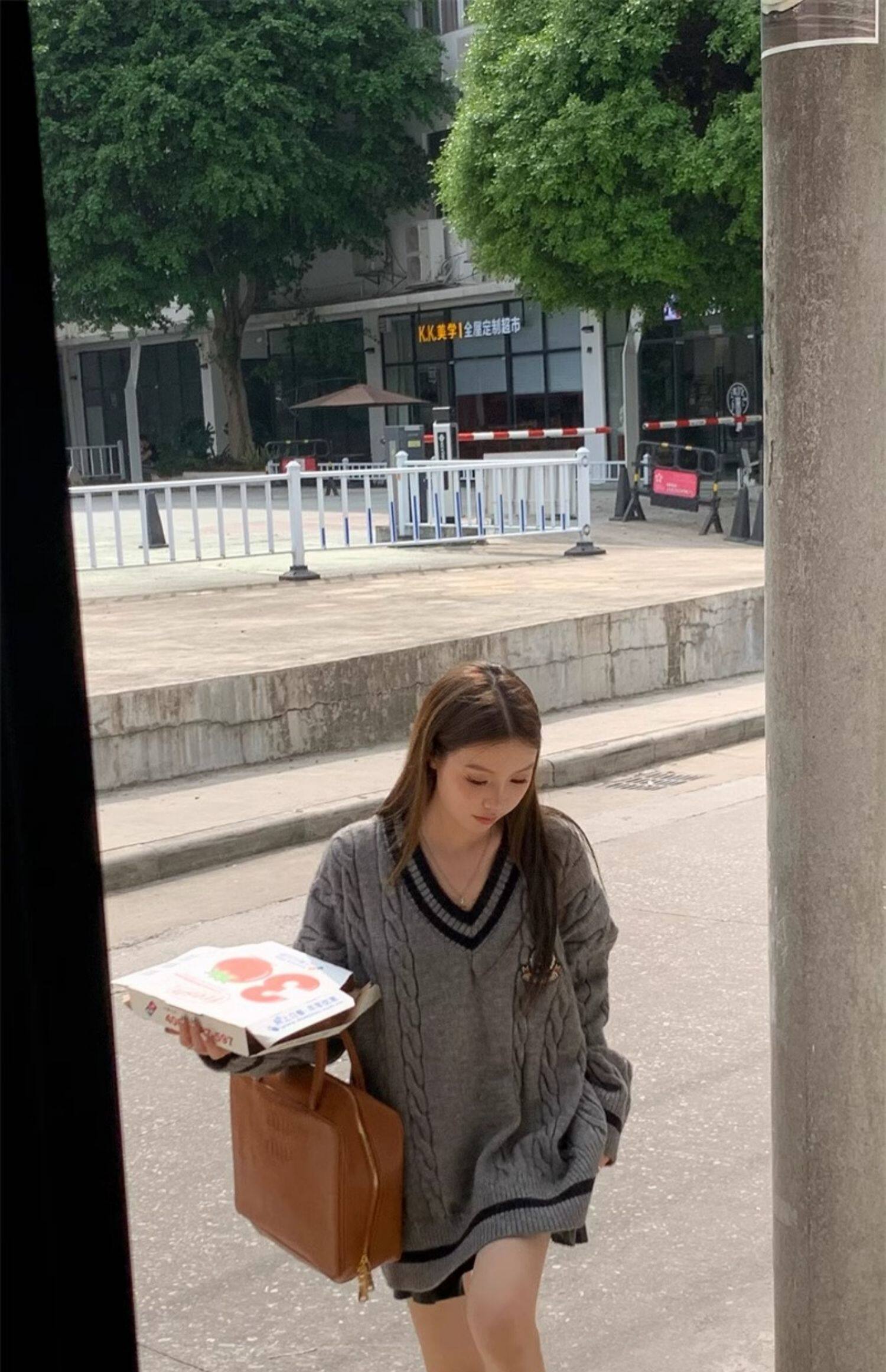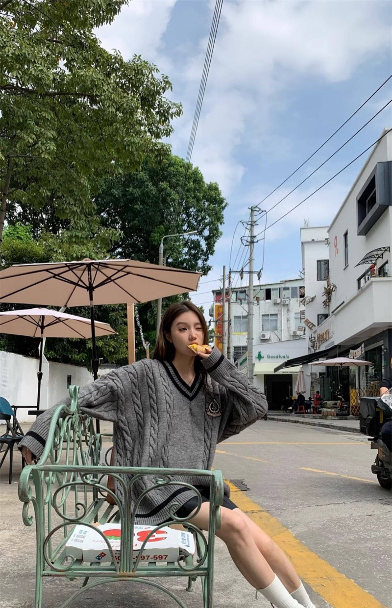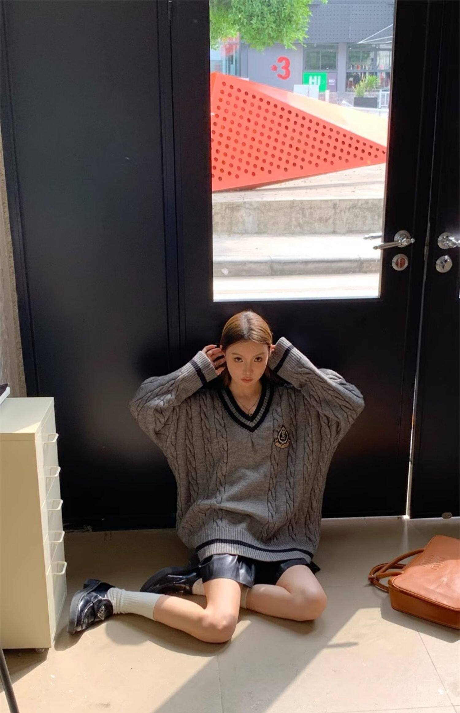 美式學院風撞色V領麻花毛衣女秋冬慵懶中長款休閒寬松顯瘦針織衫