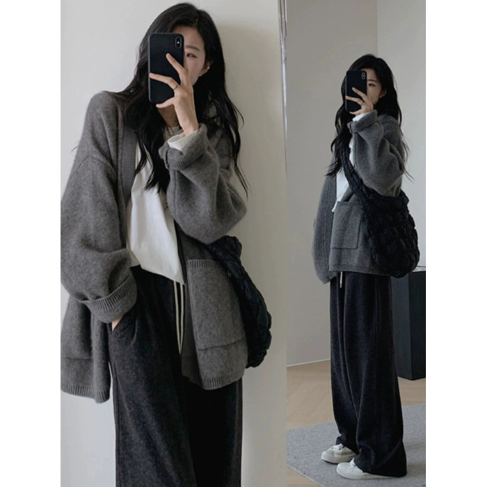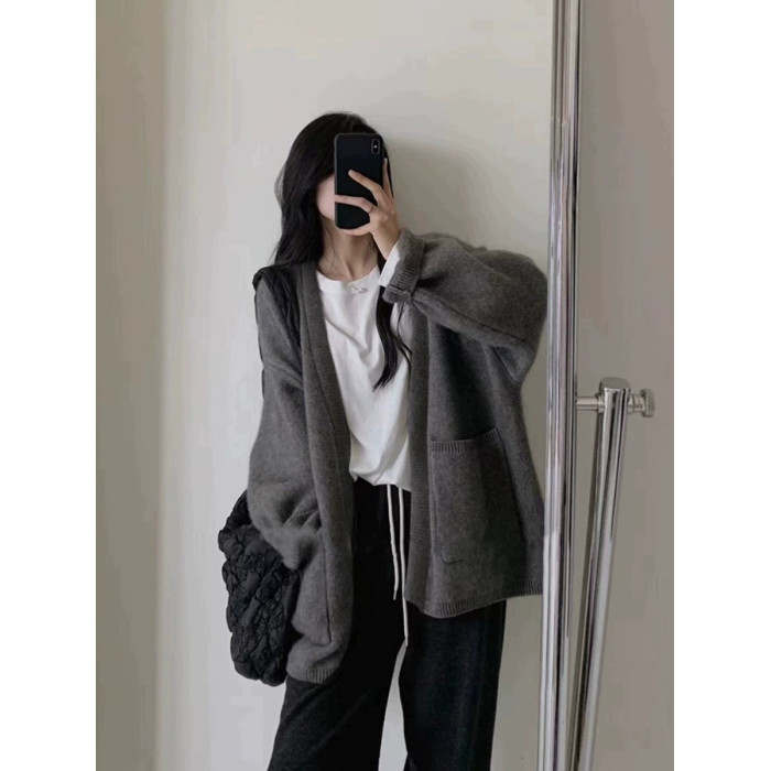 灰色浣熊絨中長款毛衣外套女秋冬寬松慵懶風羊毛針織開衫外搭外穿