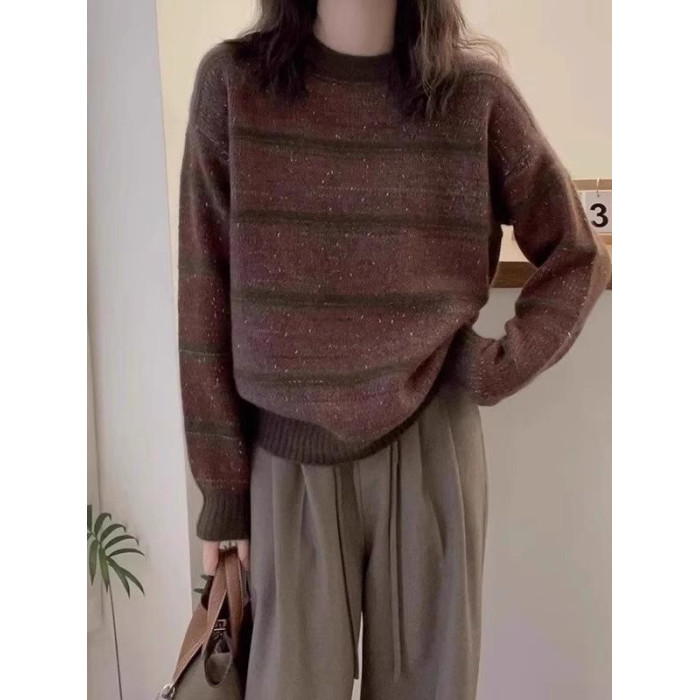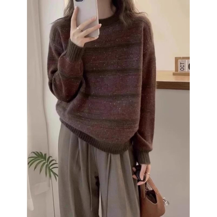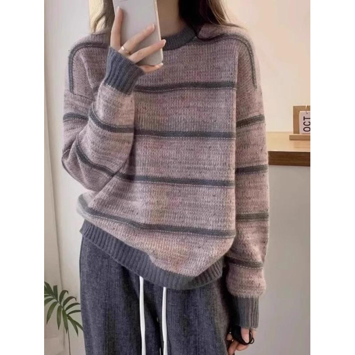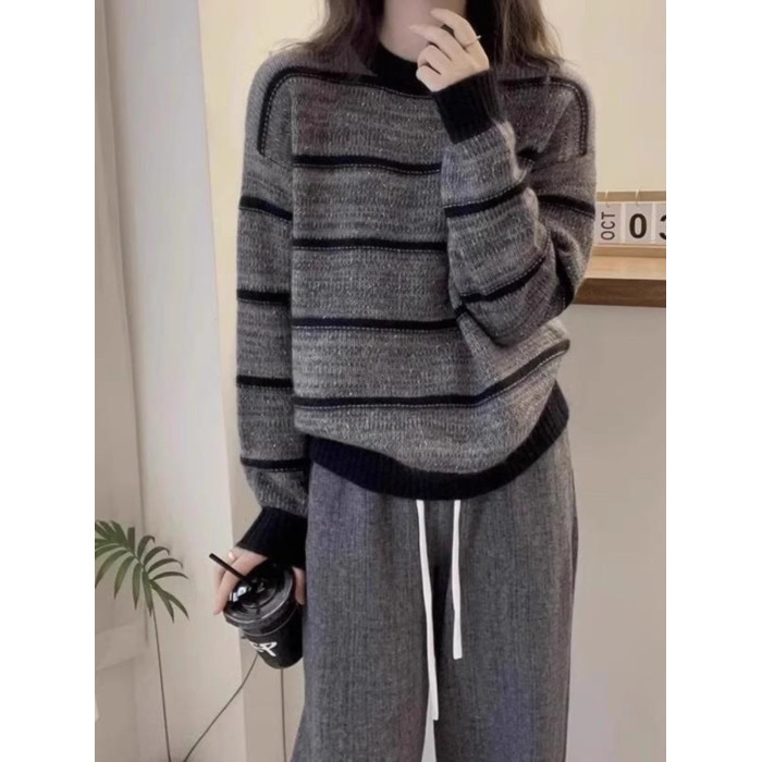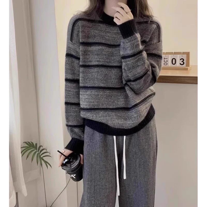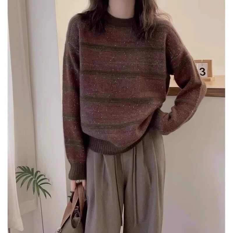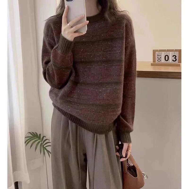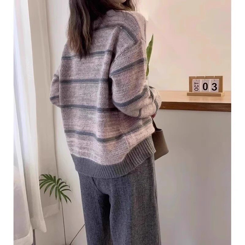 大碼胖mm復古減齡條紋針織衫女秋季新款顯瘦慵懶風軟糯毛衣打底衫