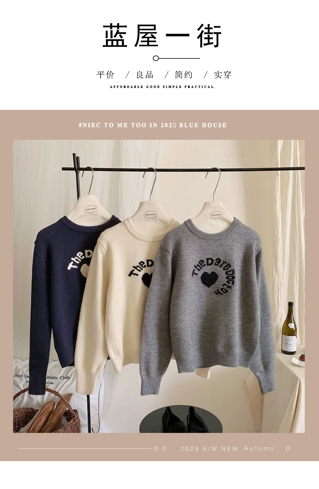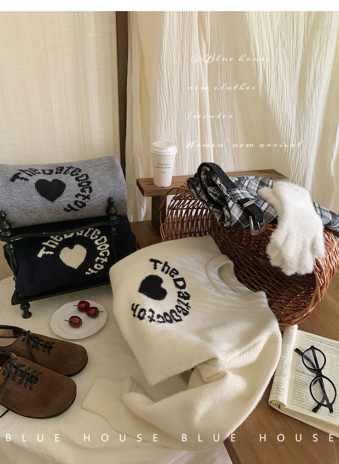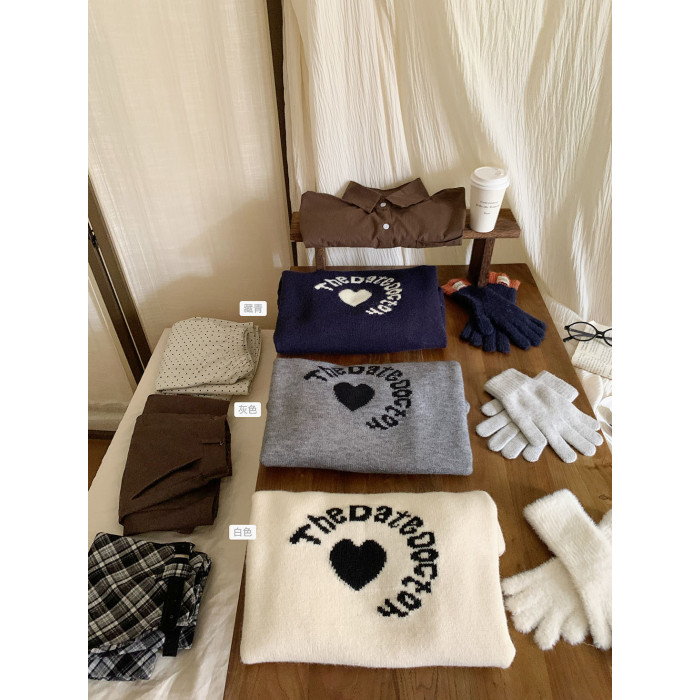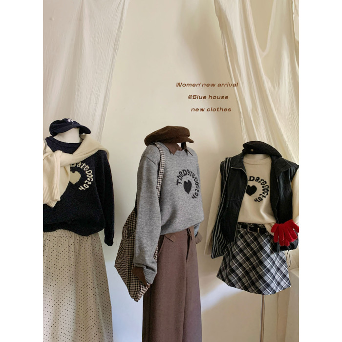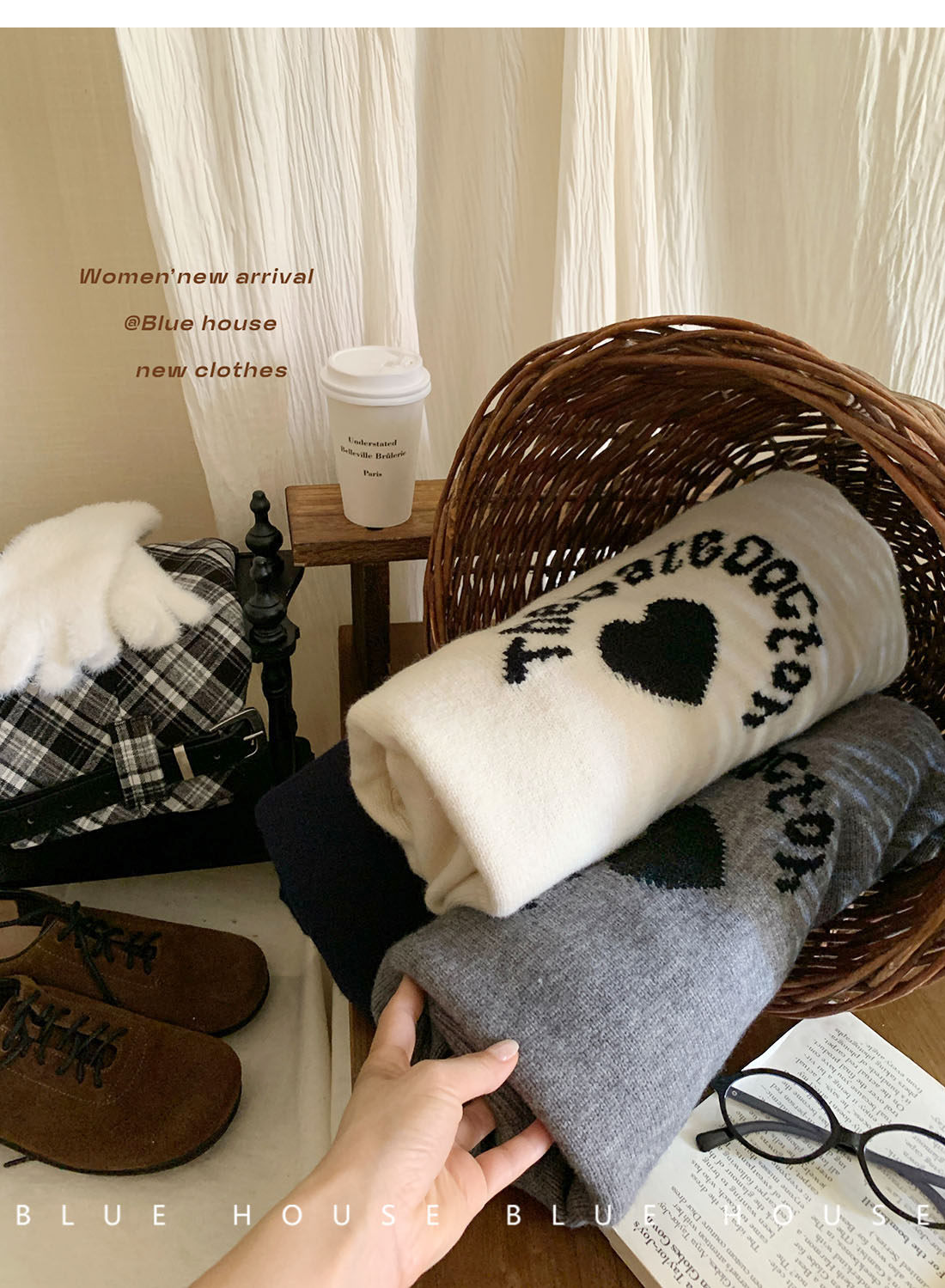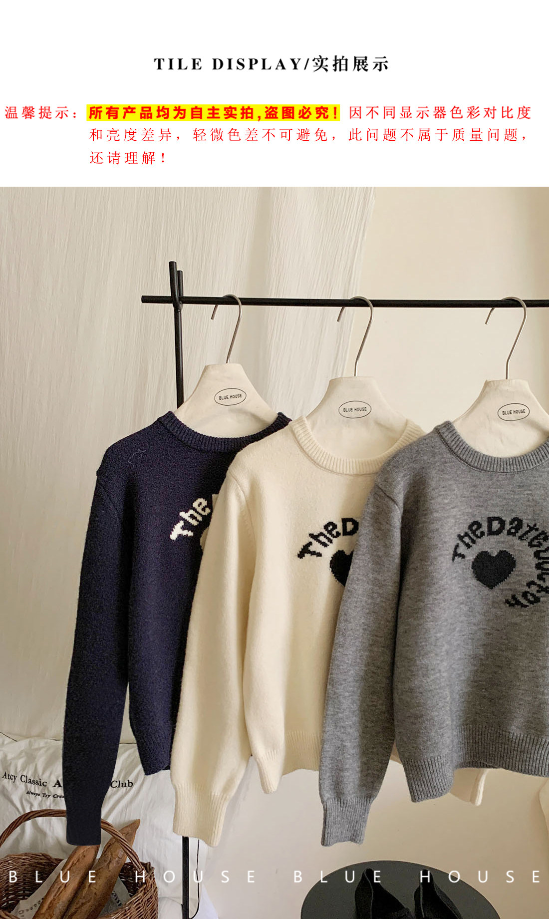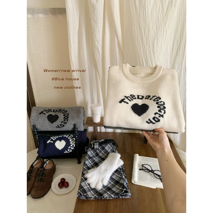 韓系簡約愛心字母提花針織上衣女秋冬季復古寬松外穿內搭套頭毛衣