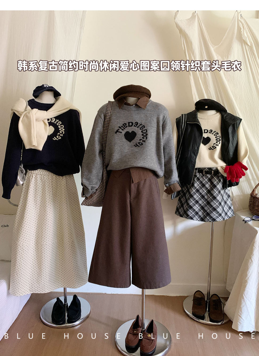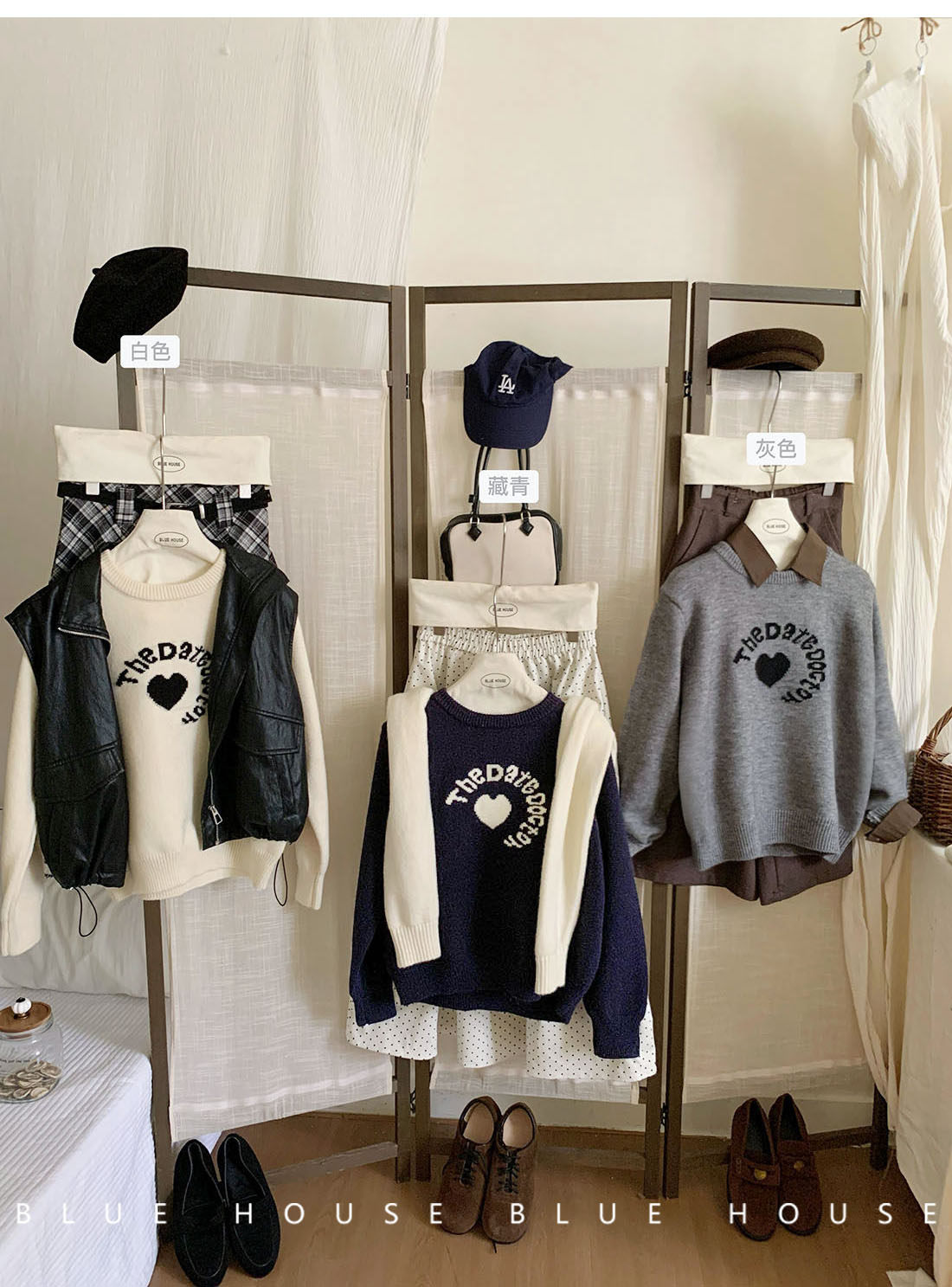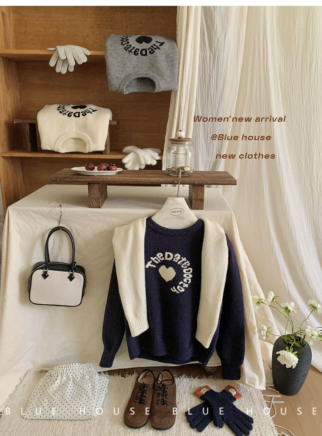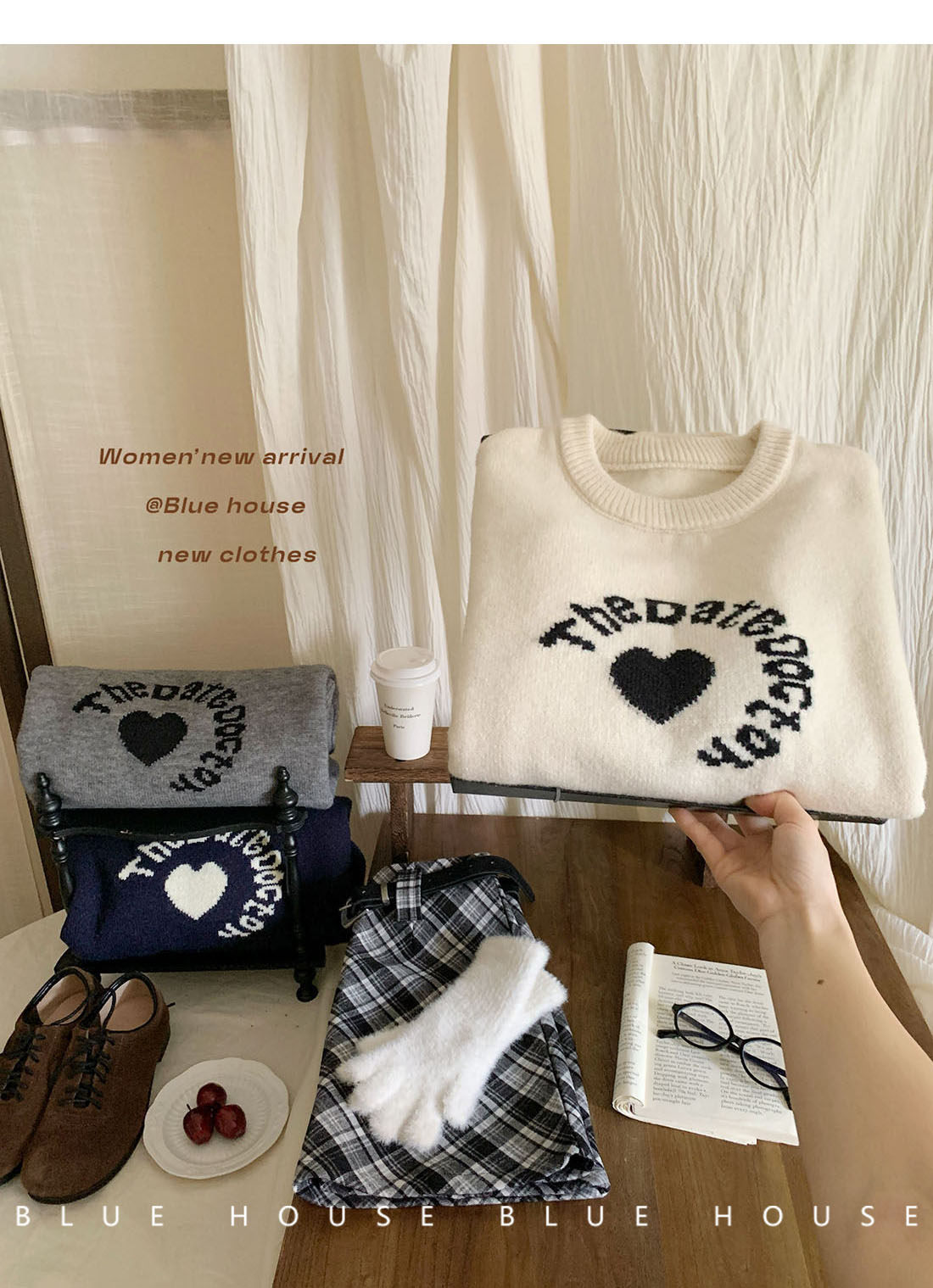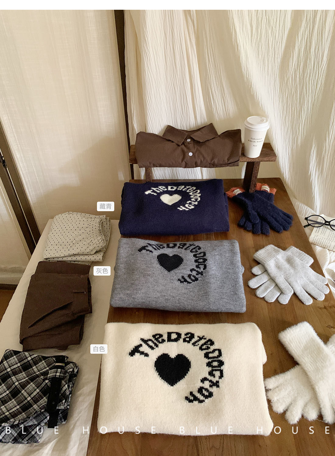 韓系簡約愛心字母提花針織上衣女秋冬季復古寬松外穿內搭套頭毛衣