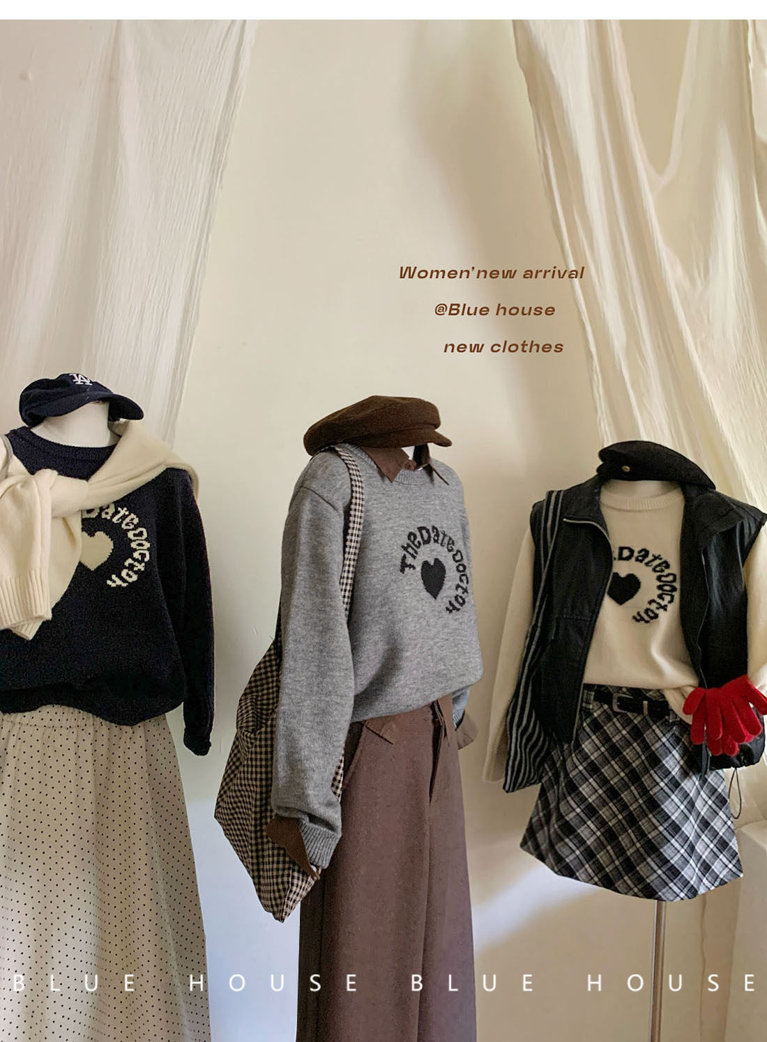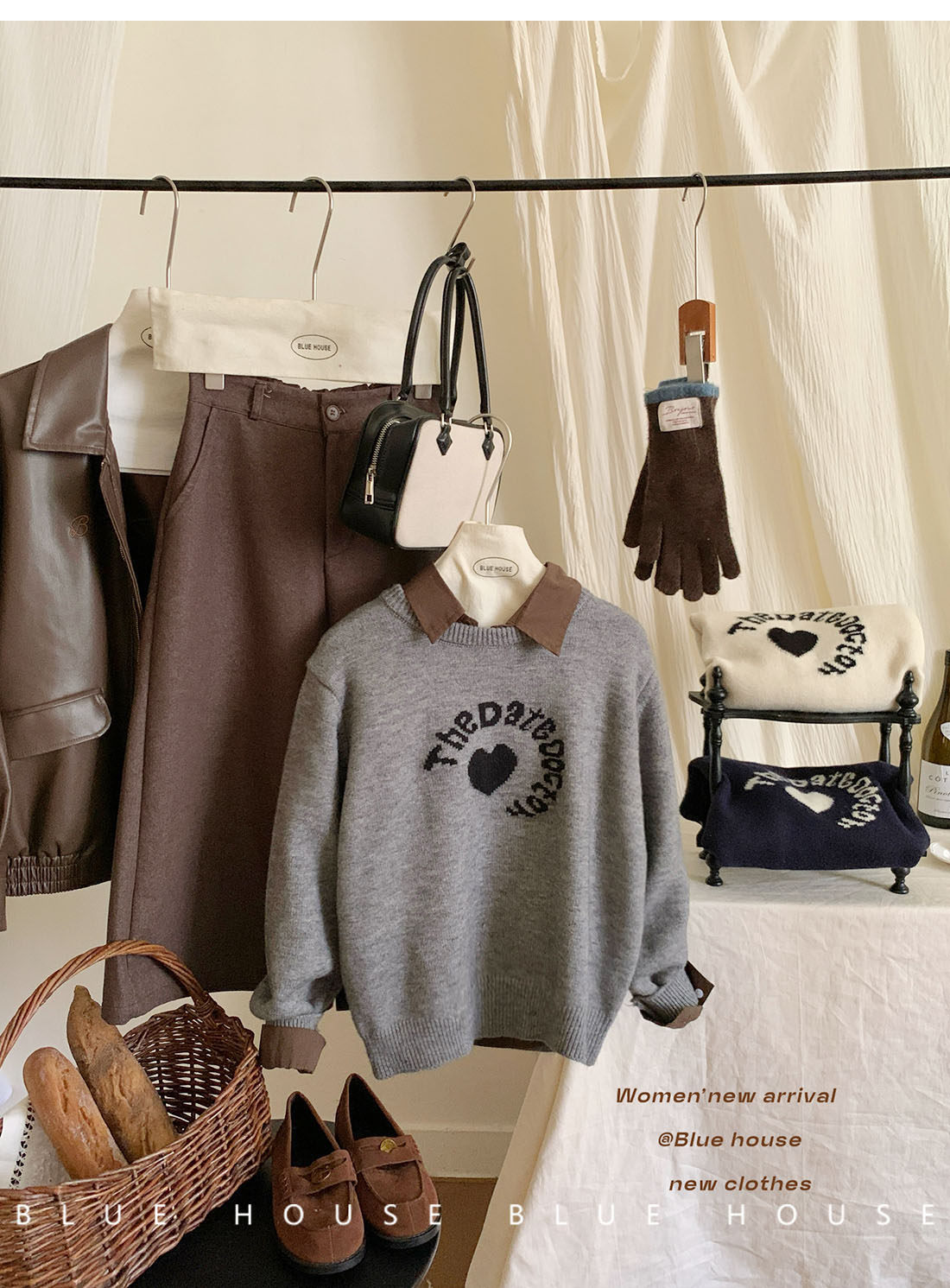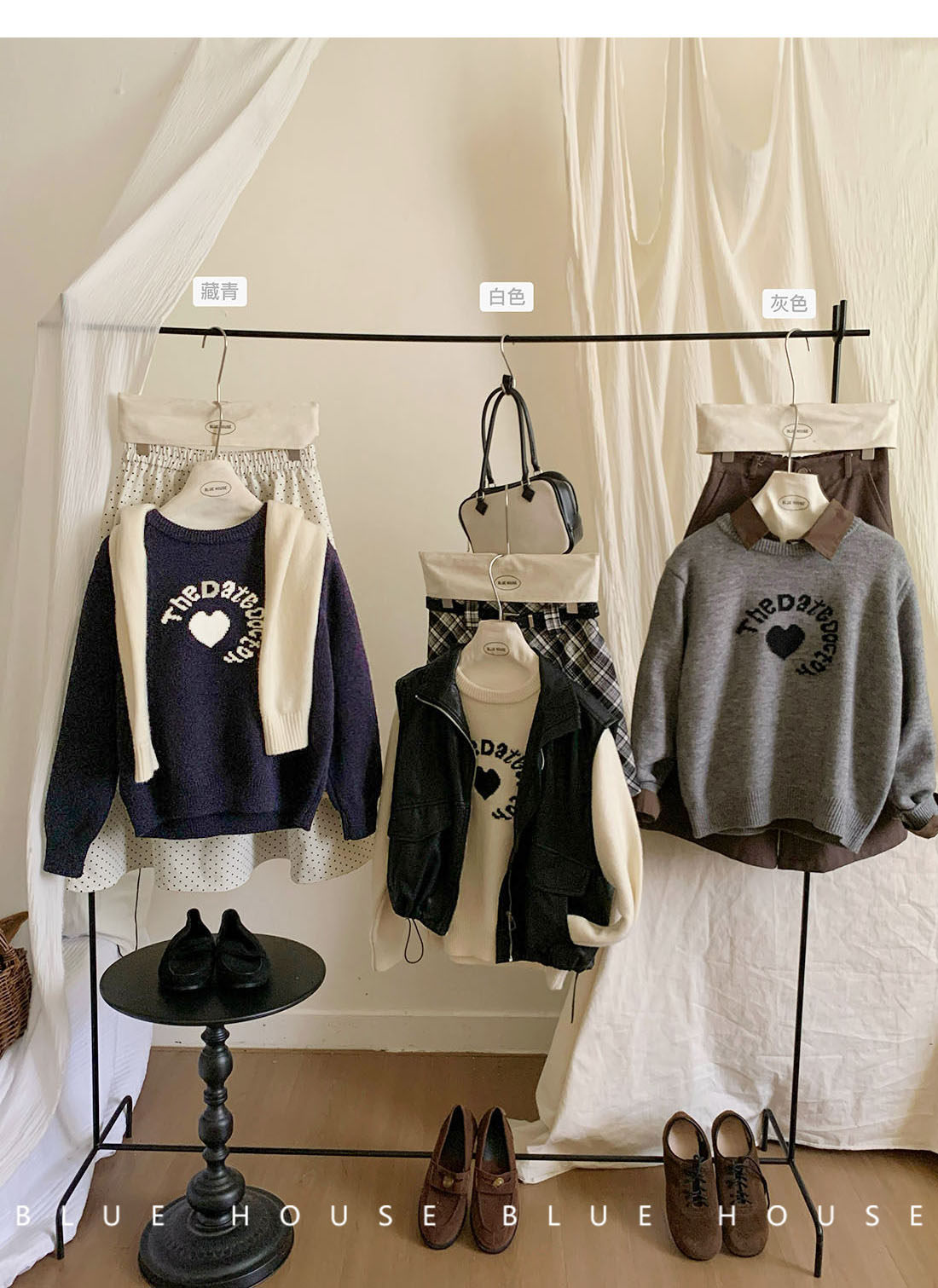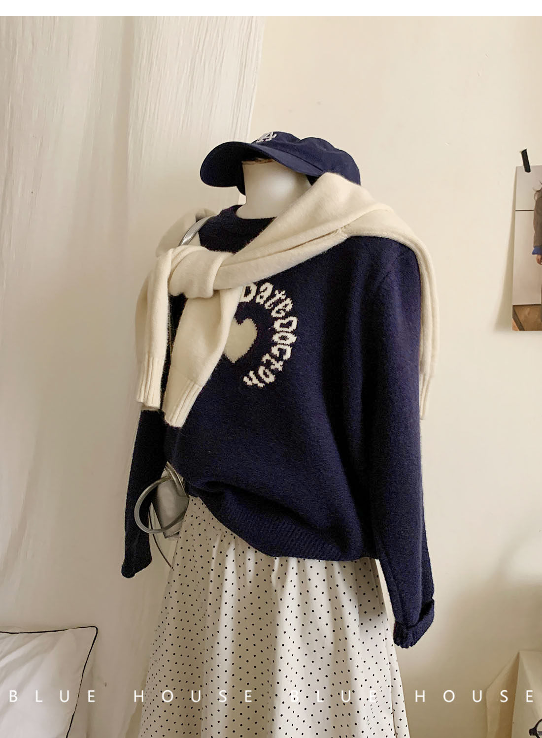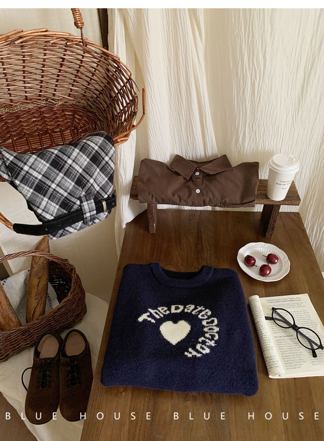 韓系簡約愛心字母提花針織上衣女秋冬季復古寬松外穿內搭套頭毛衣