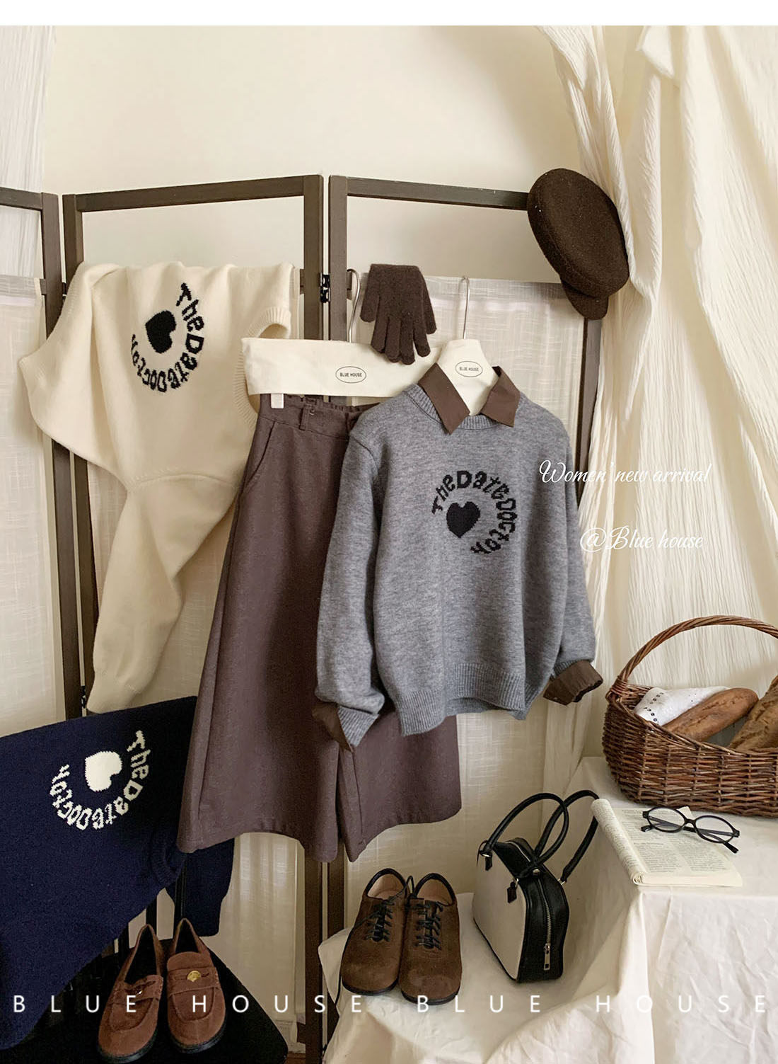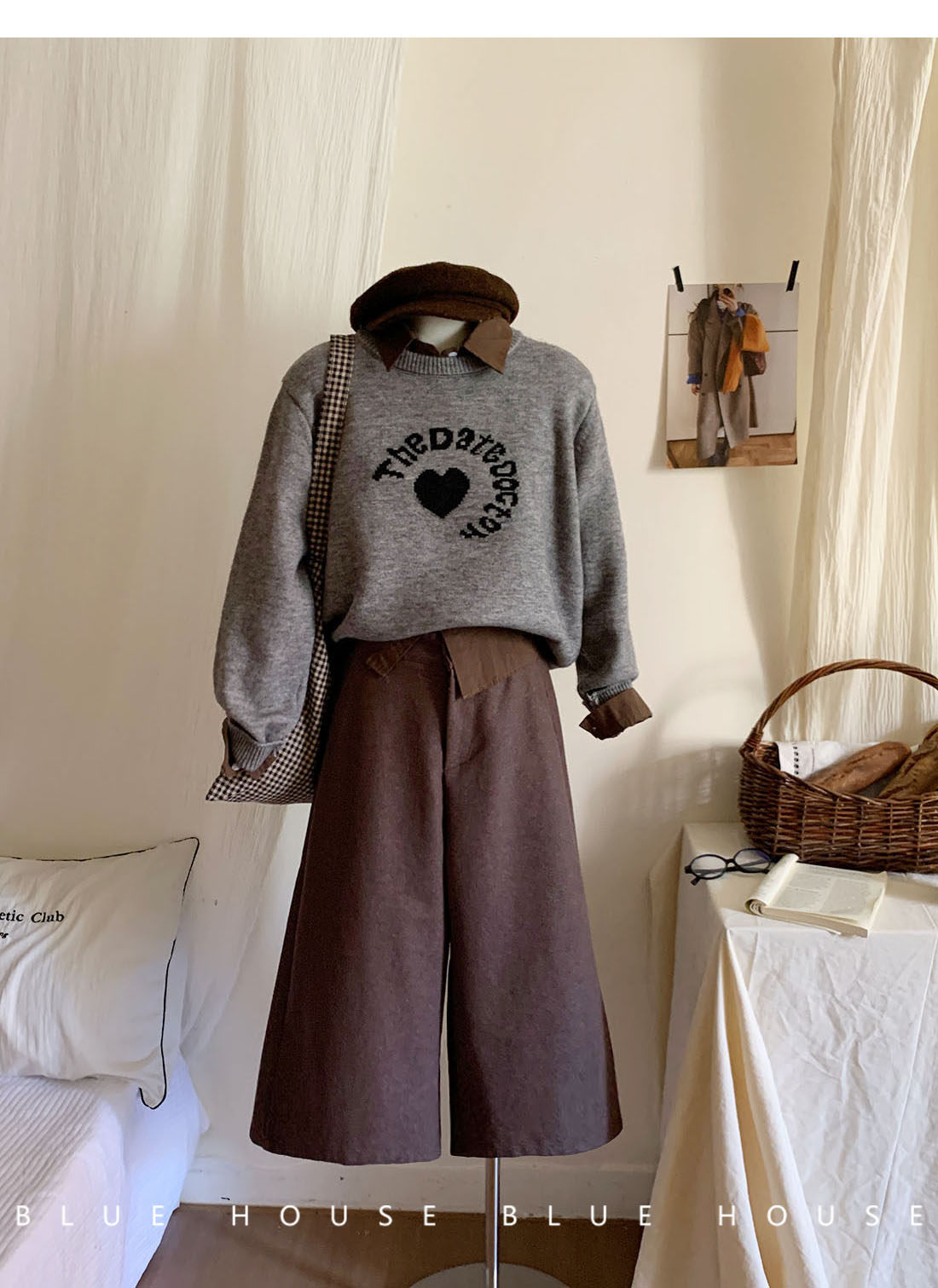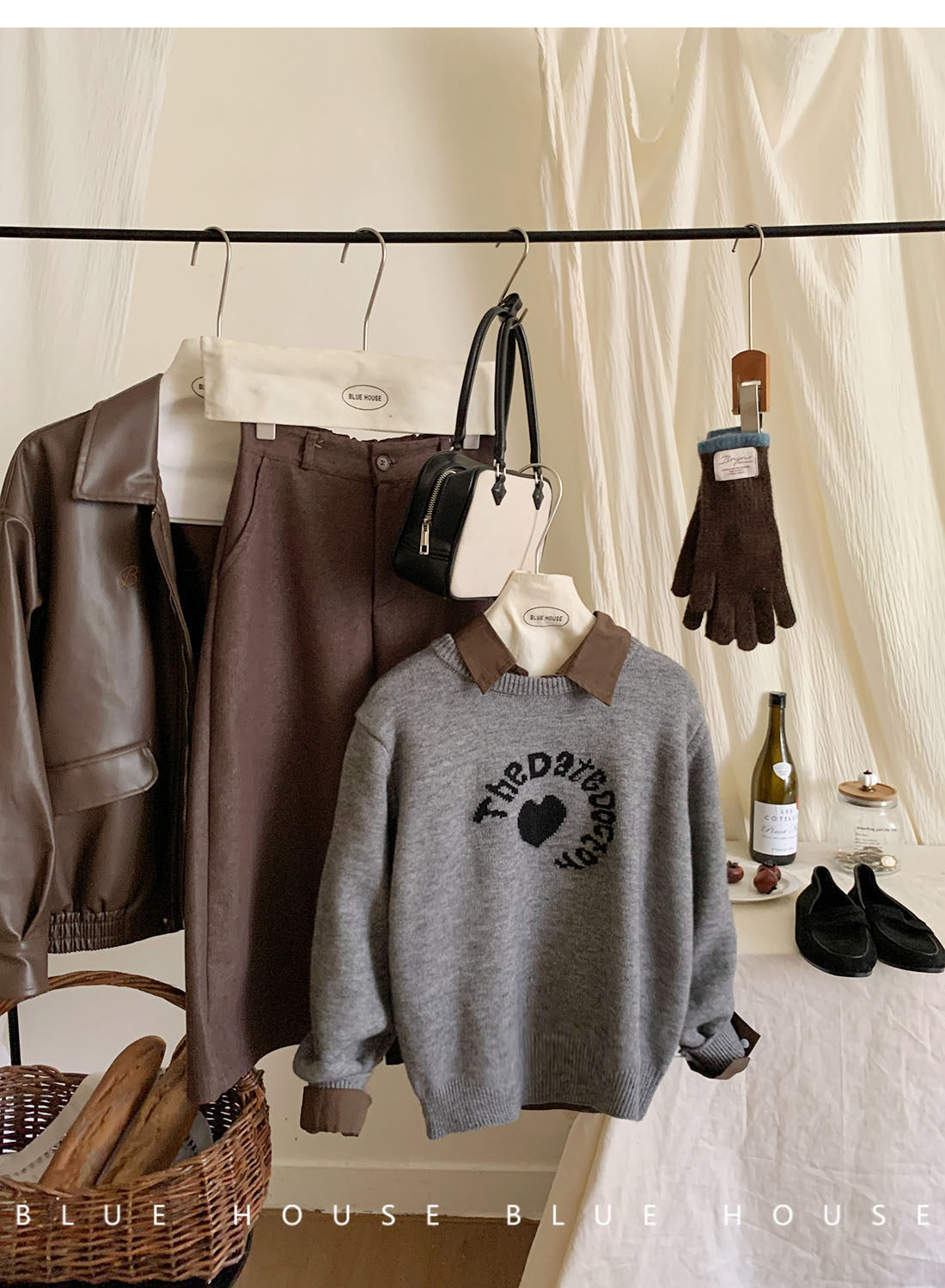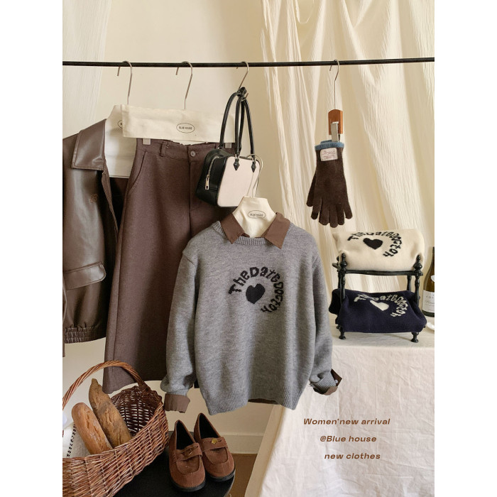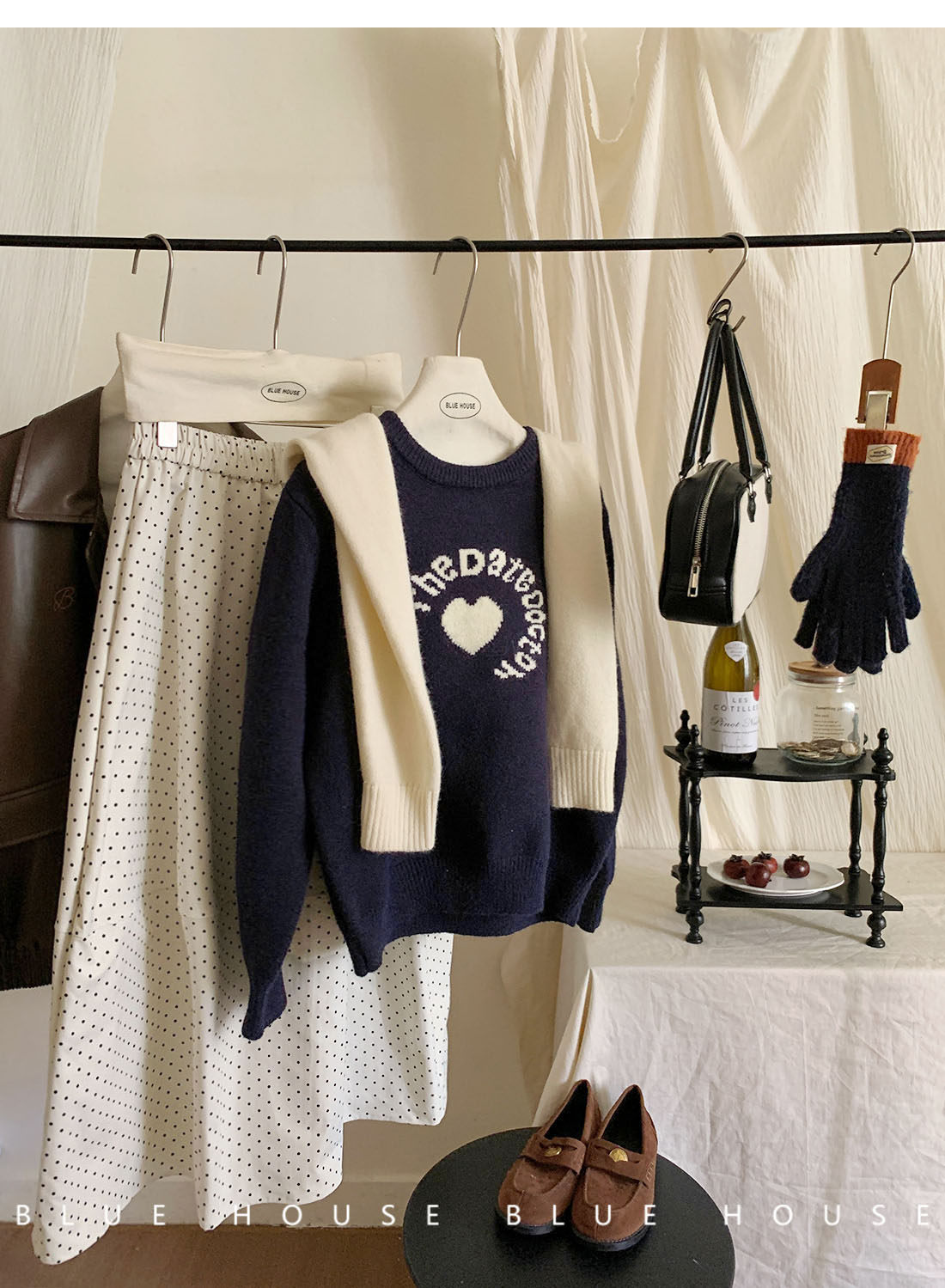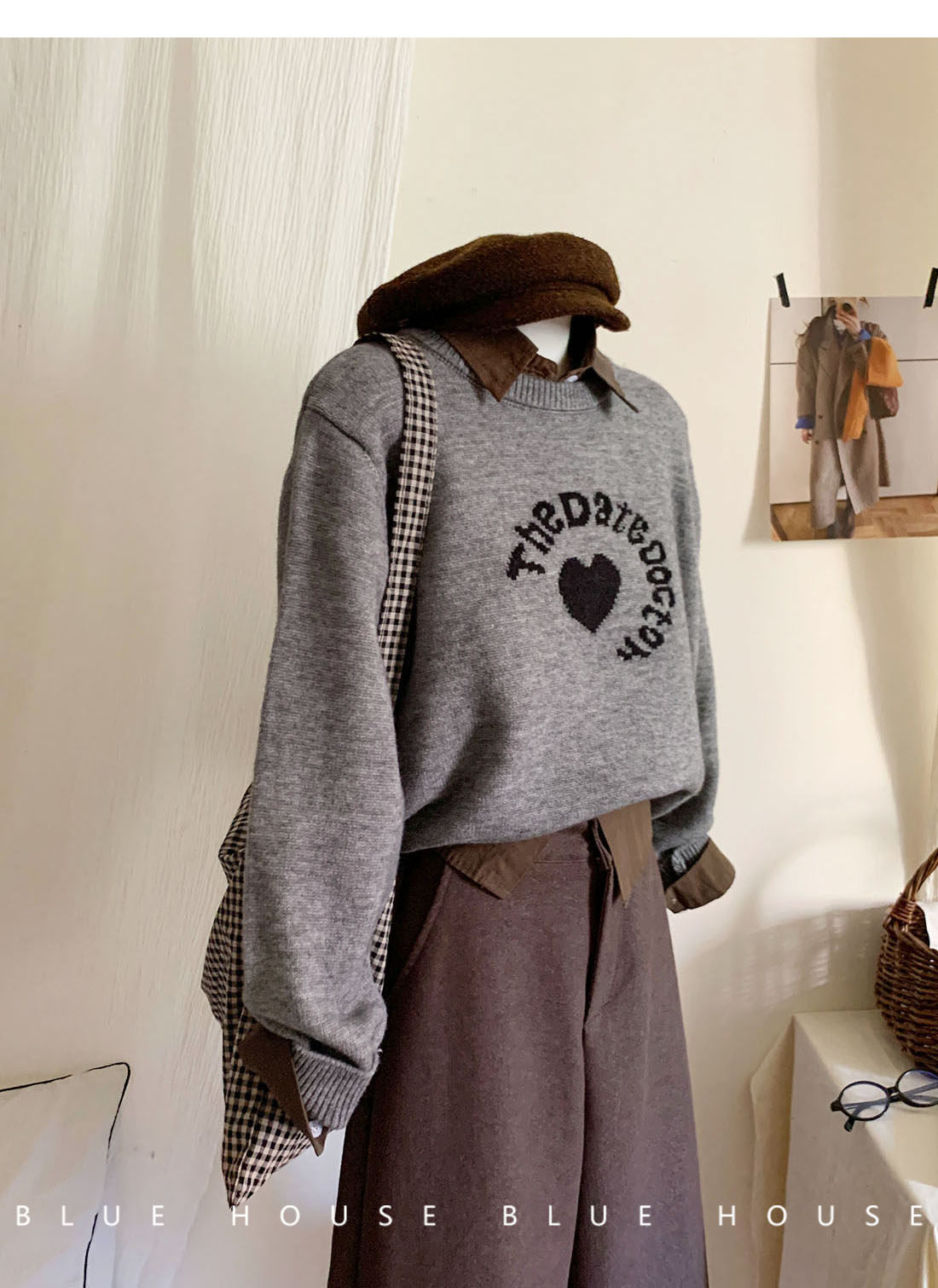 韓系簡約愛心字母提花針織上衣女秋冬季復古寬松外穿內搭套頭毛衣