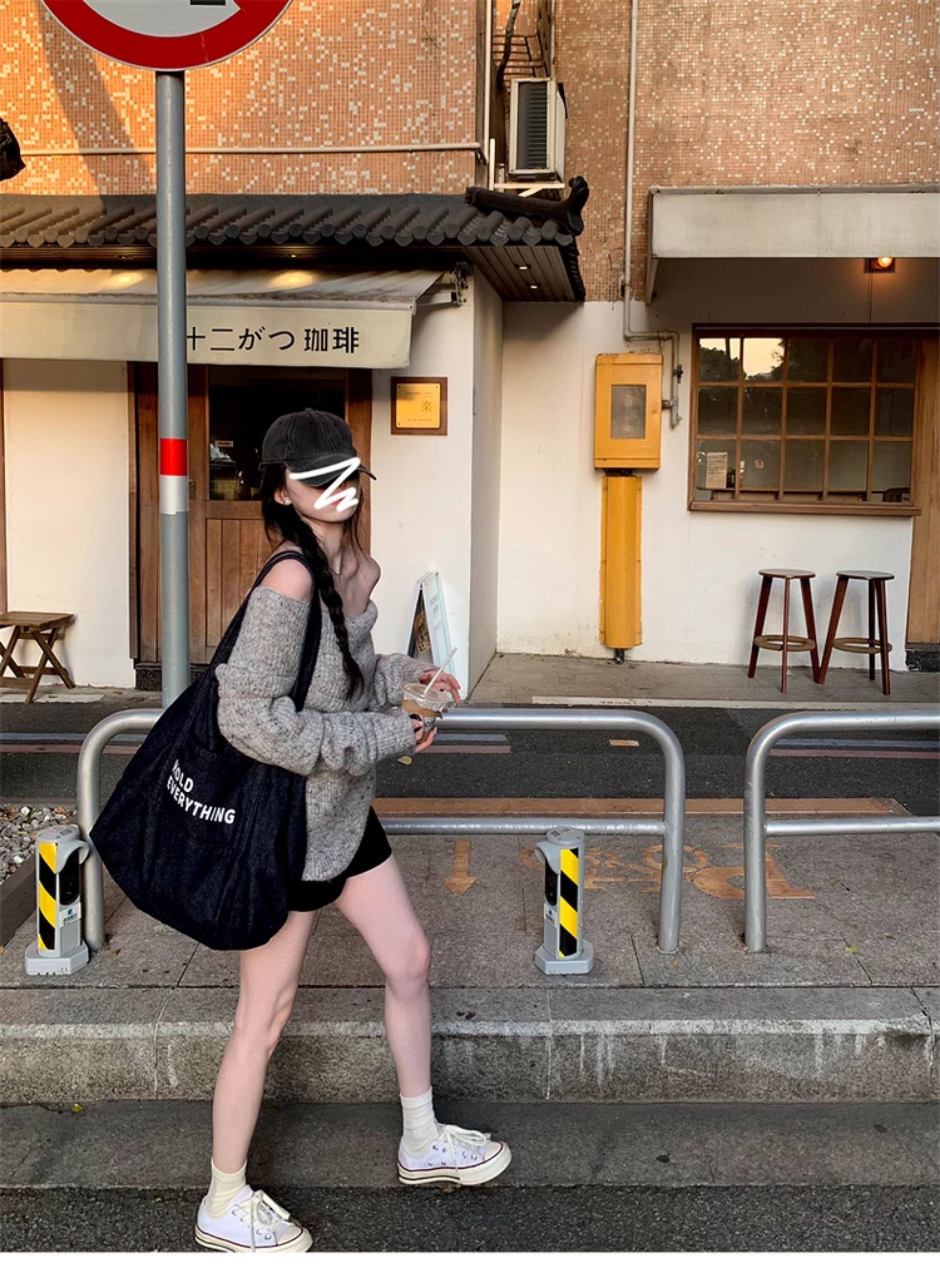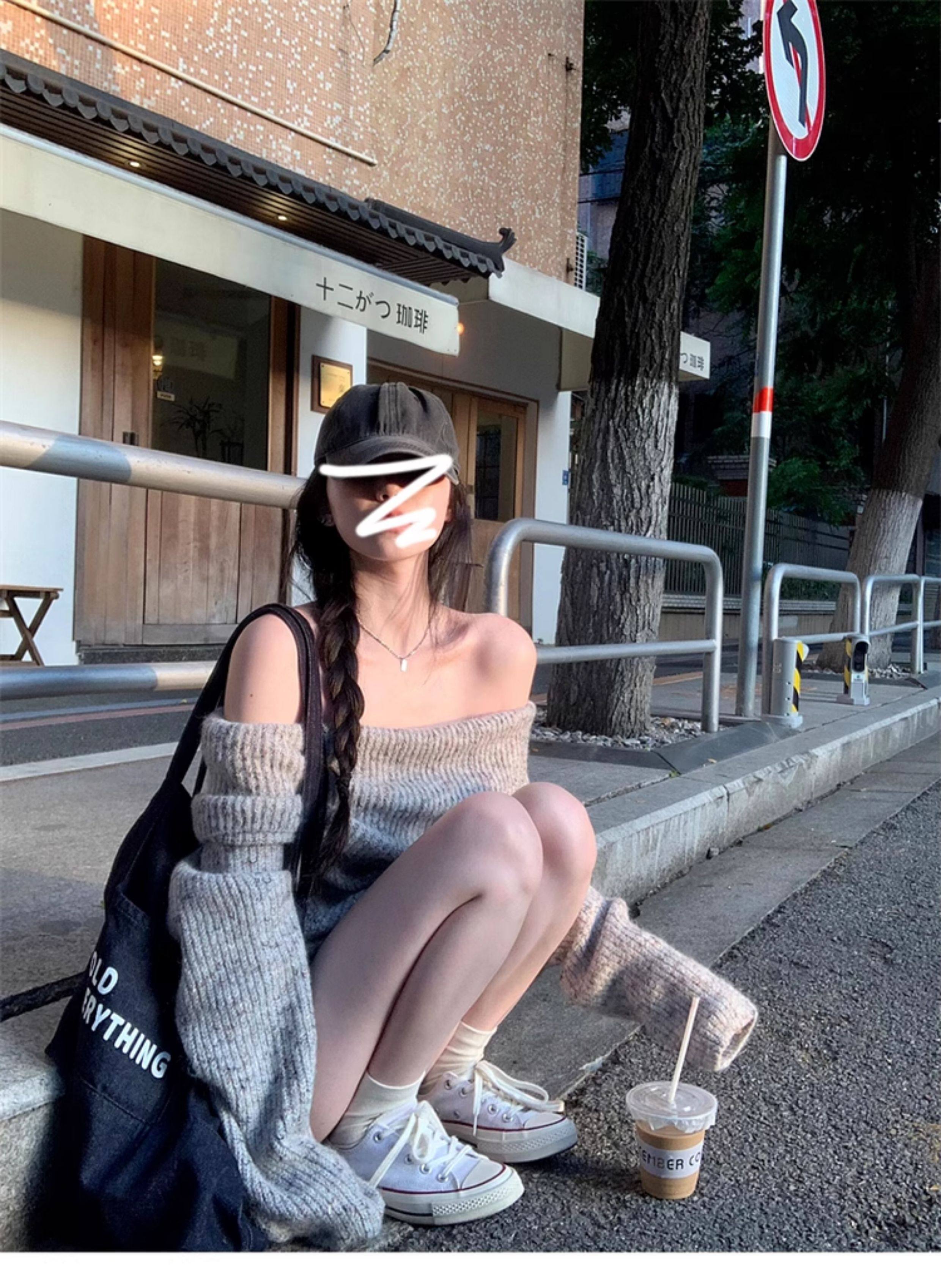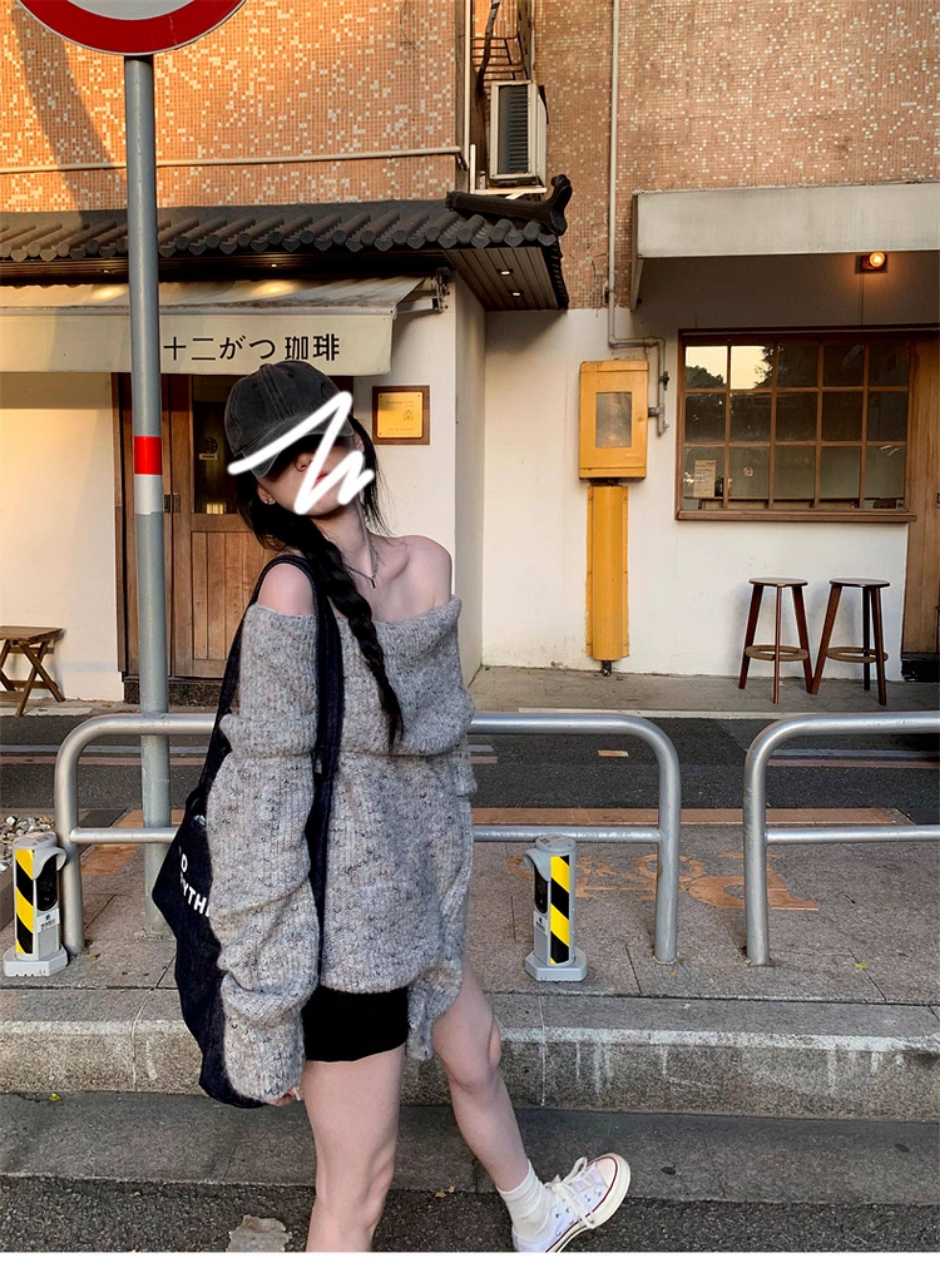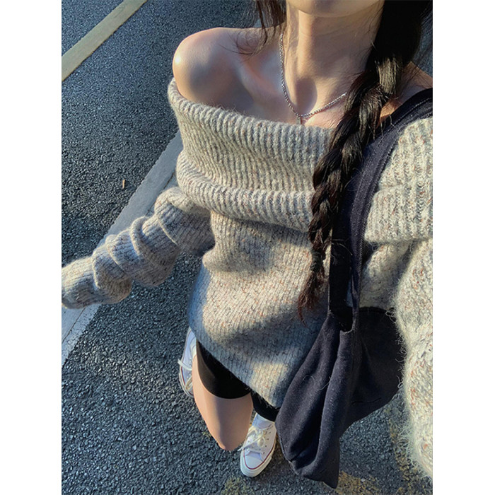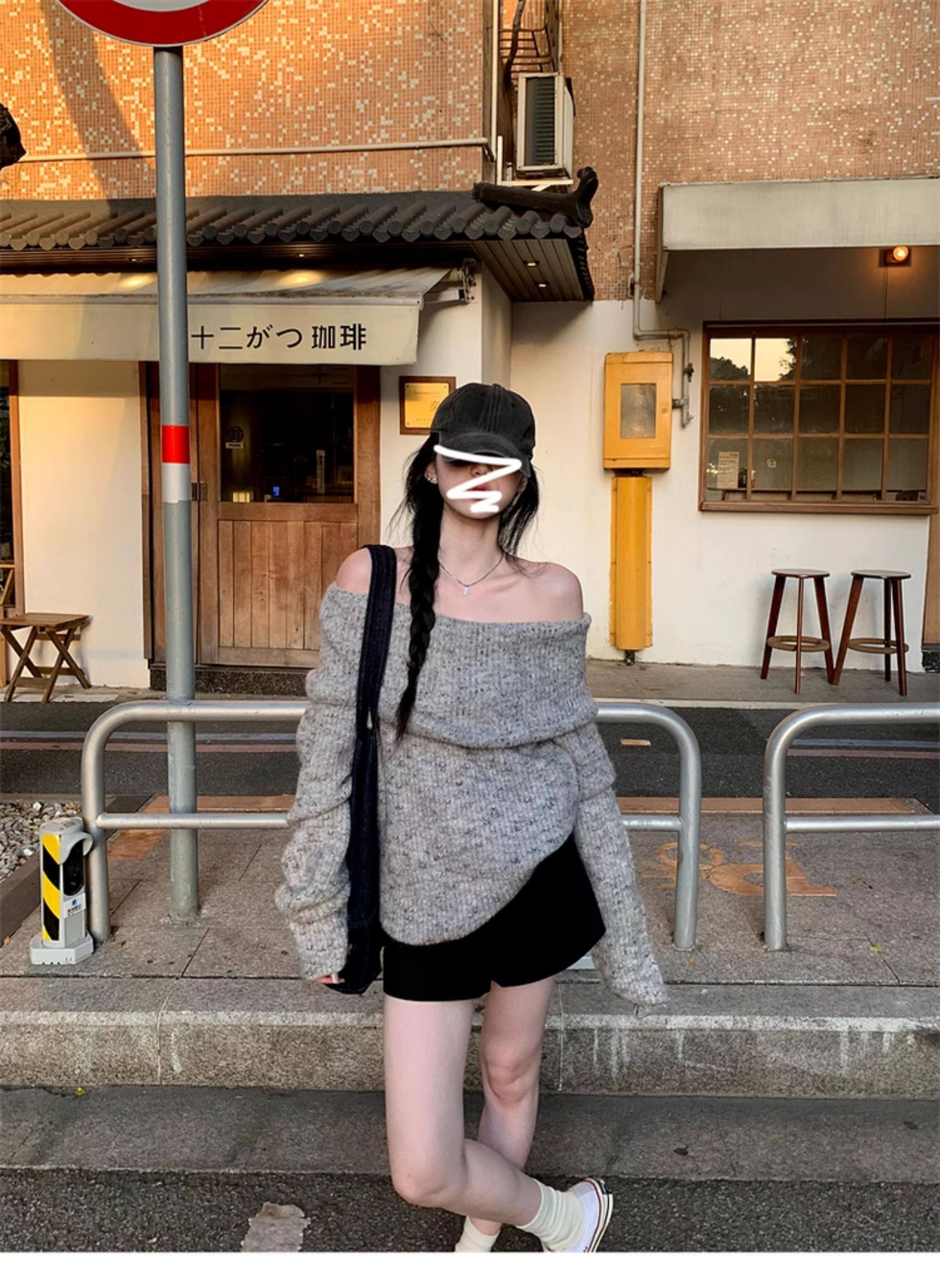 一字肩灰色純欲毛衣女秋冬季2025新款設計感慵懶風高級感露肩上衣