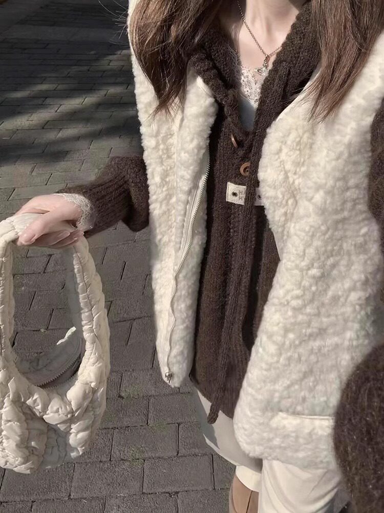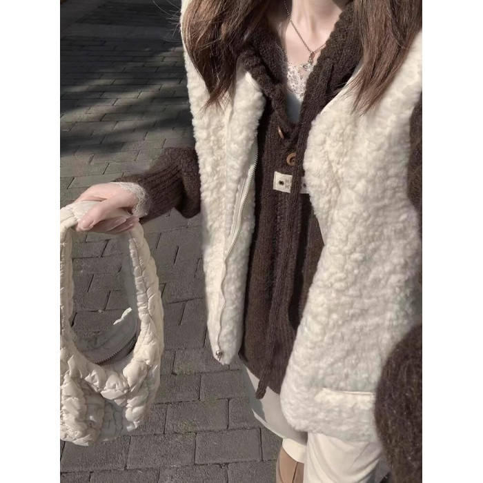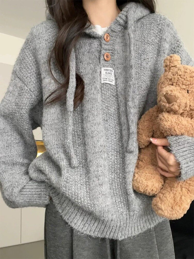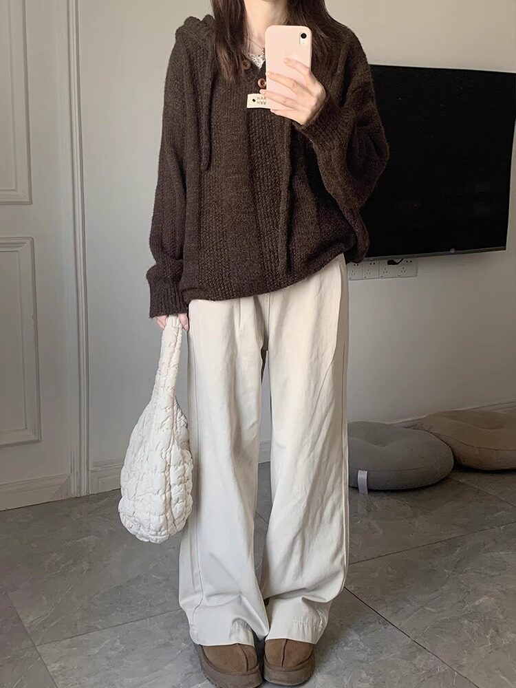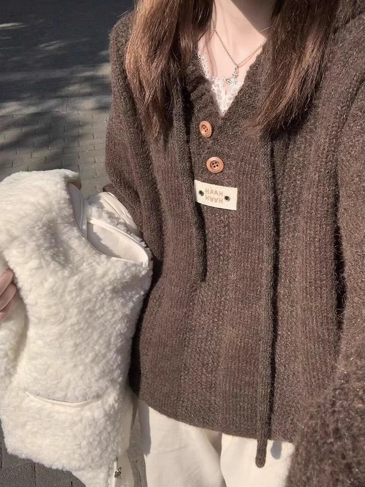 高級感咖色連帽毛衣女冬季慵懶風美拉德穿搭寬松外套針織衫上衣女