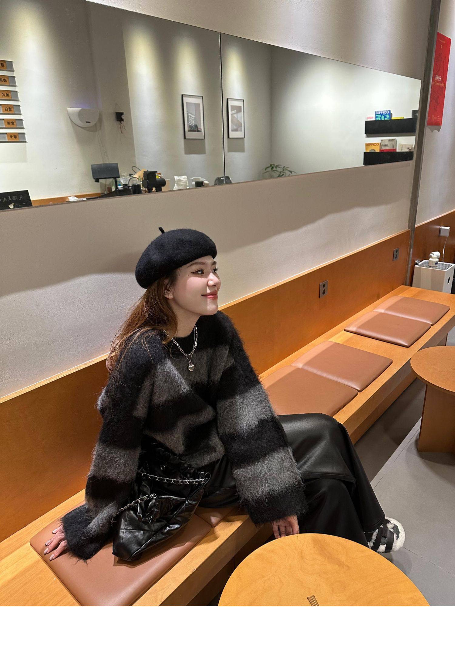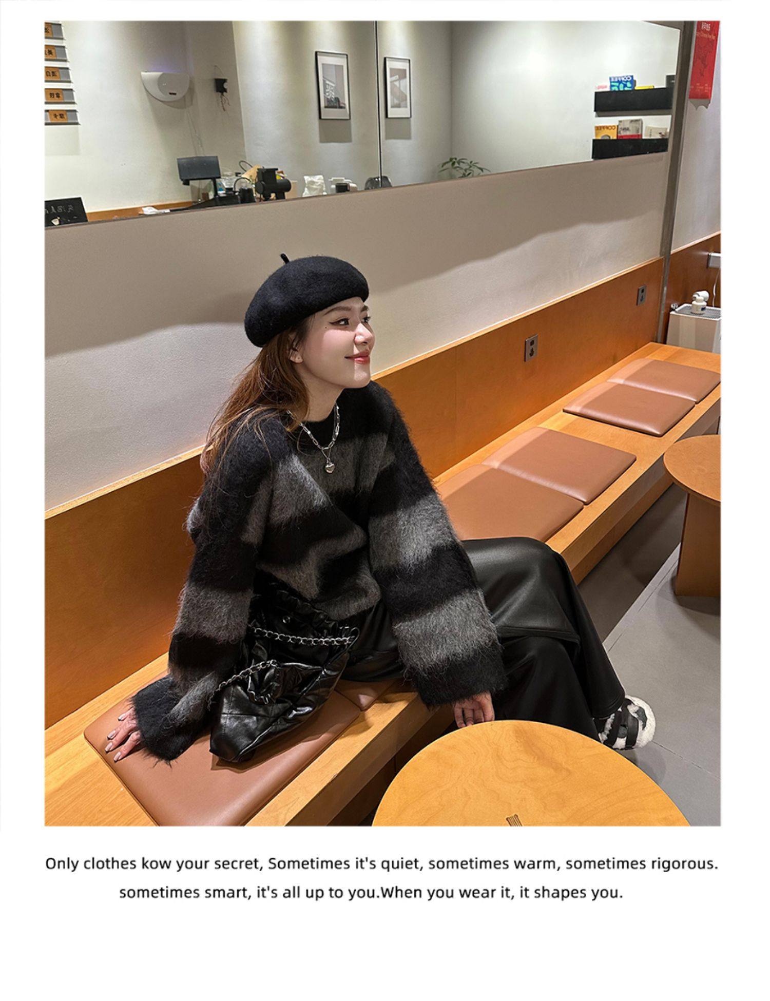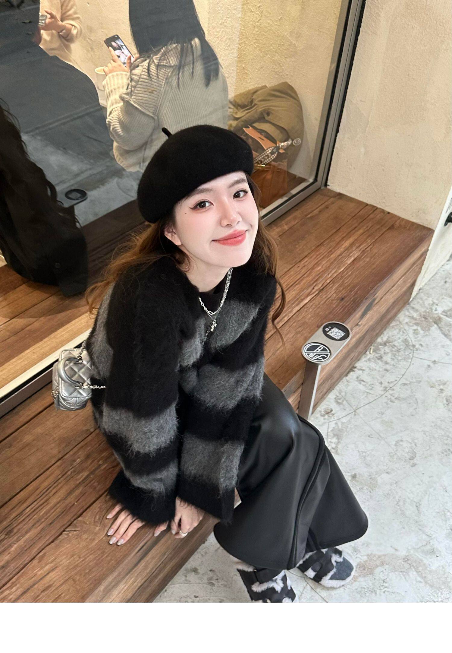 韓系氛圍感氣質慵懶風條紋圓領套頭毛衣女秋冬寬松休閒設計感上衣