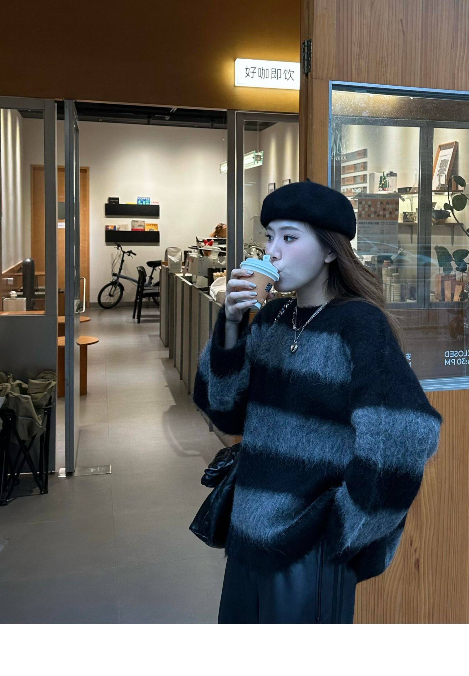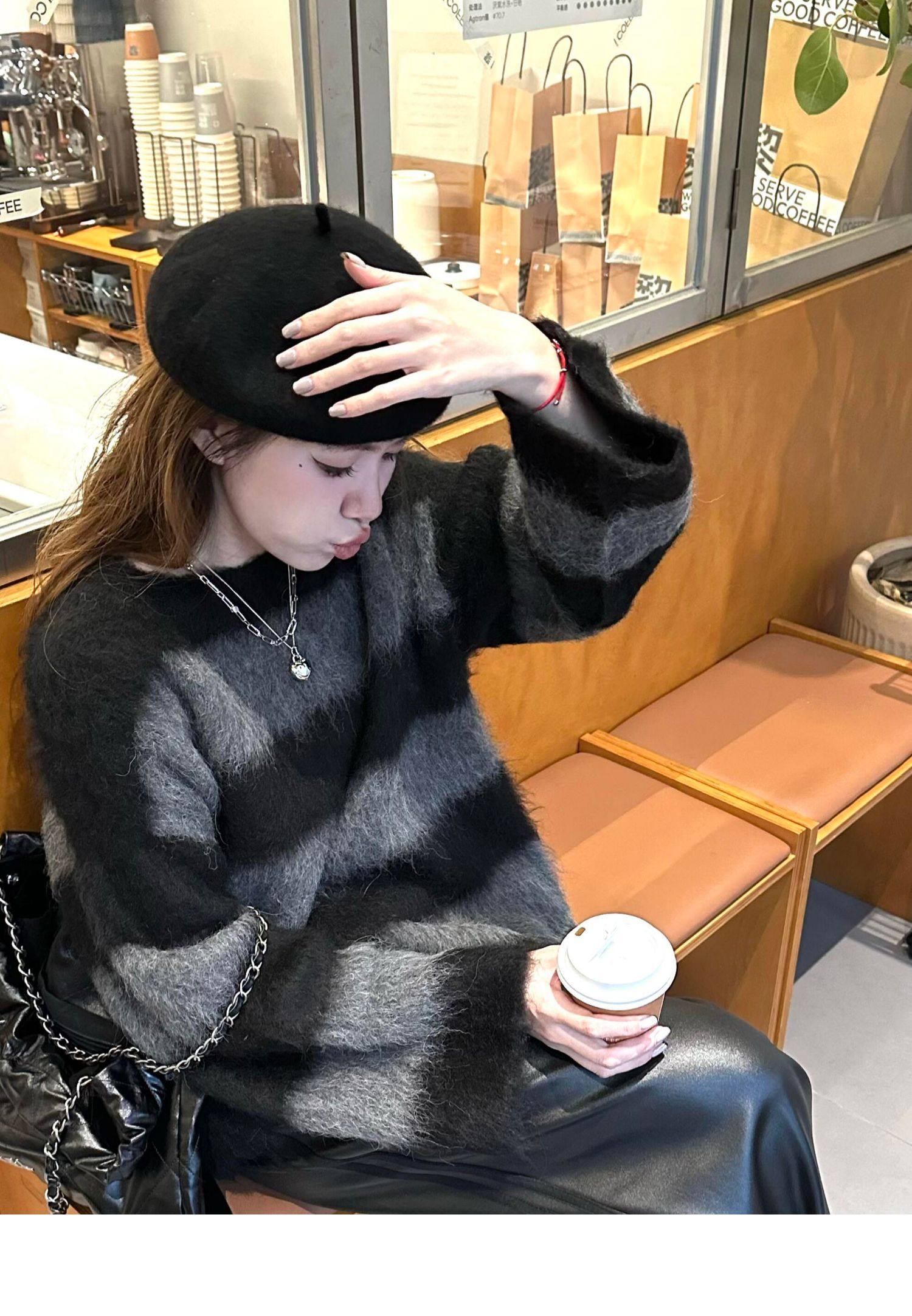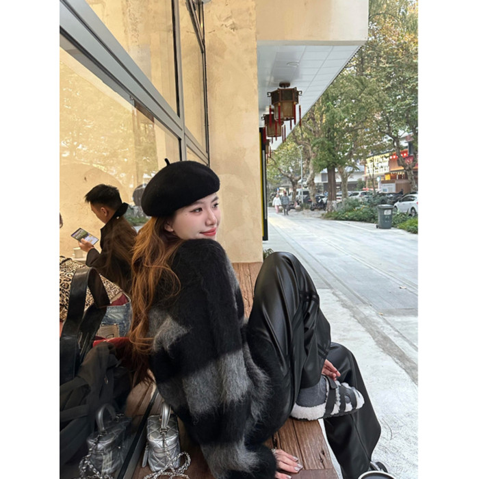 韓系氛圍感氣質慵懶風條紋圓領套頭毛衣女秋冬寬松休閒設計感上衣