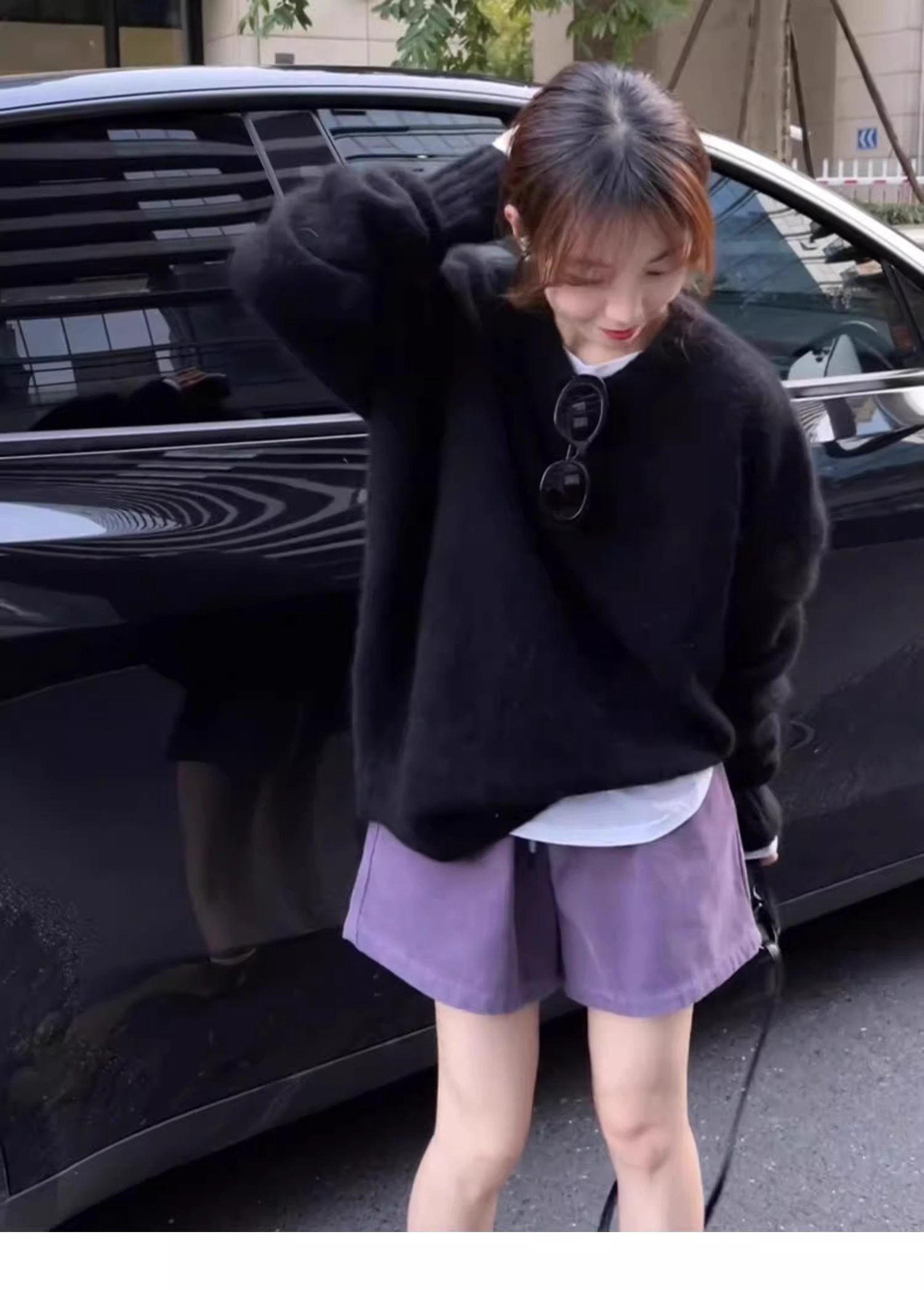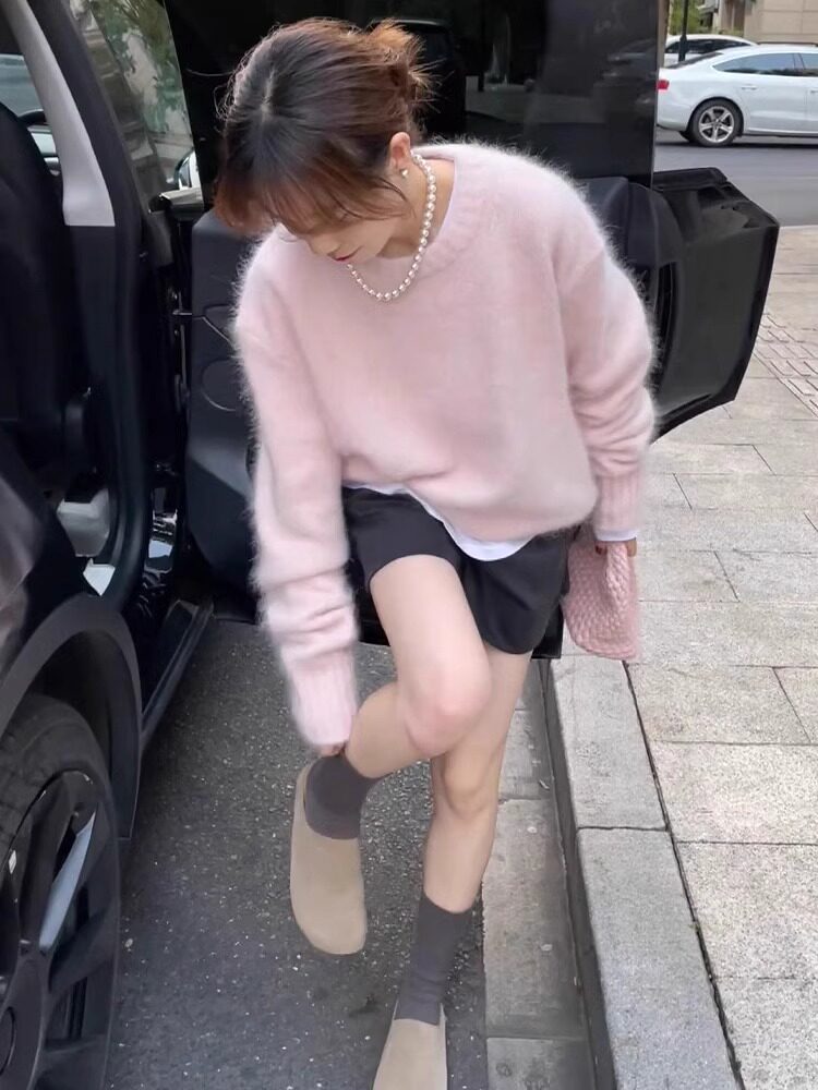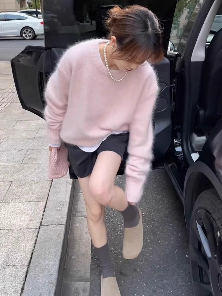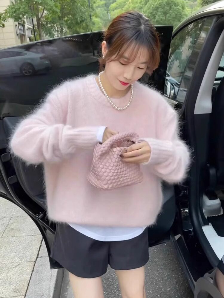 小個子粉色馬海毛慵懶松弛感套頭毛衣女秋冬軟糯高級感針織衫上衣