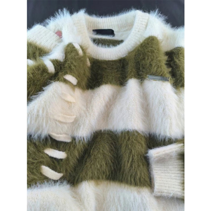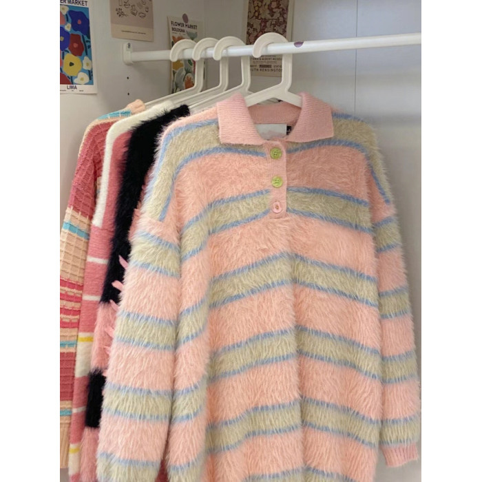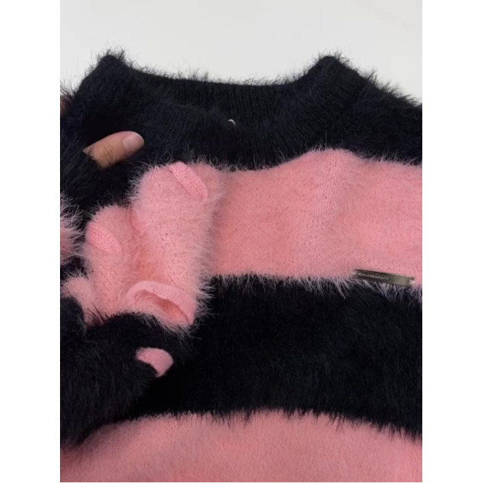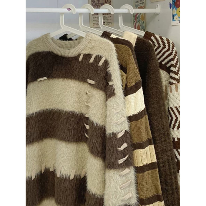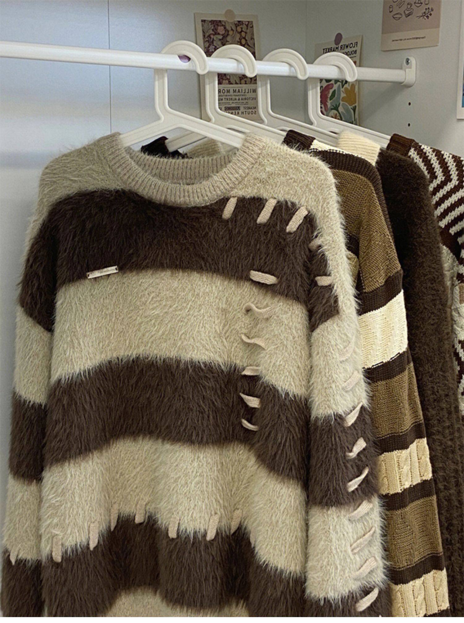 韓式慵懶風條紋水貂絨毛衣女秋冬季寬松設計感小衆毛茸茸加厚上衣