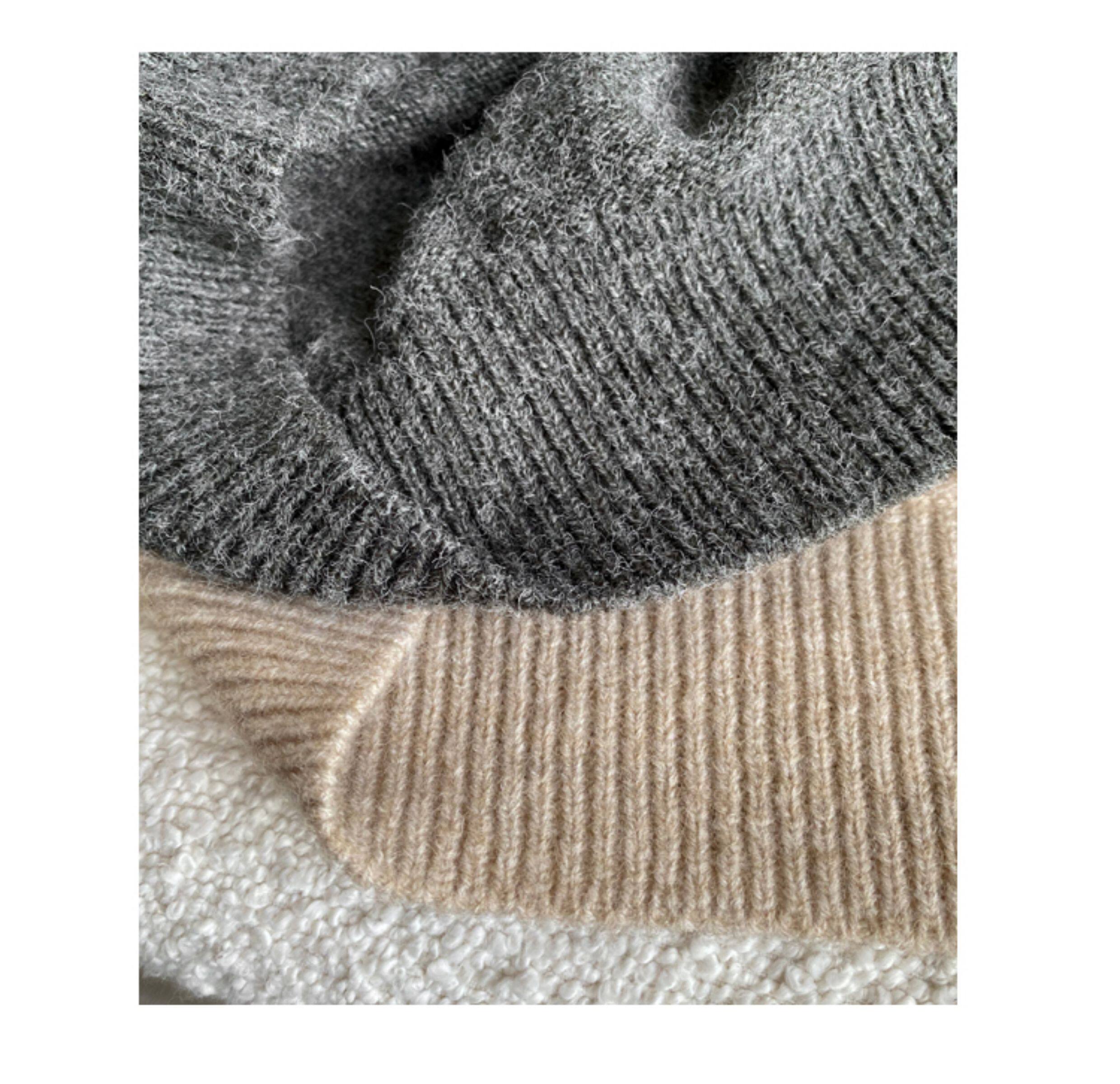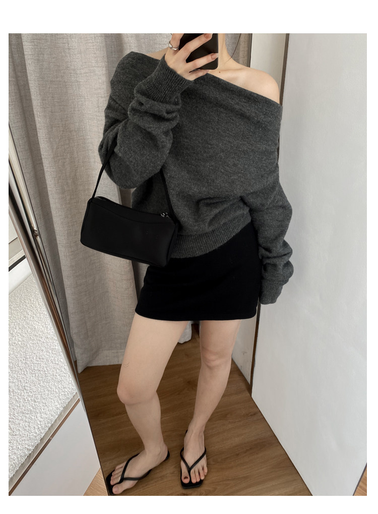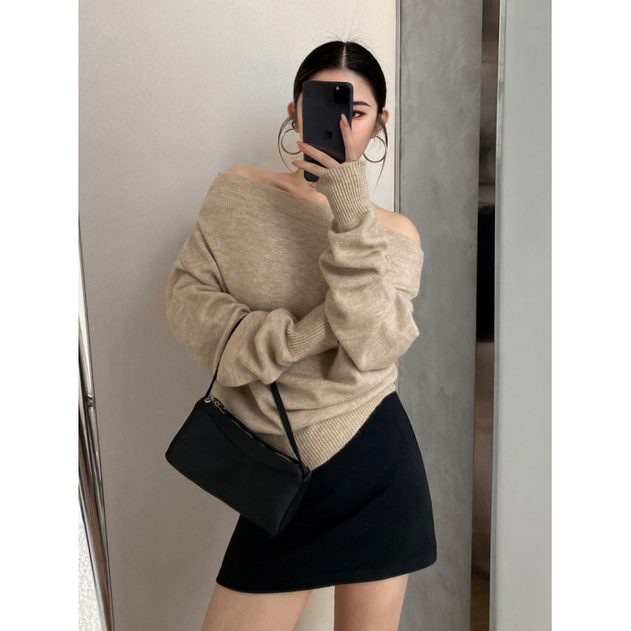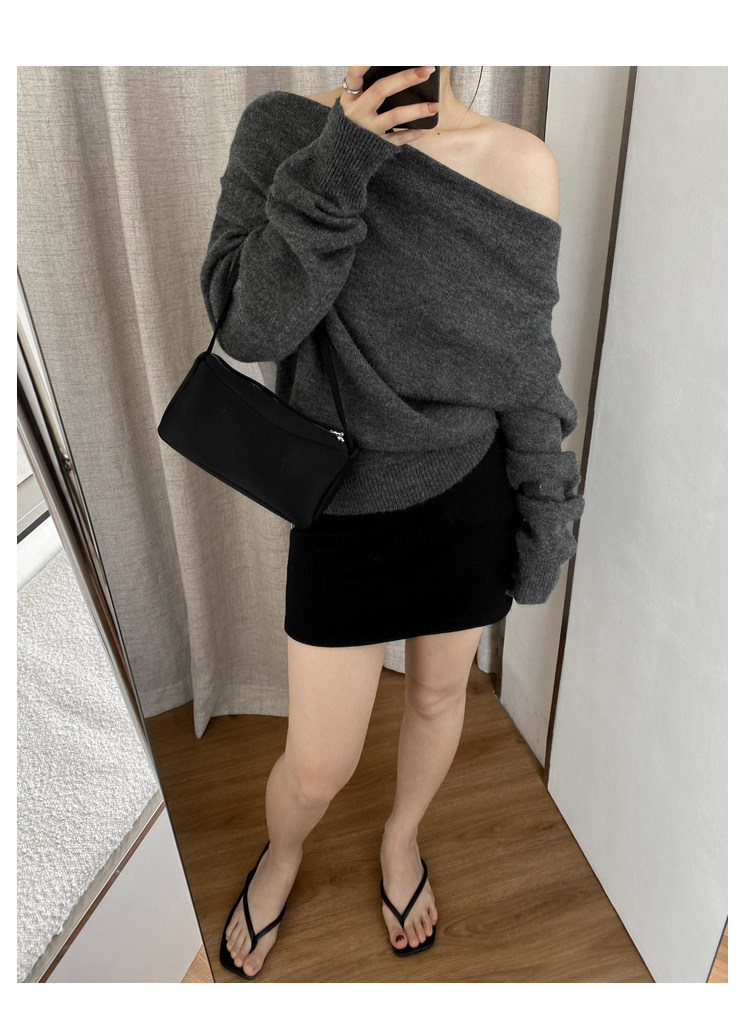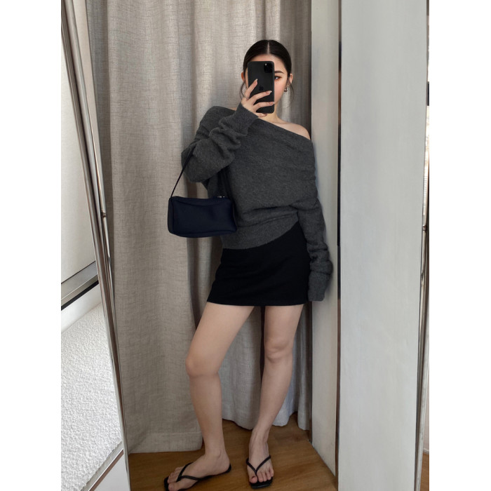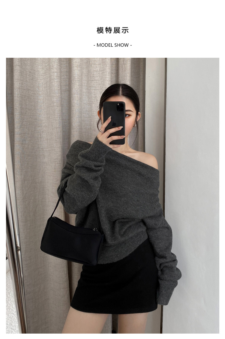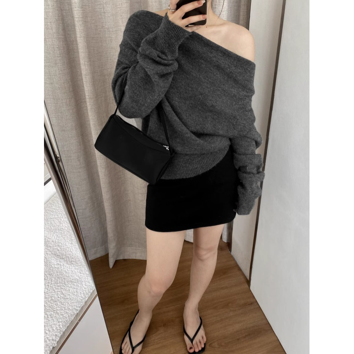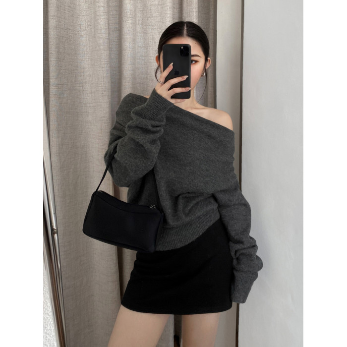 舒因SHUYIN 灰色一字肩韓系針織衫女秋冬慵懶風套頭毛衣氣質上衣