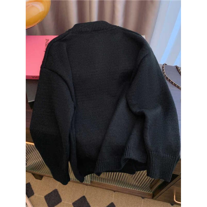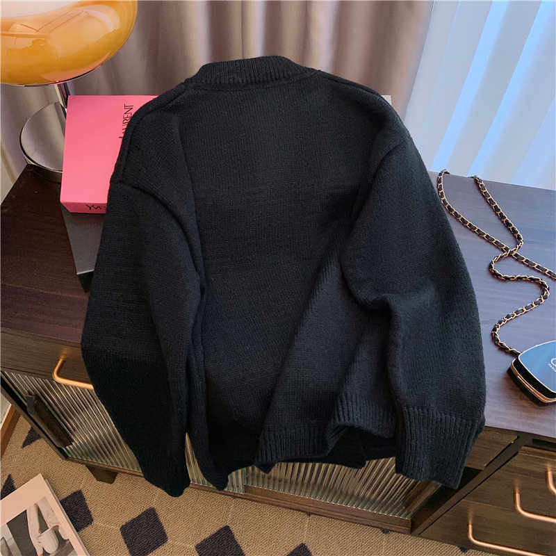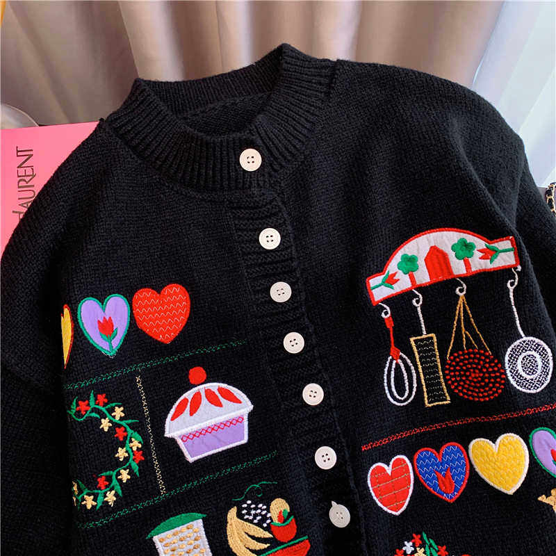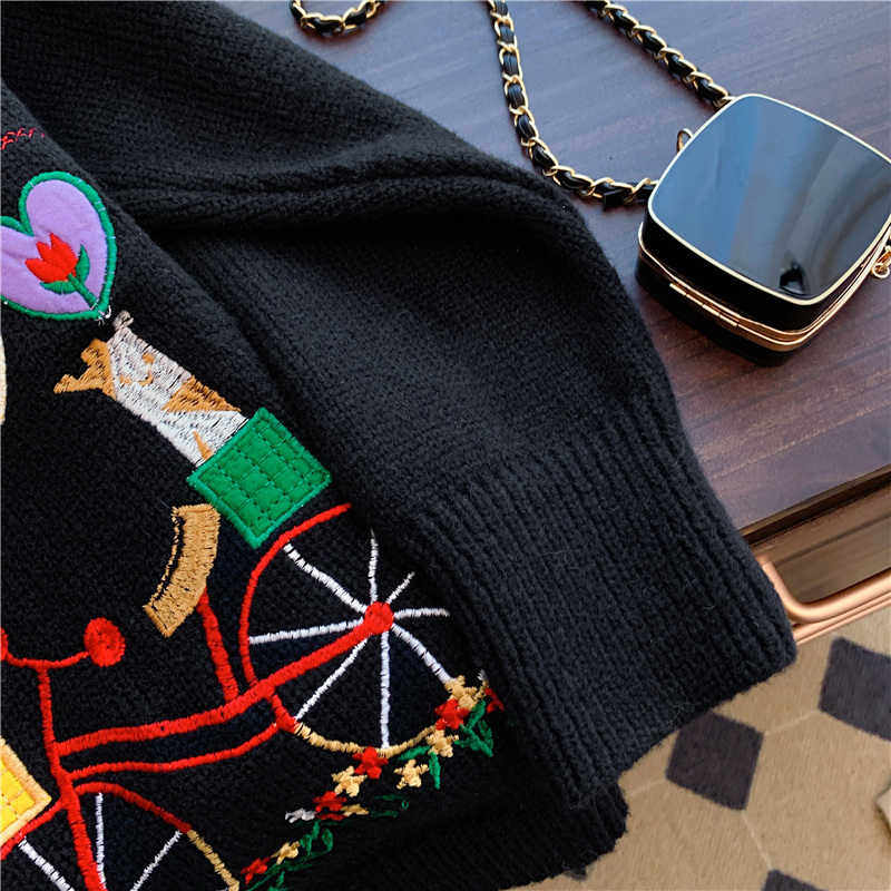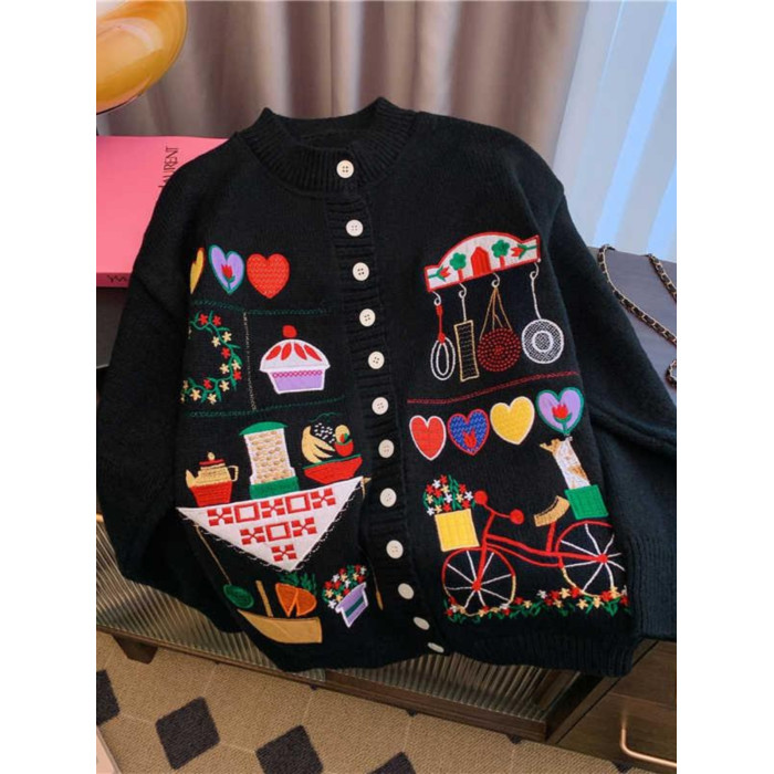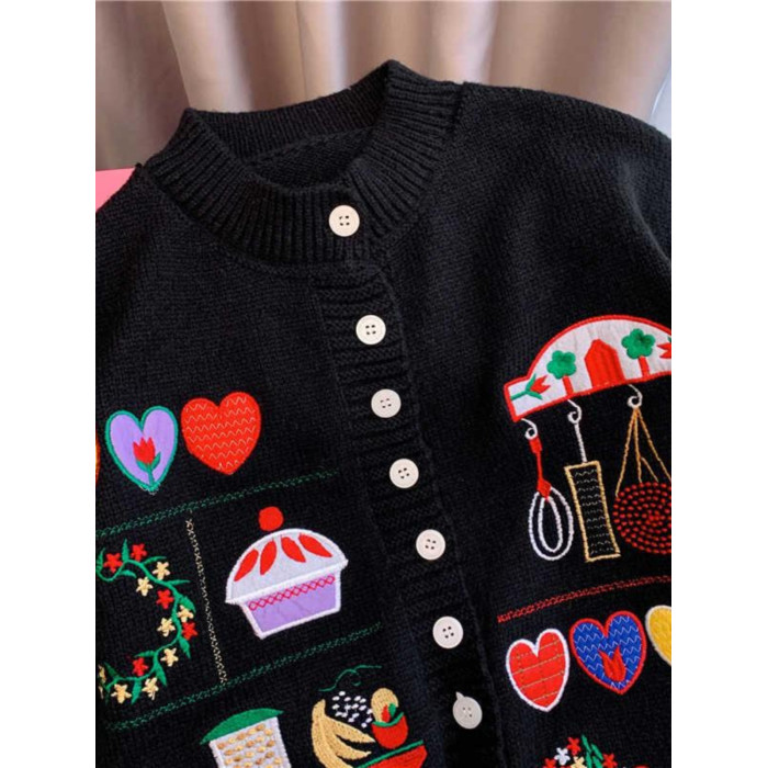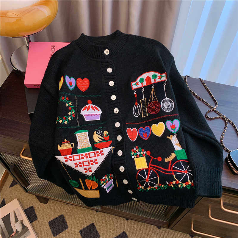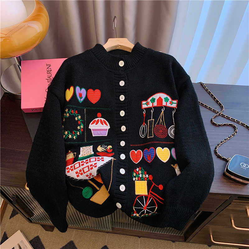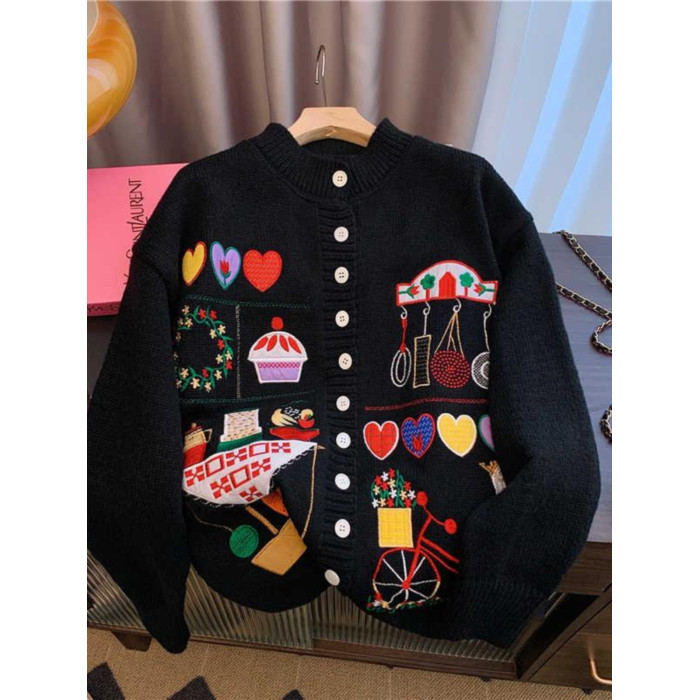 桃璽黑色毛衣女2024新款秋冬卡通洋氣刺綉減齡加厚針織開衫外套
