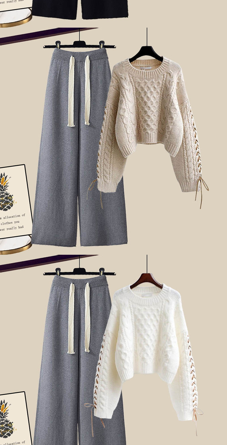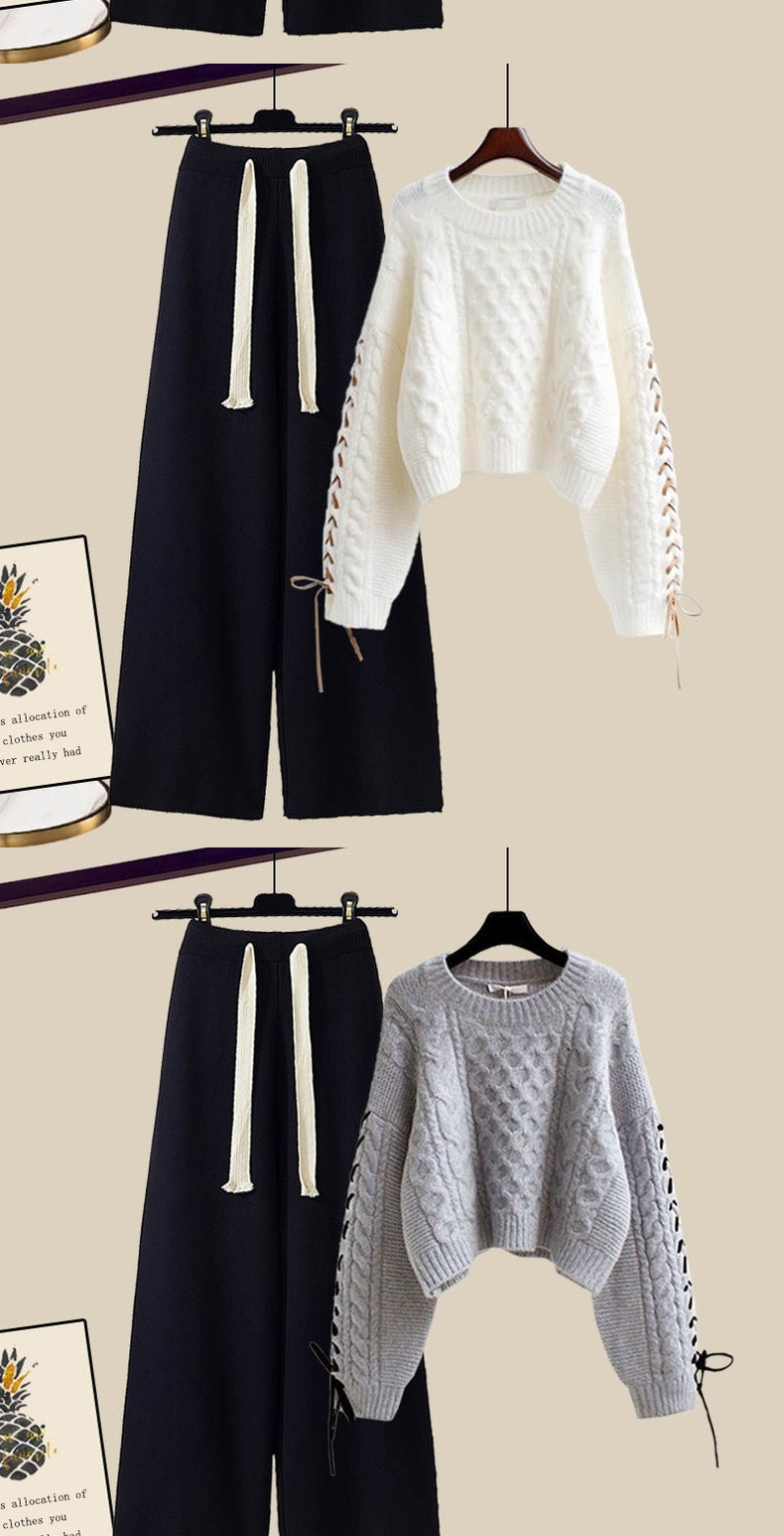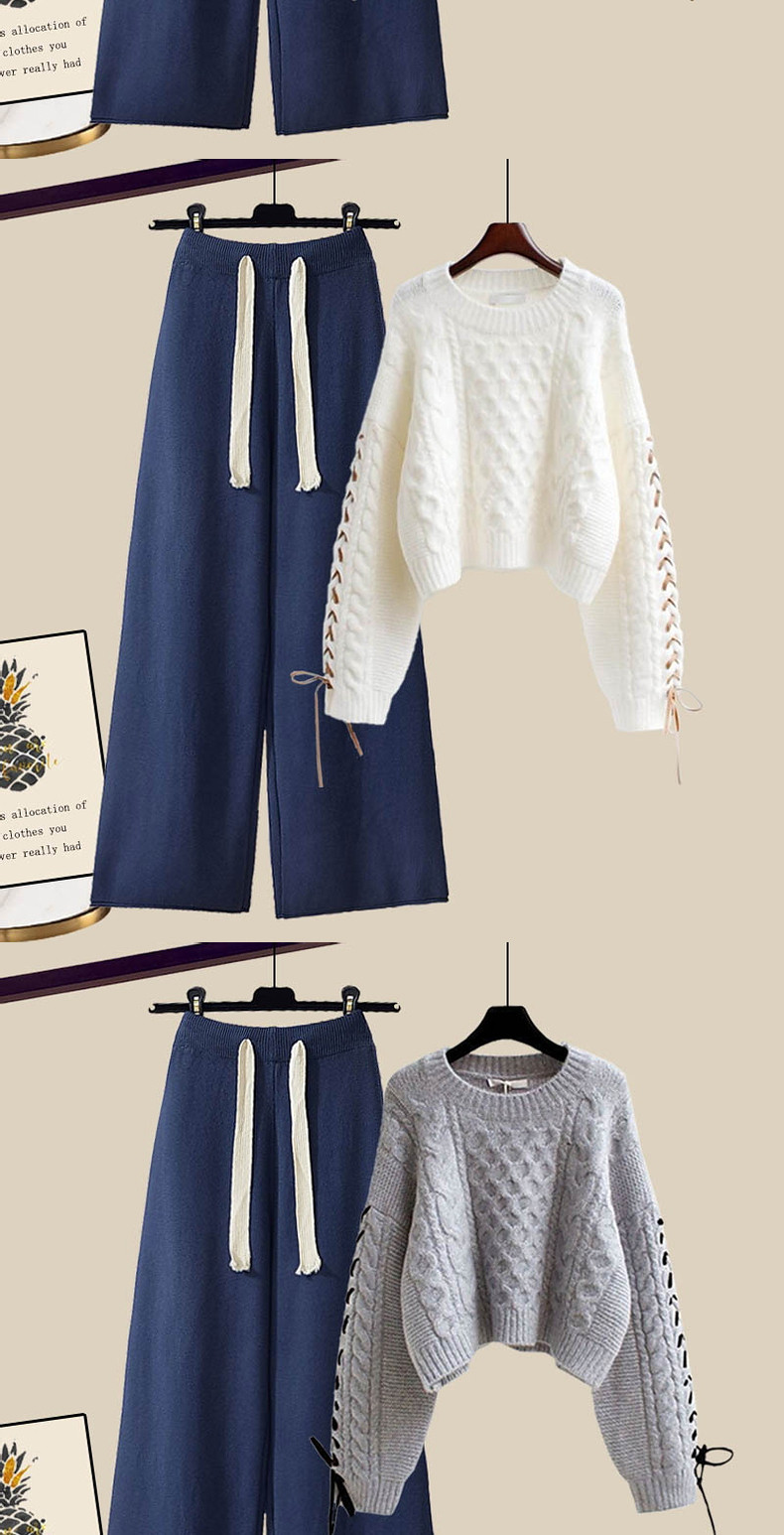 大碼秋冬休閒套裝女設計感針織衫毛衣大高腰顯瘦百搭濶腿褲兩件套