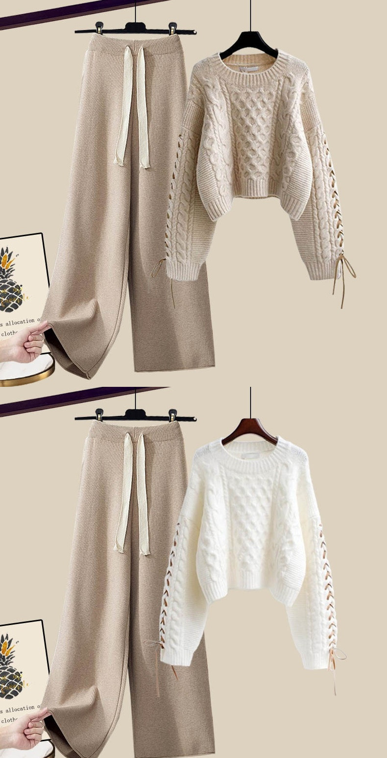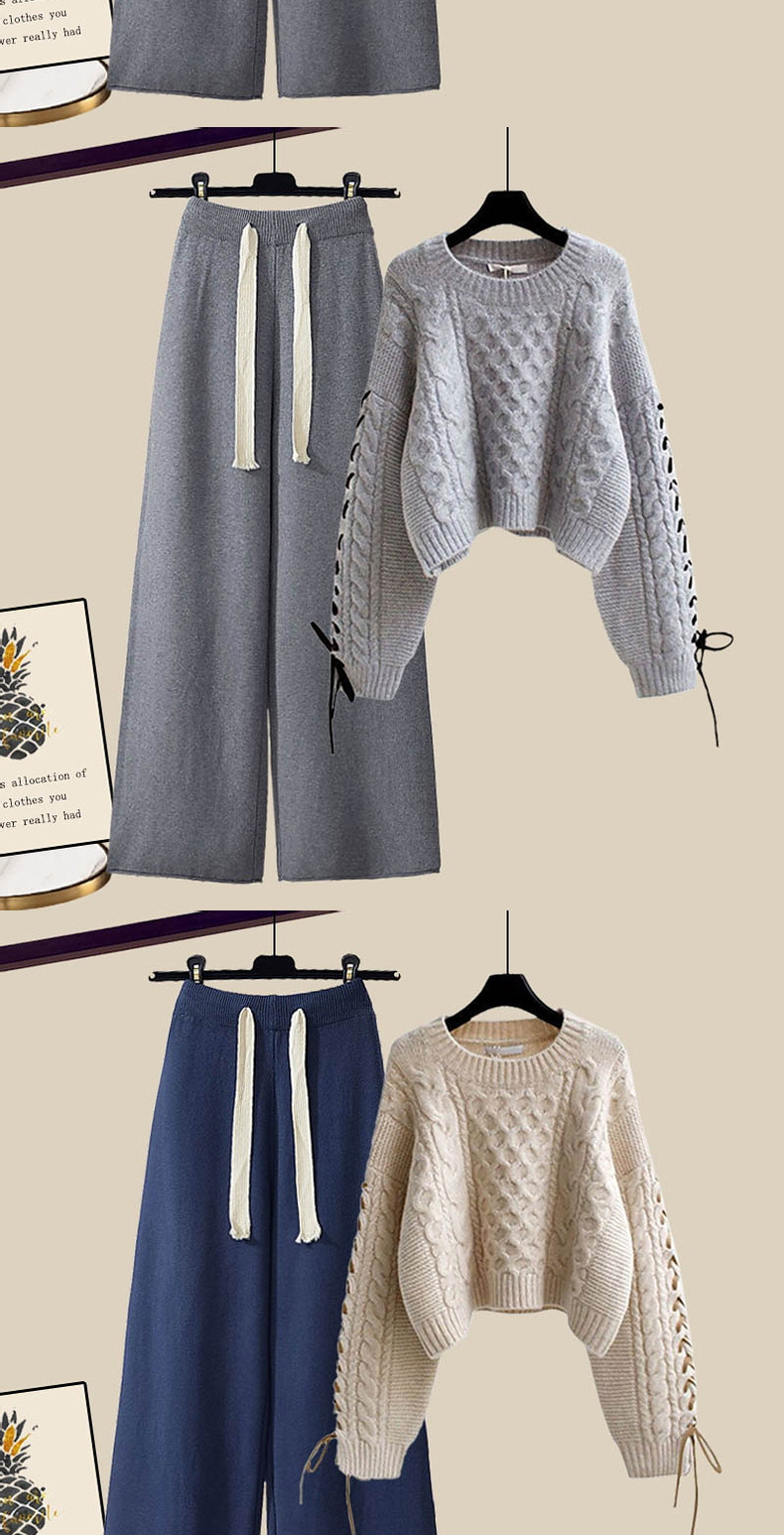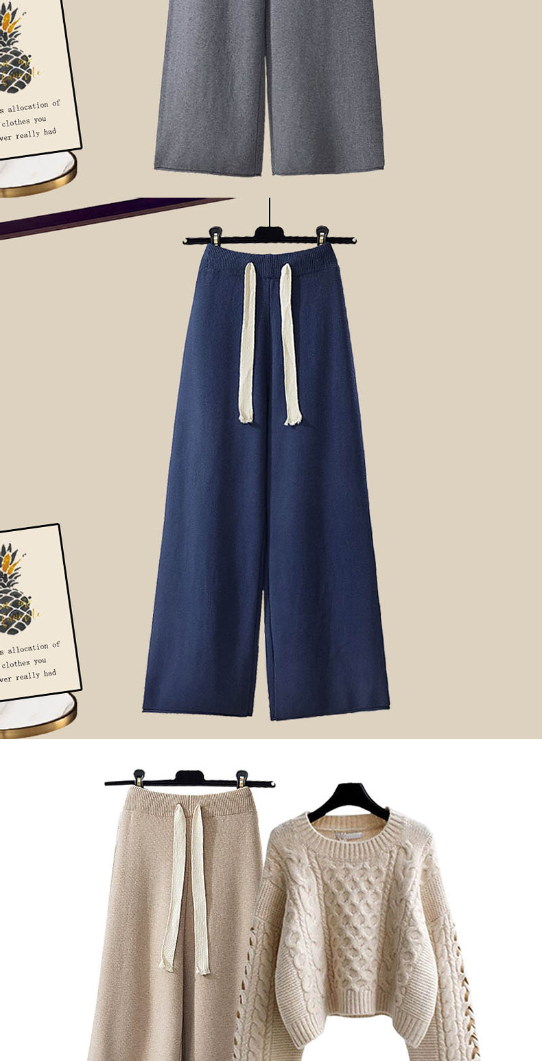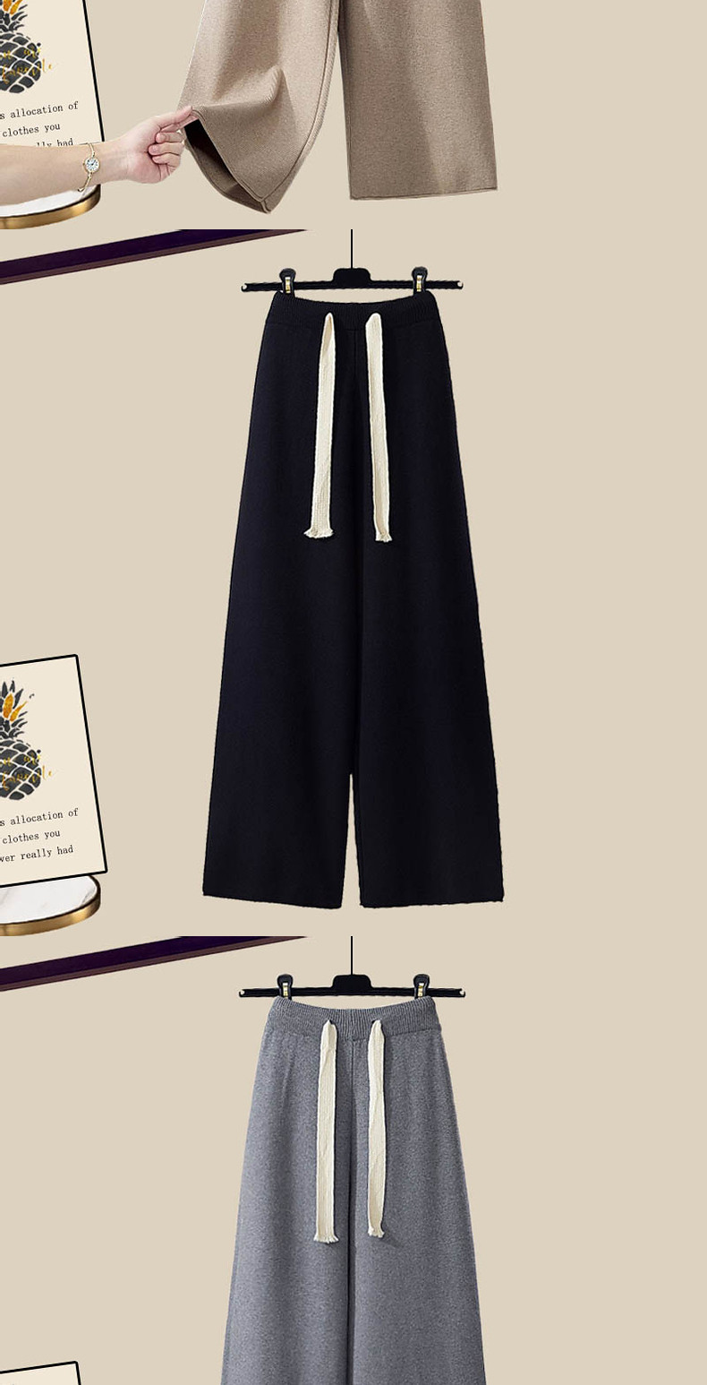 大碼秋冬休閒套裝女設計感針織衫毛衣大高腰顯瘦百搭濶腿褲兩件套