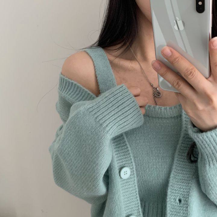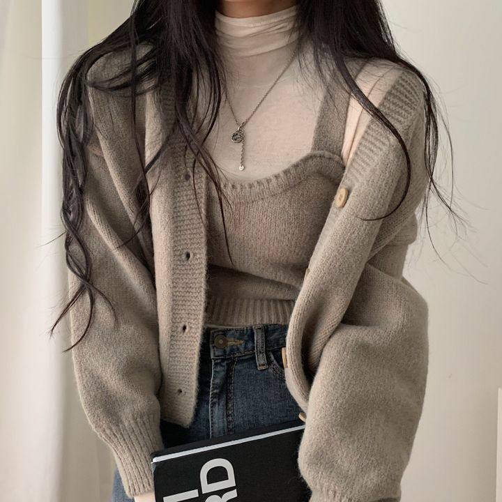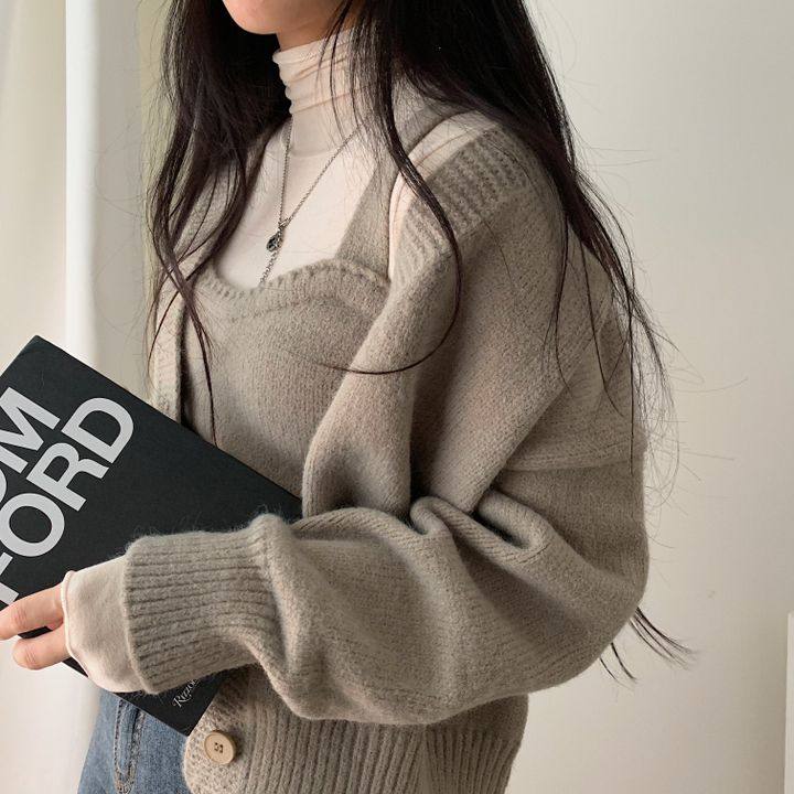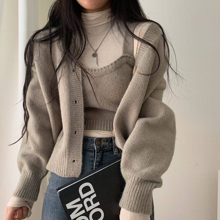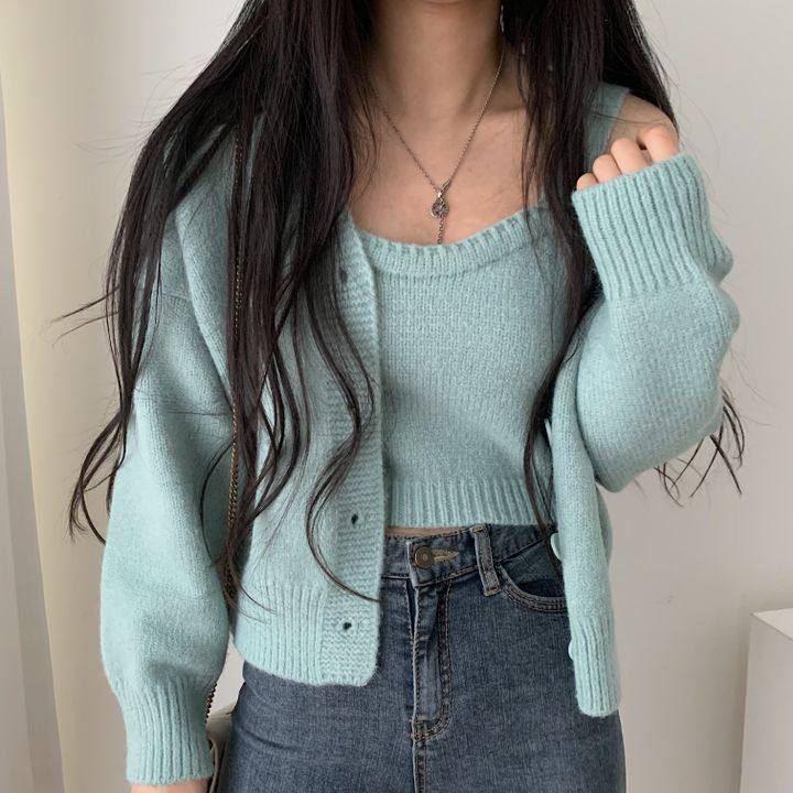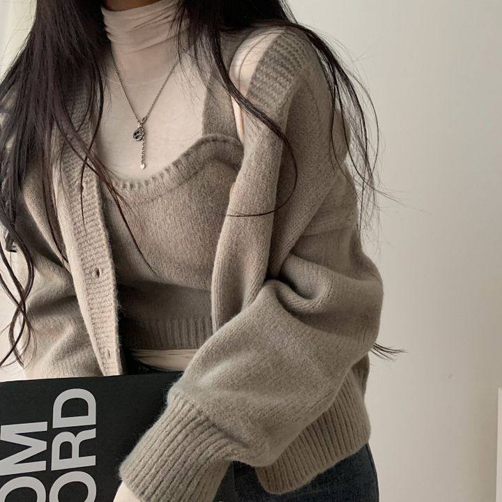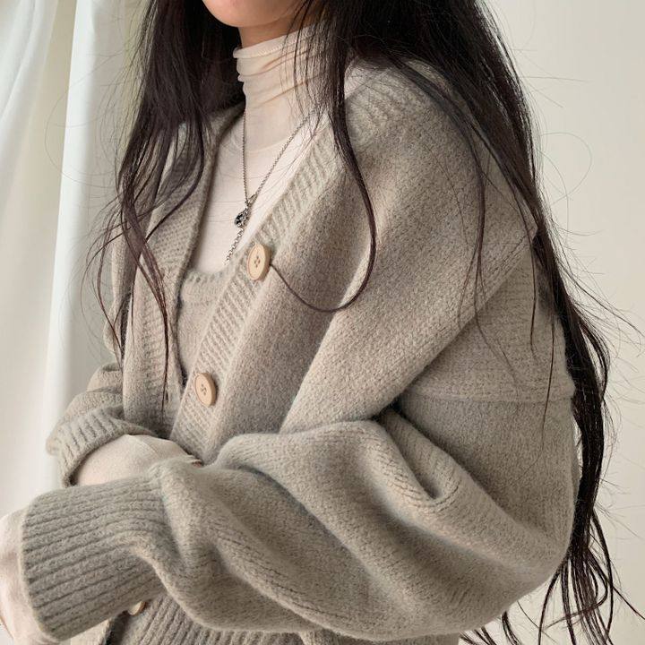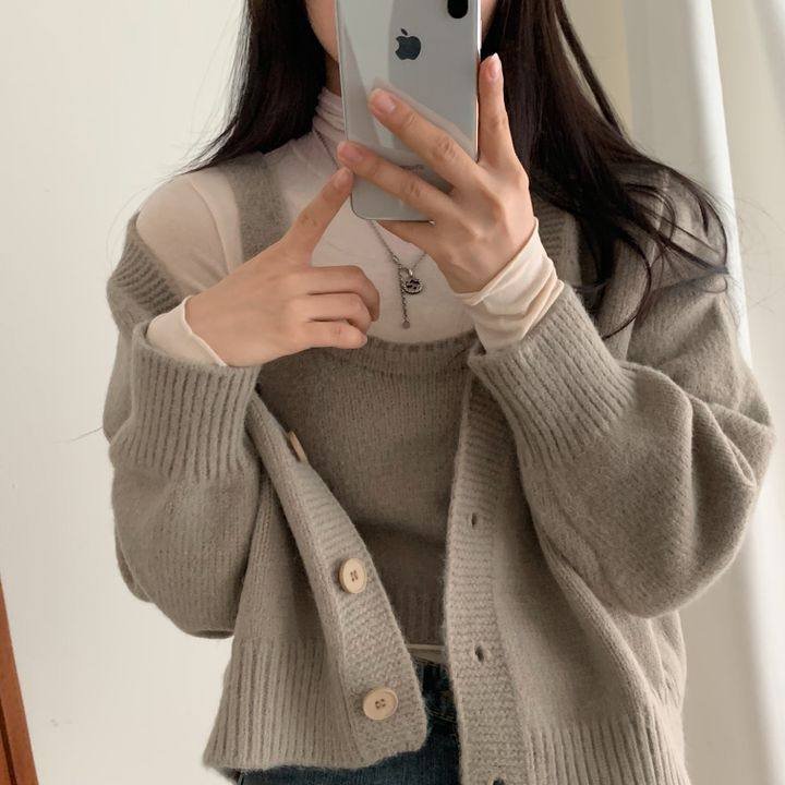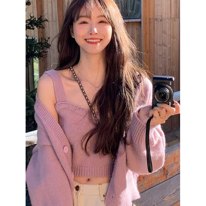 斬男溫柔小香風純色毛衣外套女2025年春秋新款背心針織開衫兩件套