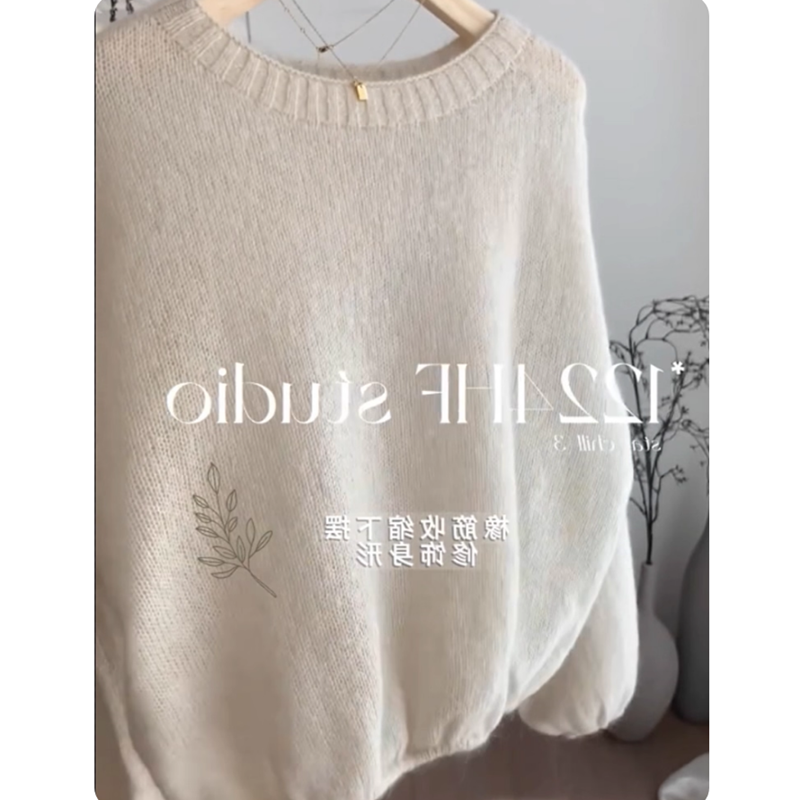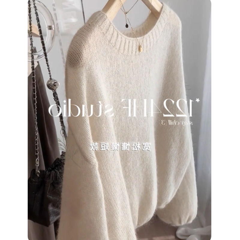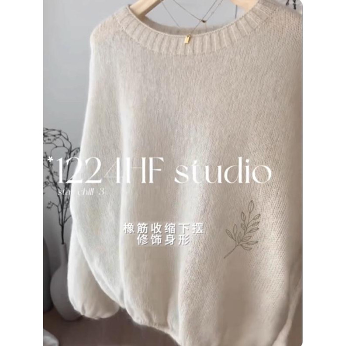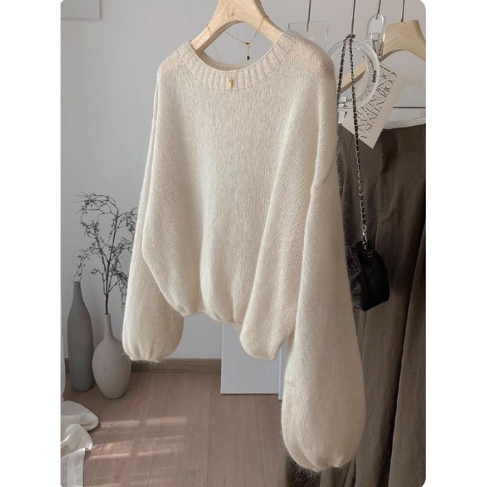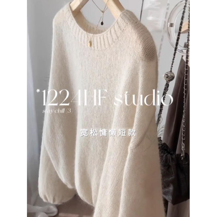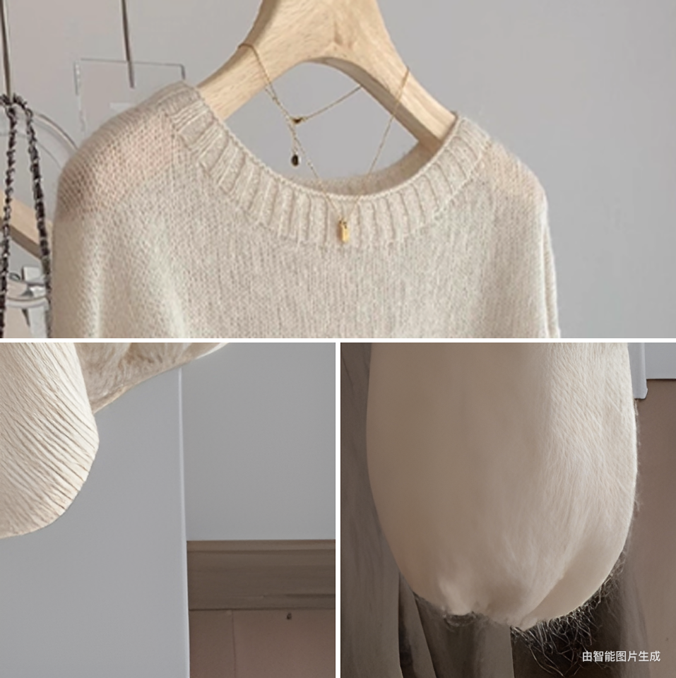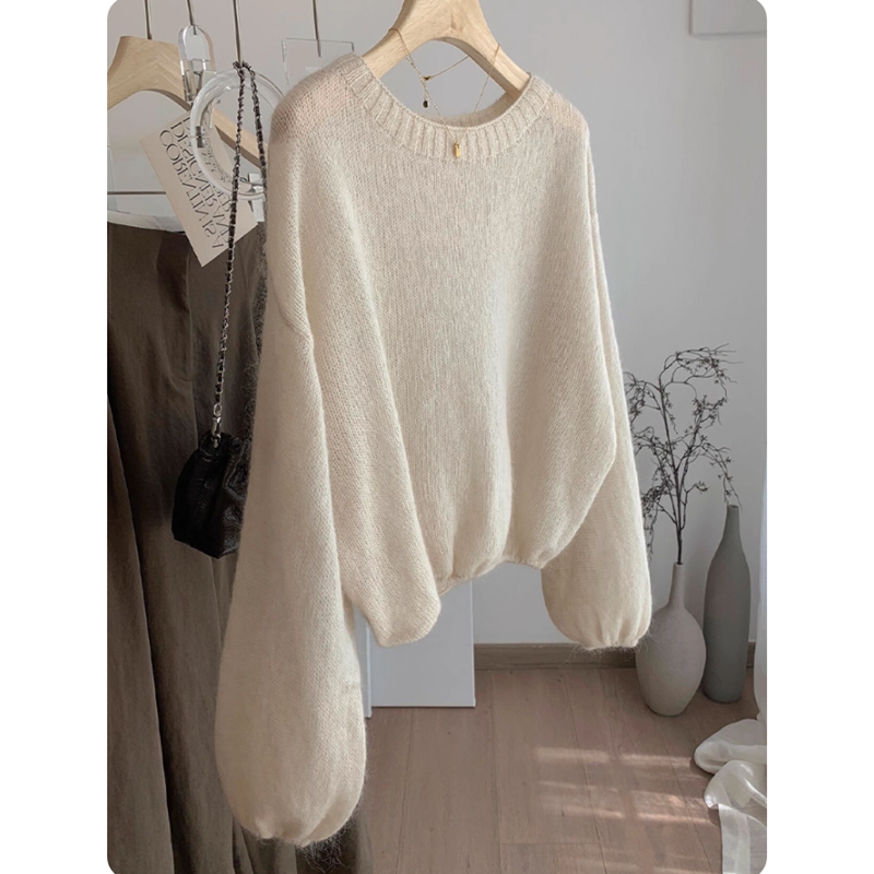 單品質,早秋溫柔氣質米杏色輕薄寬松燈籠袖短款馬海毛毛衣女