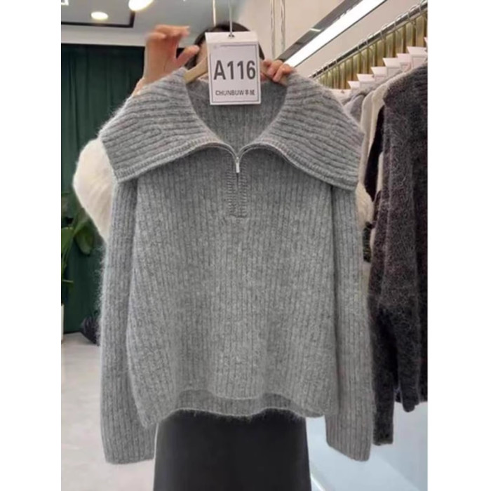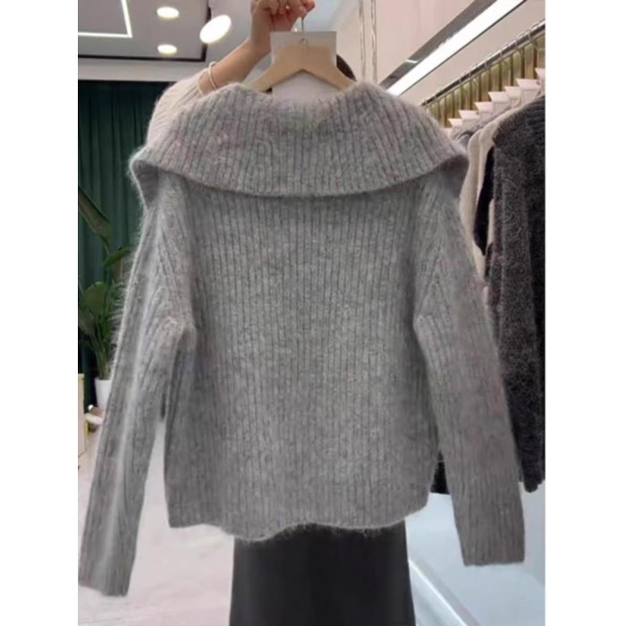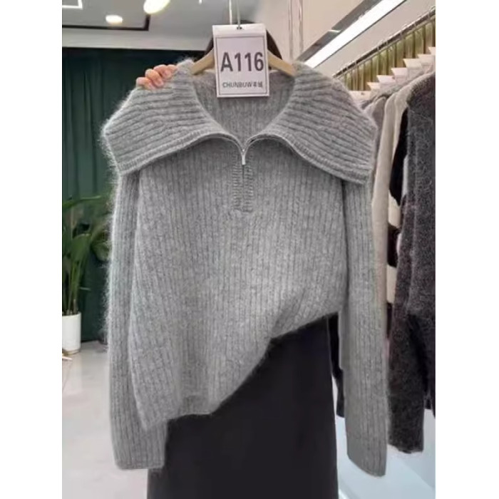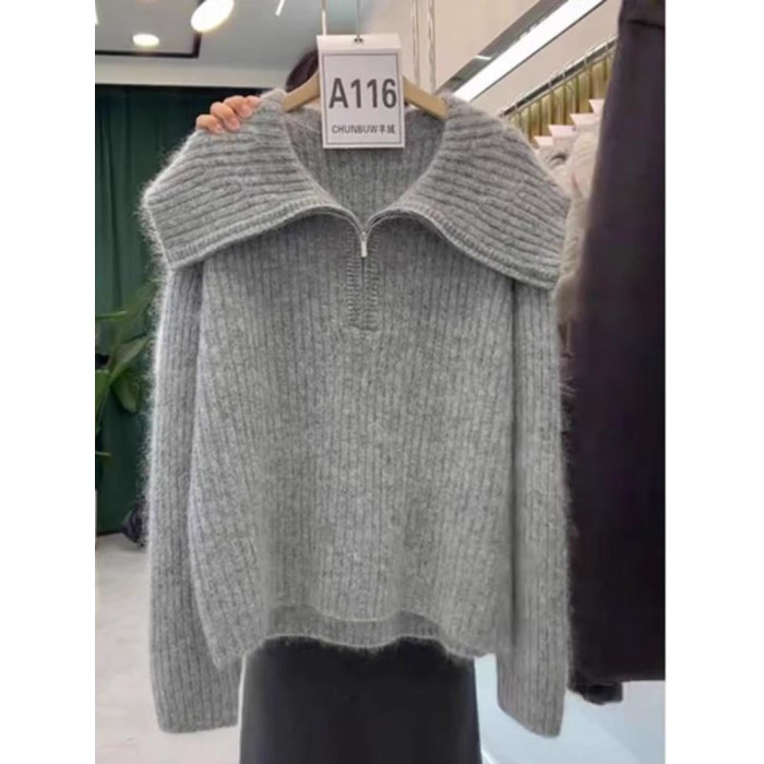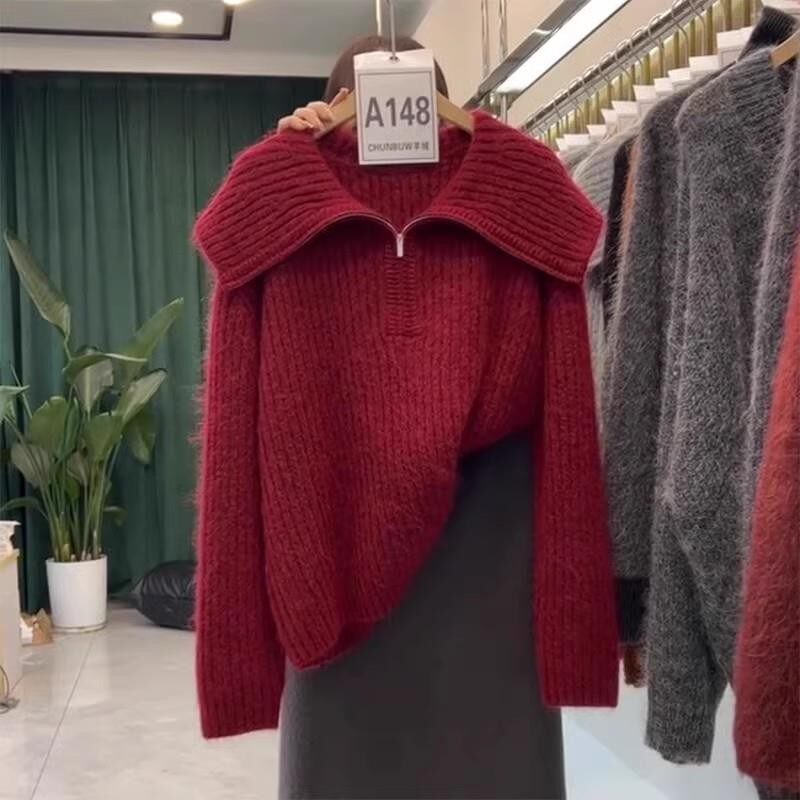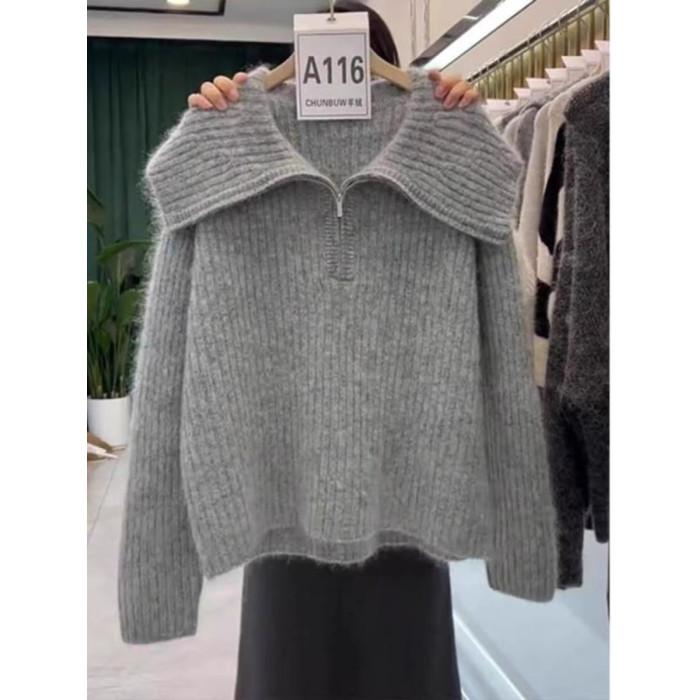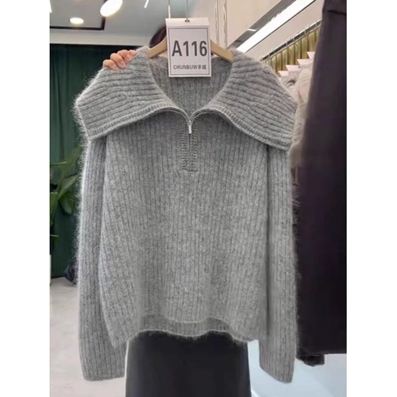 慵懶翻領寬松毛衣針織衫女2025冬季新款大碼胖mm歐貨長袖上衣外穿