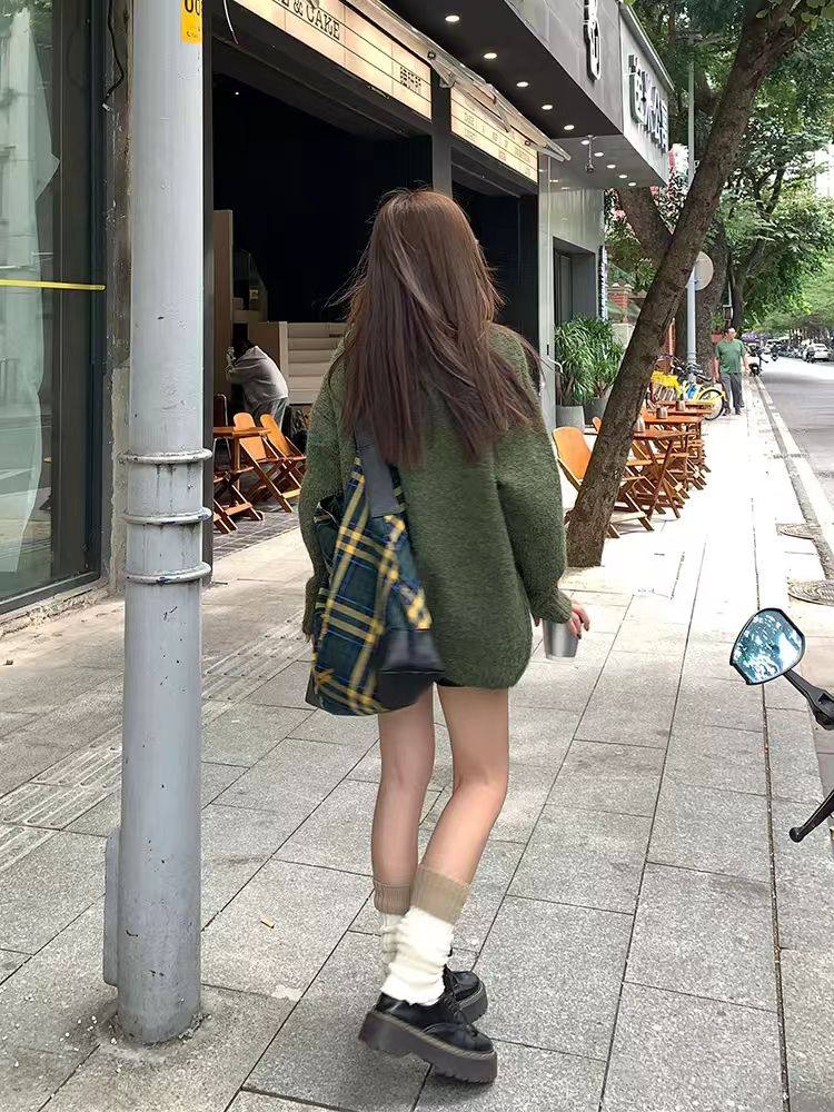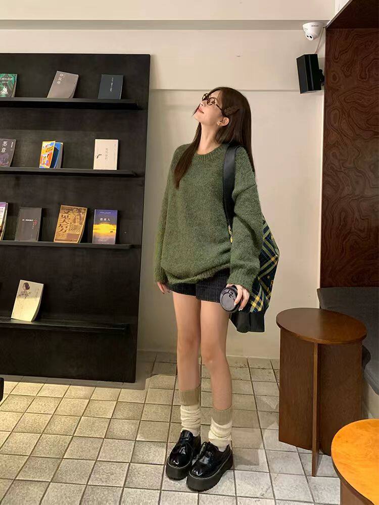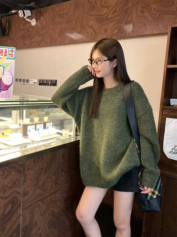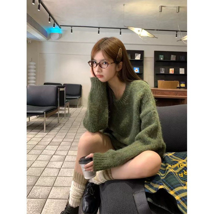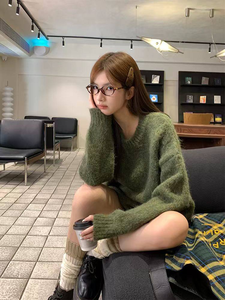 純色港風綠色毛衣女冬季2024新款慵懶風軟糯設計感針織衫套頭上衣