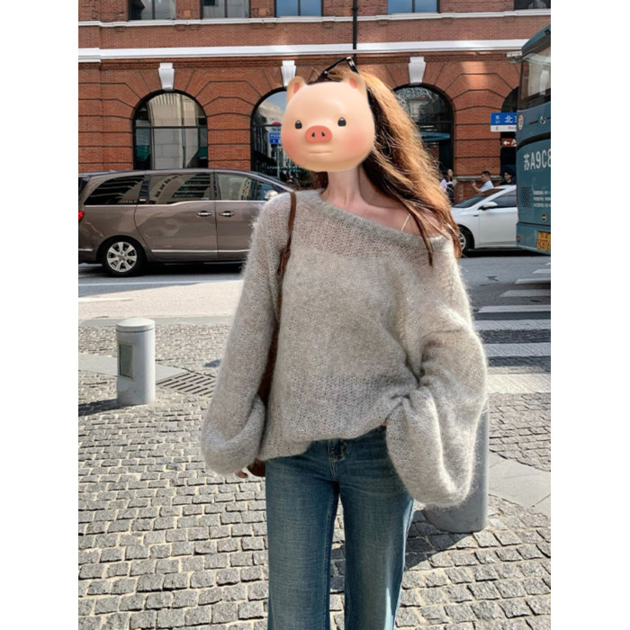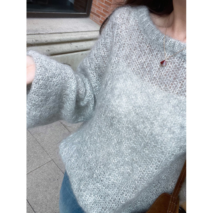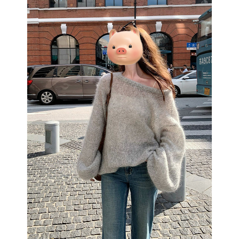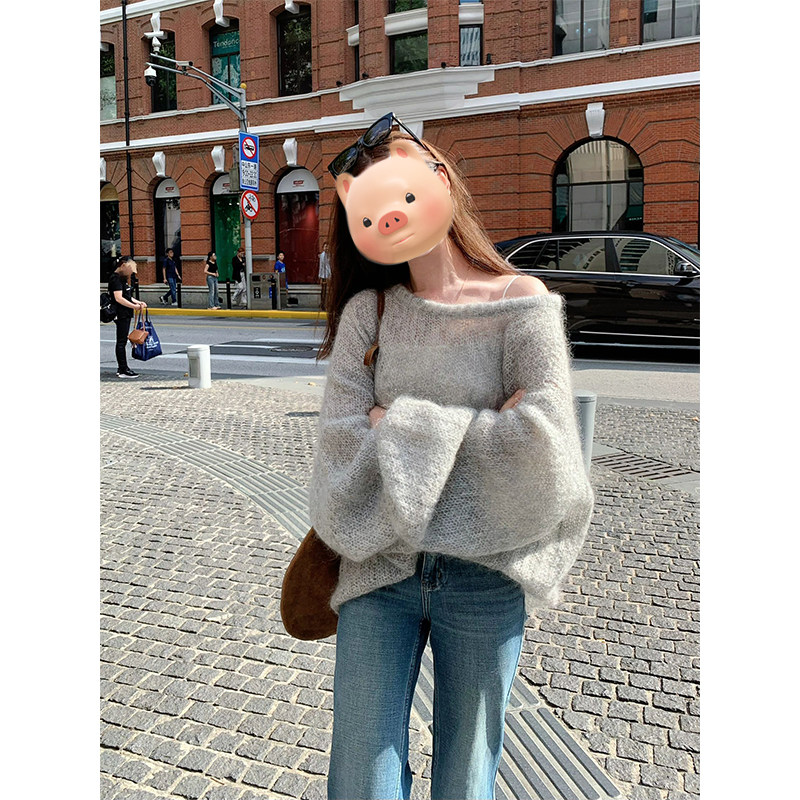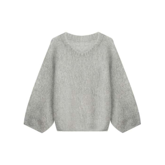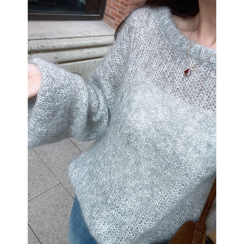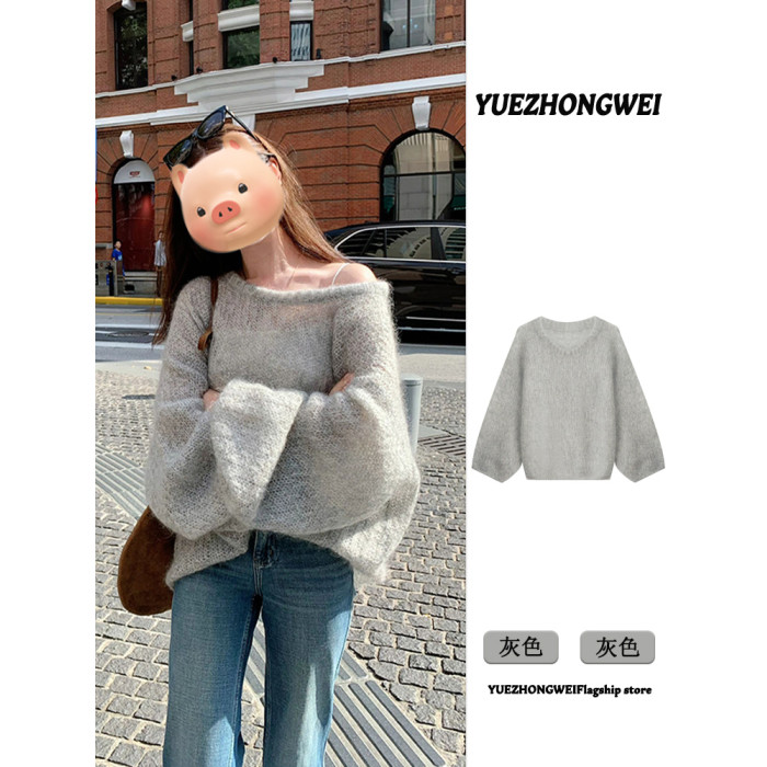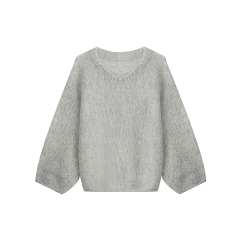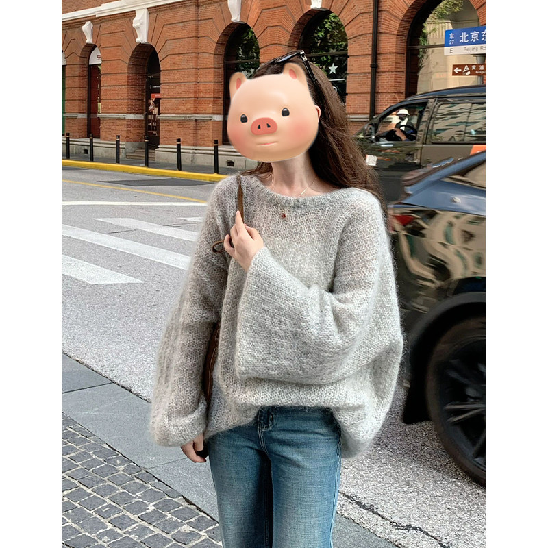 灰色圓領套頭軟糯馬海毛毛衣女款2025新款秋冬季慵懶風針織衫上衣