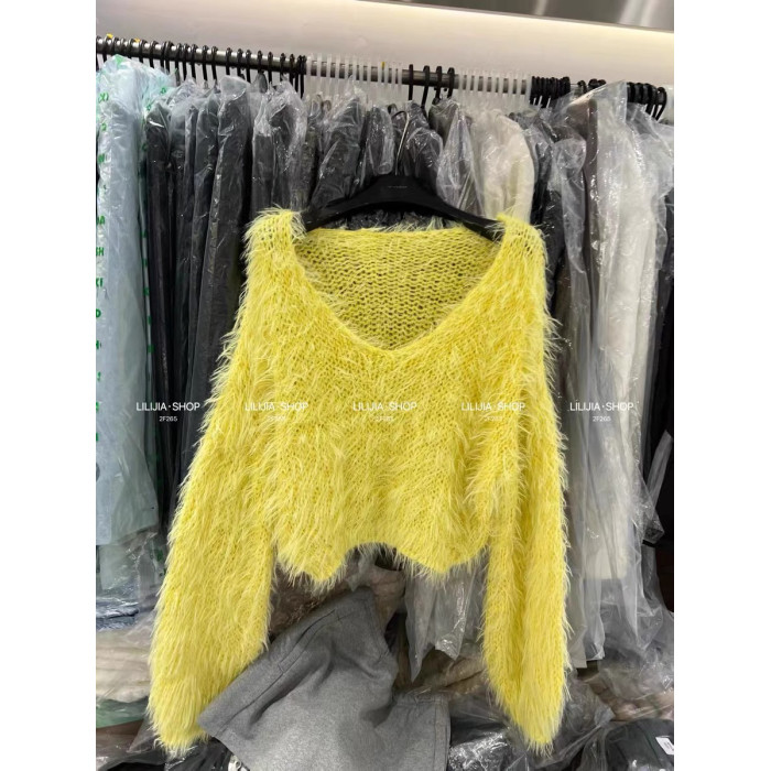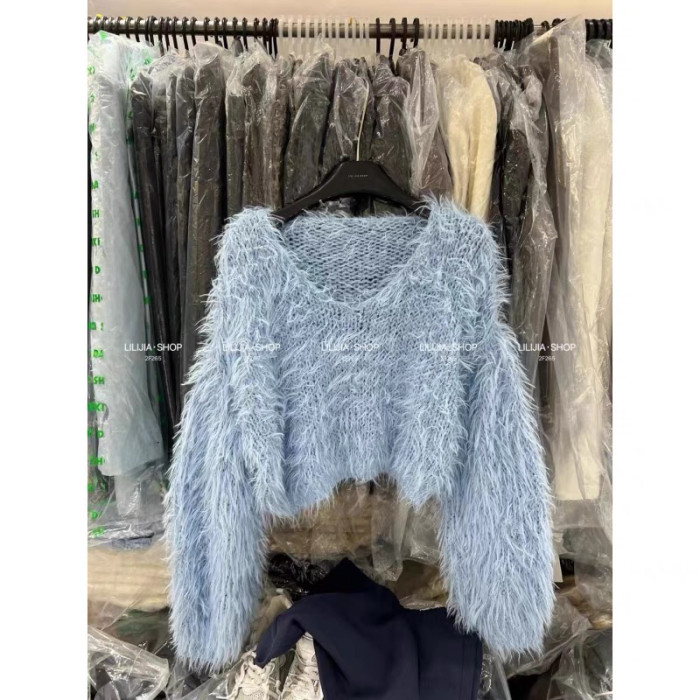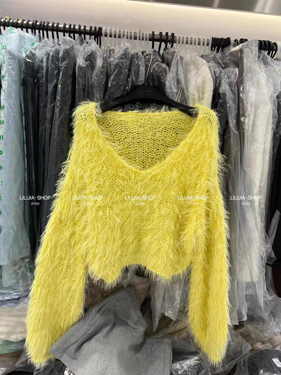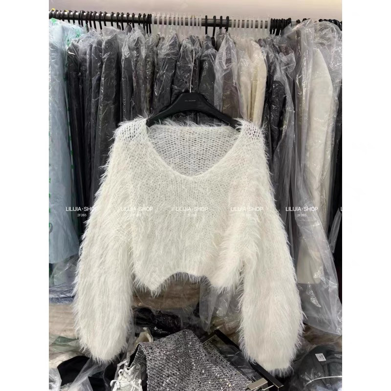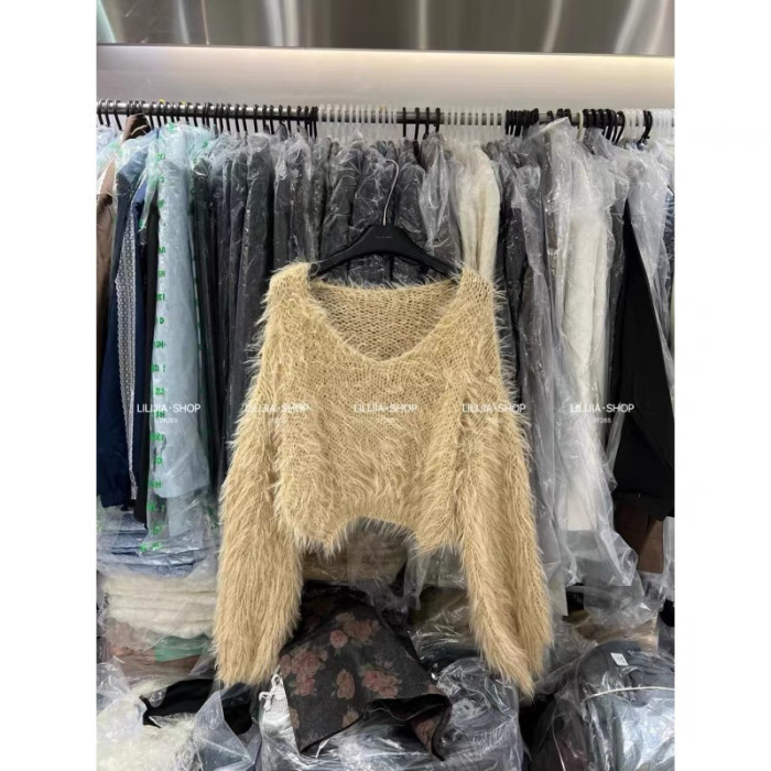 慵懶毛衣女時尚設計感毛絨V領針織衫寬松短款上衣