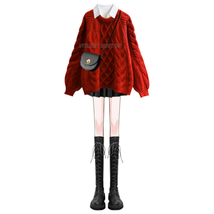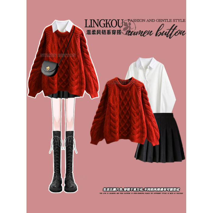 大碼女冬裝新年套裝胖mm顯瘦遮肉聖誕節紅色毛衣襯衫百褶裙兩件套
