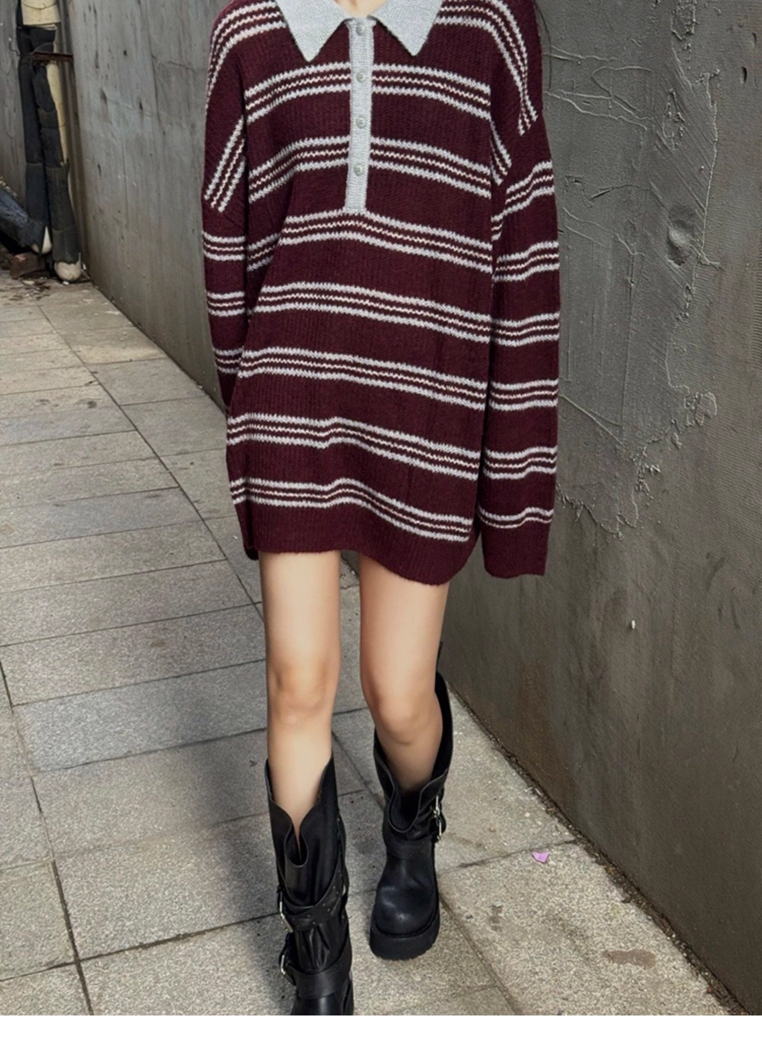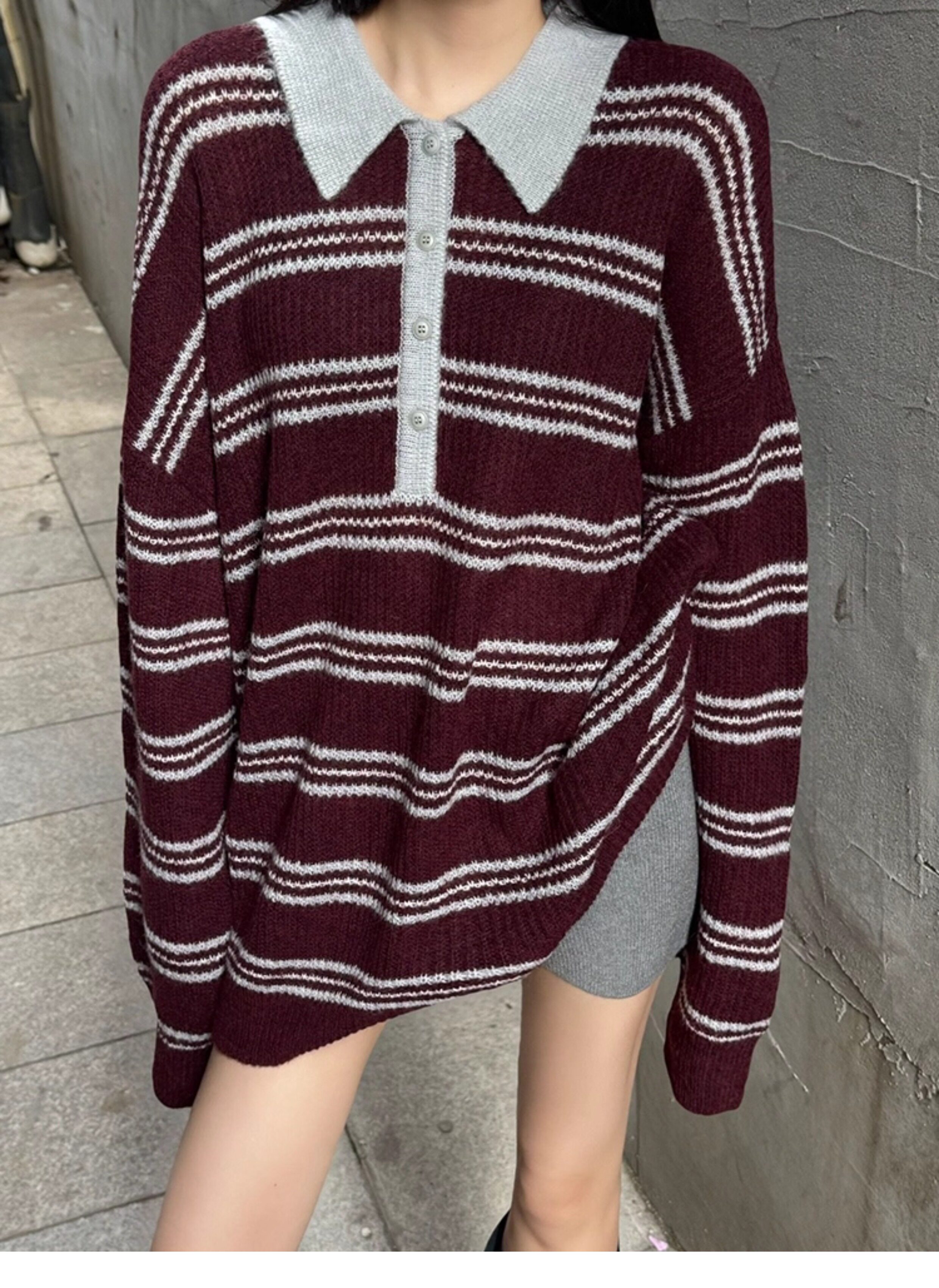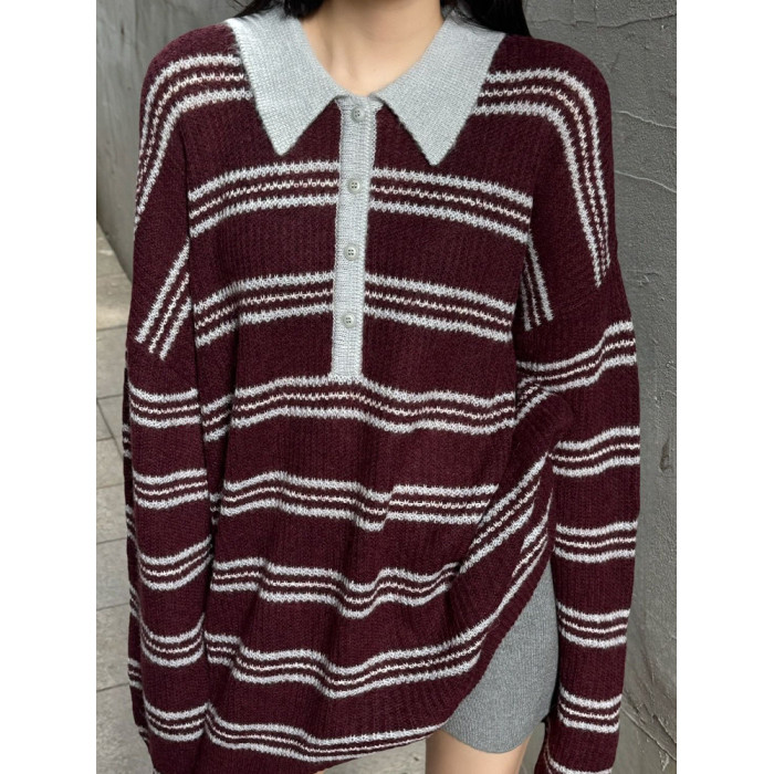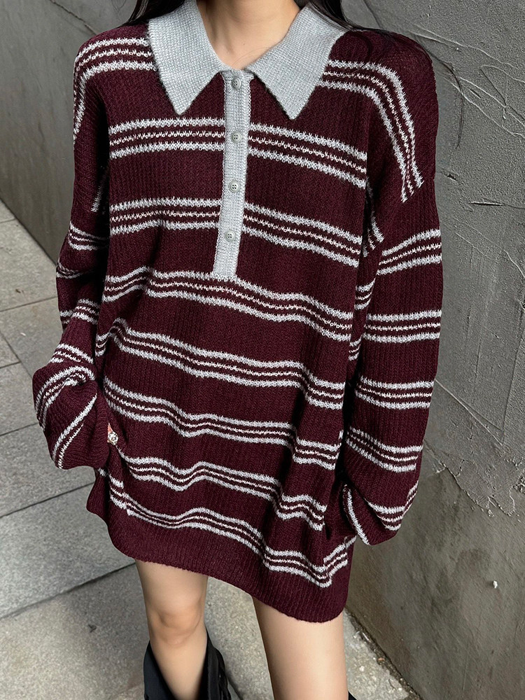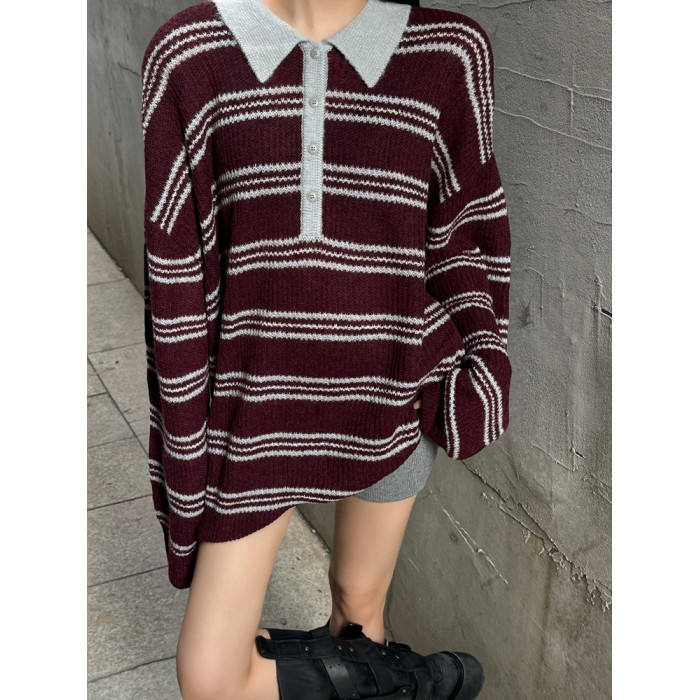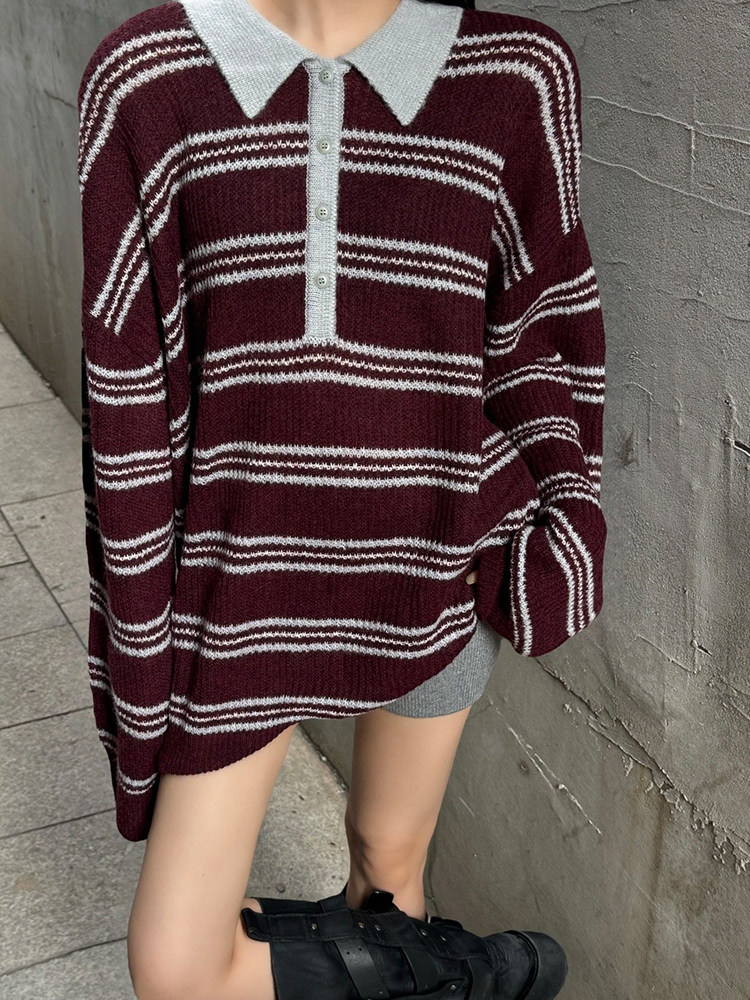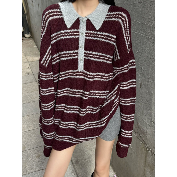 復古法式酒紅色條紋翻領套頭毛衣女秋冬外穿奶呼呼軟糯針織衫上衣