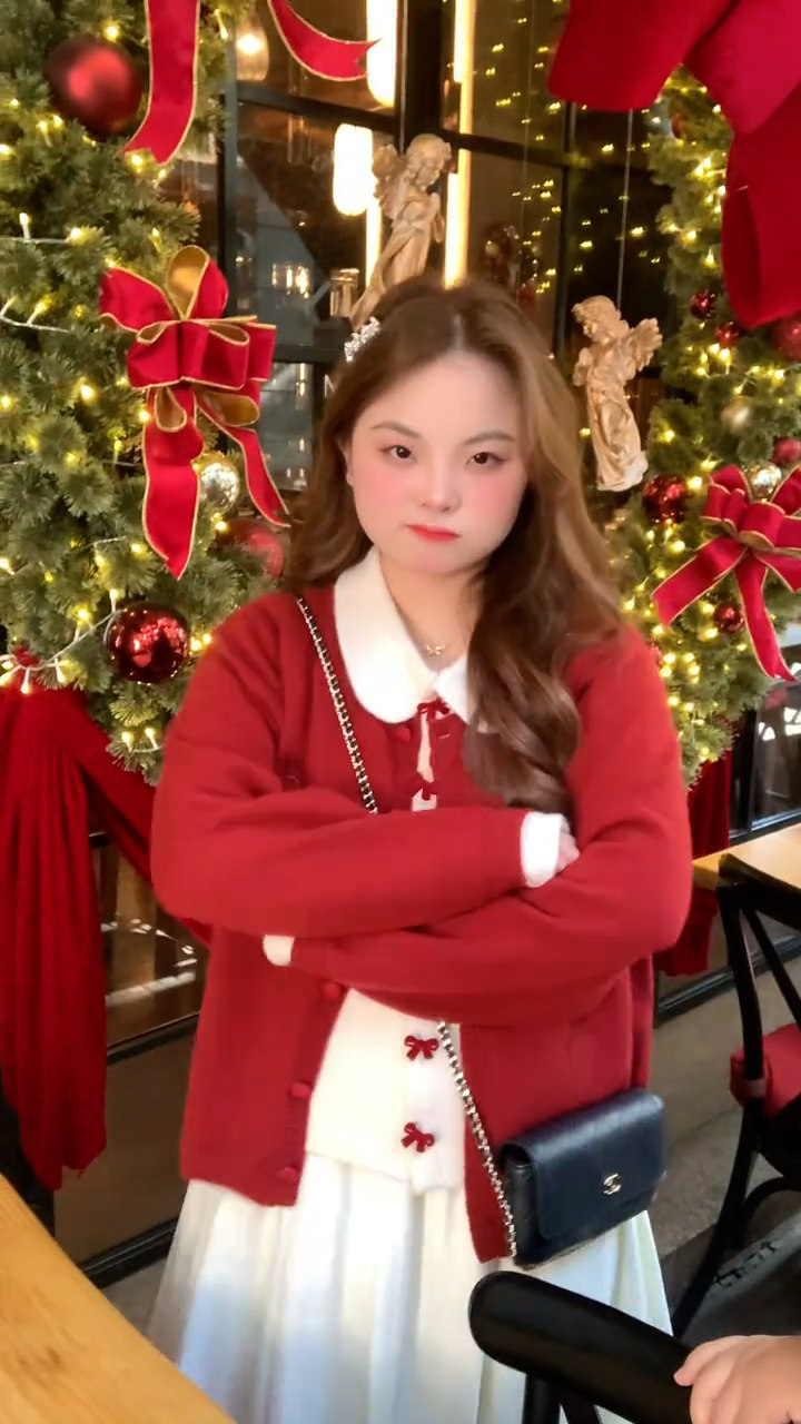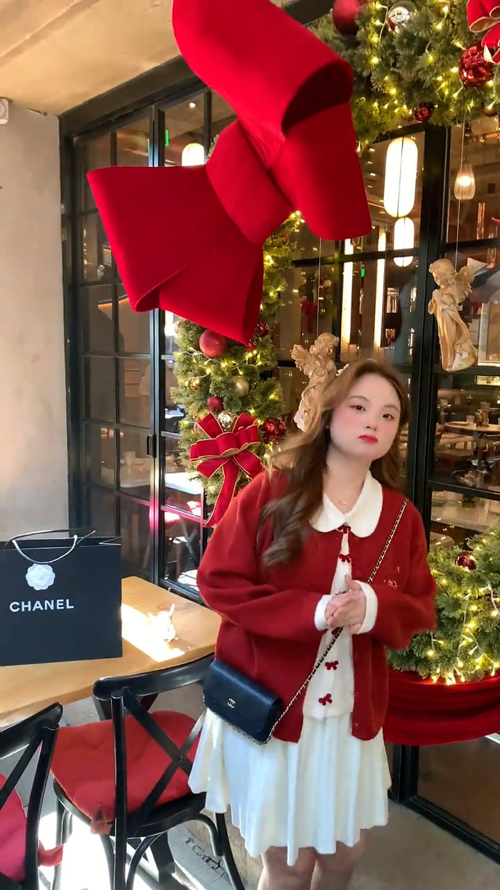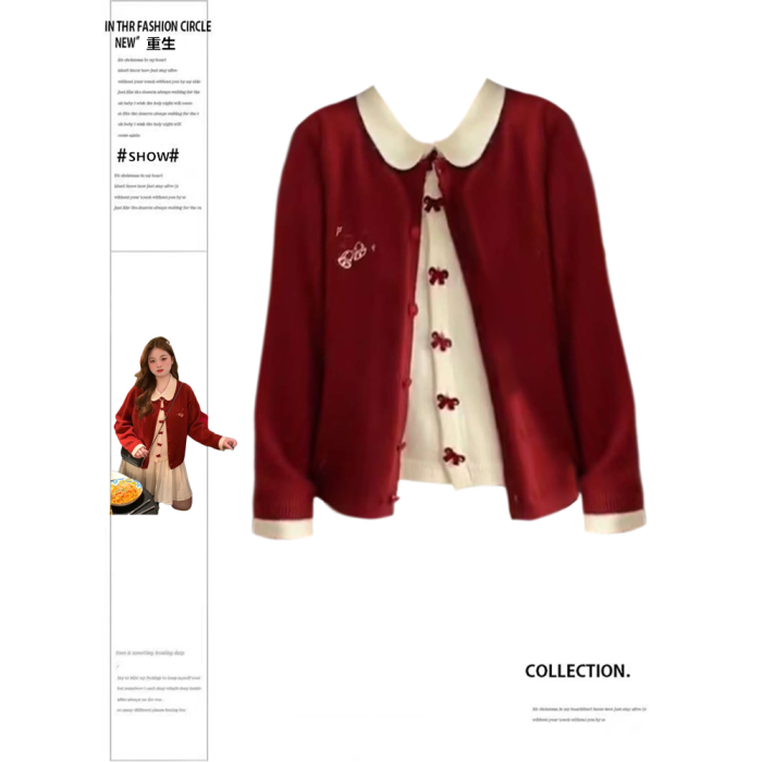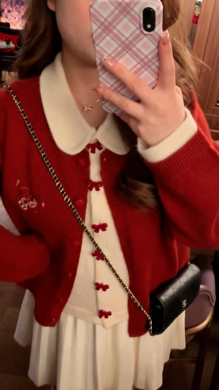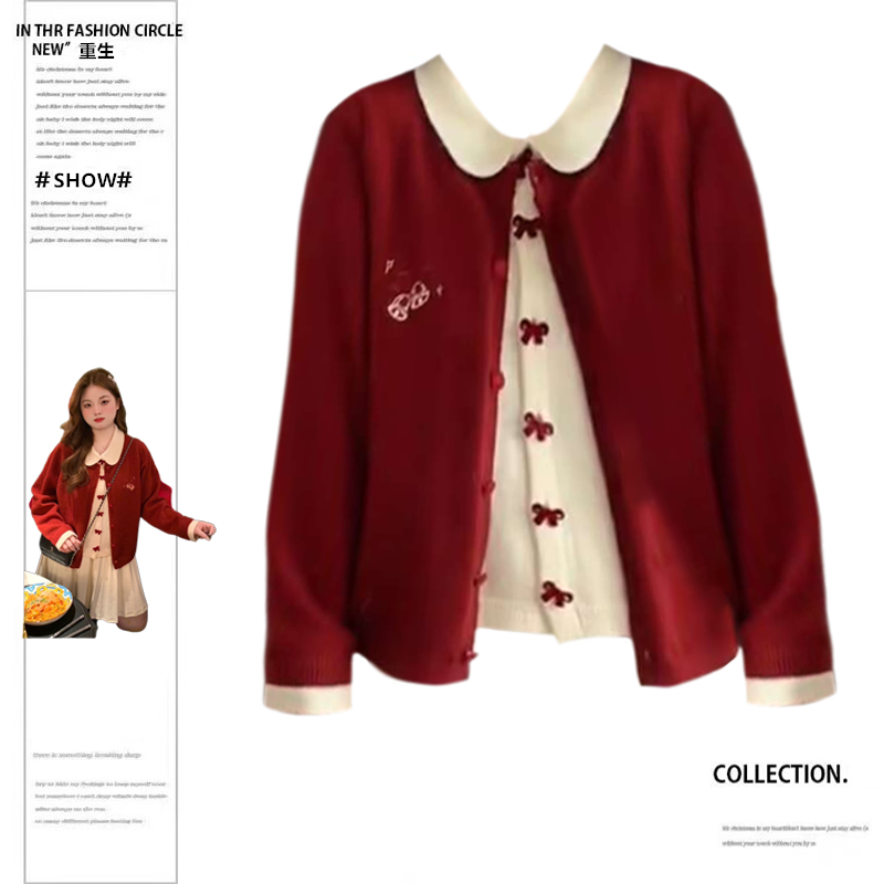 重生微胖MM紅色聖誕節穿搭針織開衫女秋冬季新款慵懶風蝴蝶結上衣