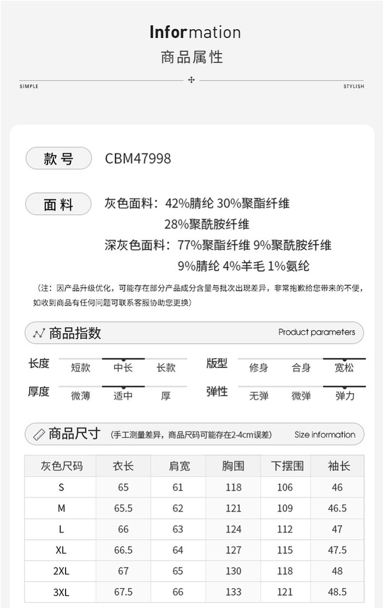 | 材質成分 | 聚丙烯腈纖維(腈綸)42% 聚酯纖維30% 聚醯胺纖維(錦綸)28% |