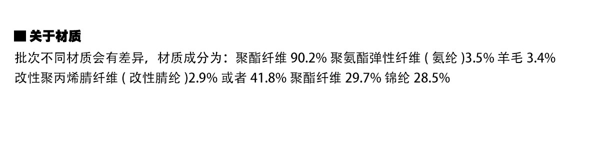 材質成分 聚對苯二甲酸乙二酯(滌綸)49% 聚丙烯腈纖維(腈綸)32% 聚酯纖維10% 綿羊毛9%