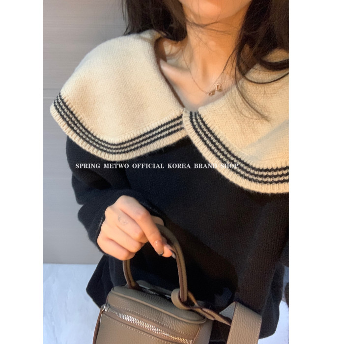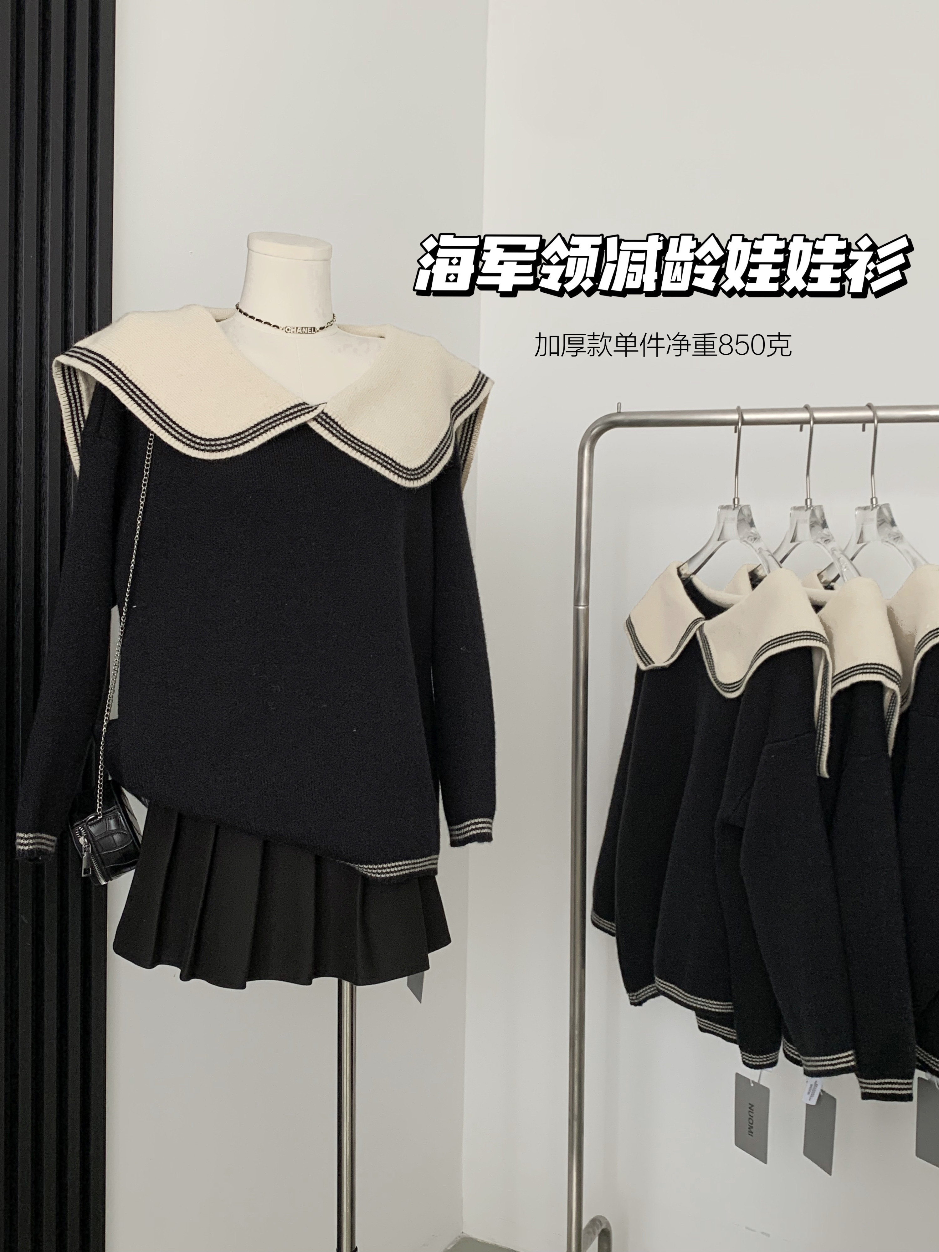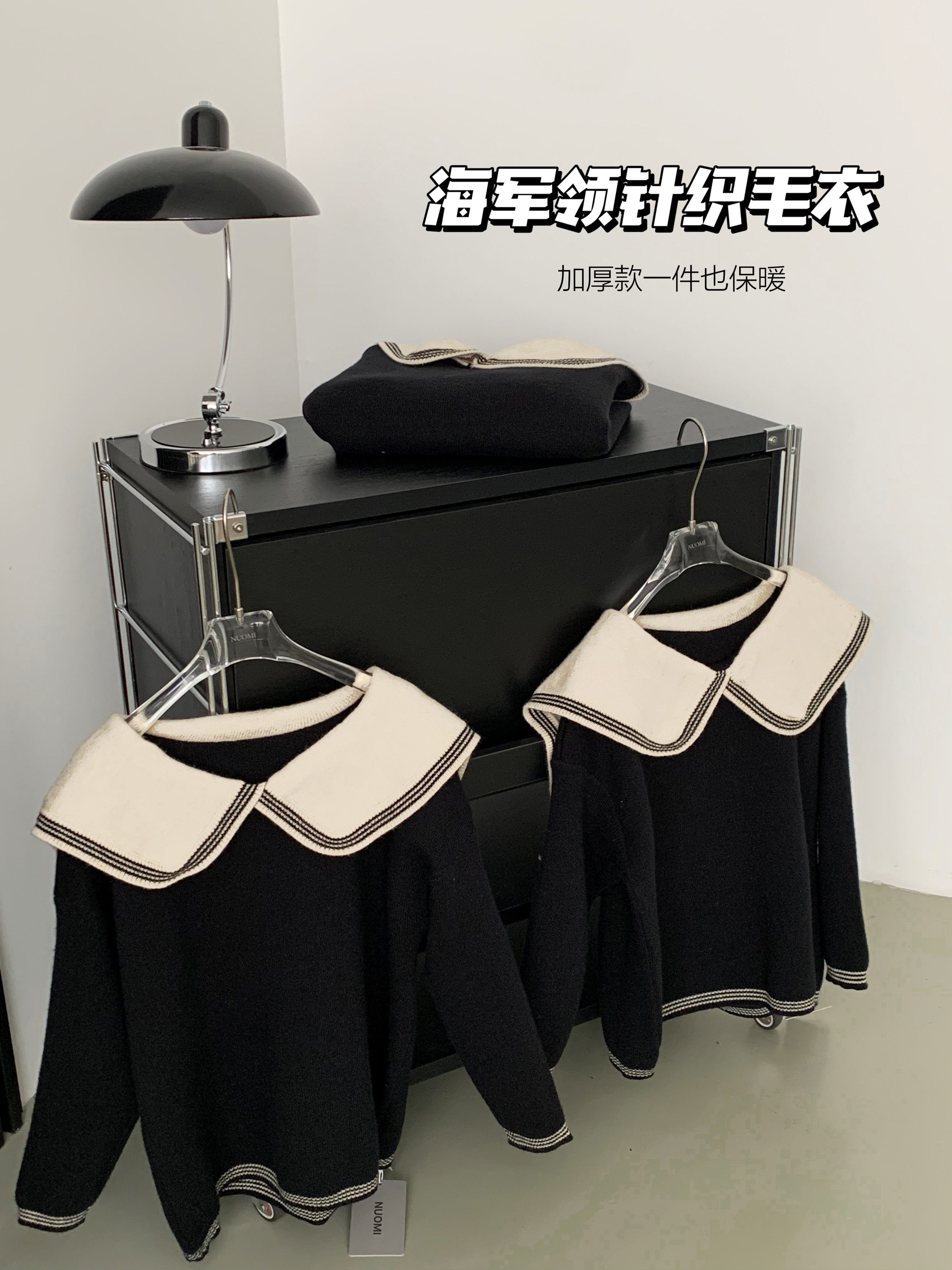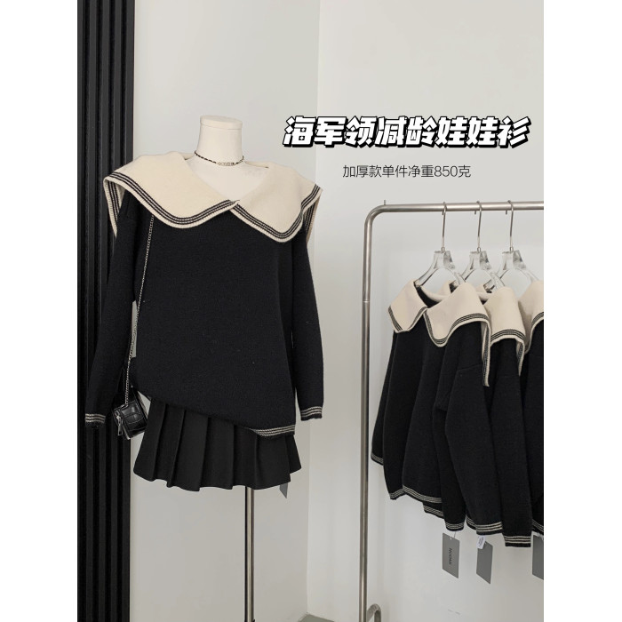 法式溫柔娃娃領學院風海軍大翻領慵懶風中長款套頭毛衣女秋冬上衣
