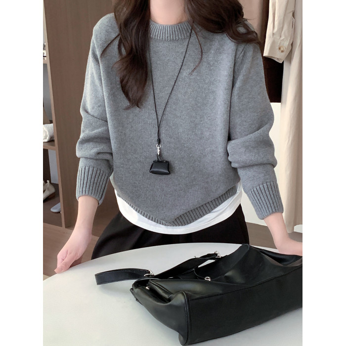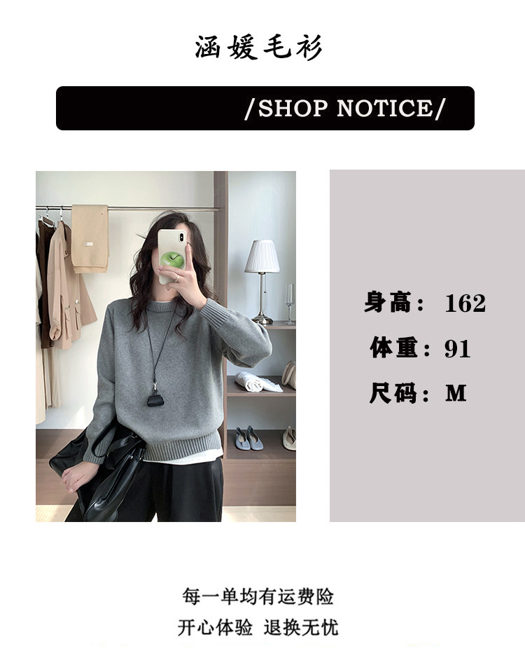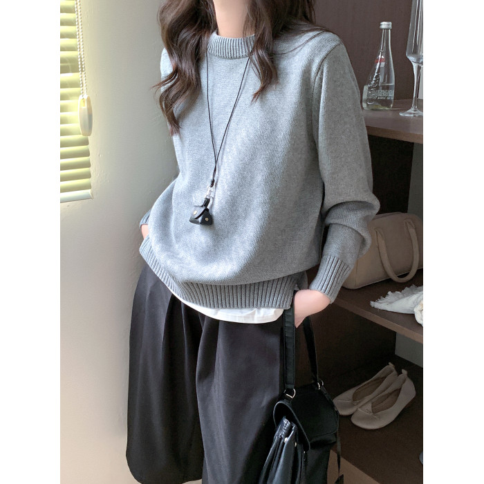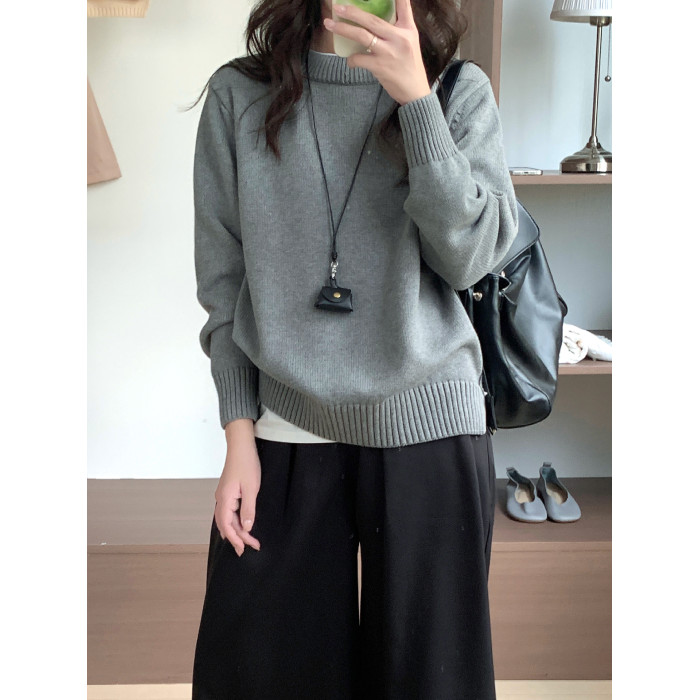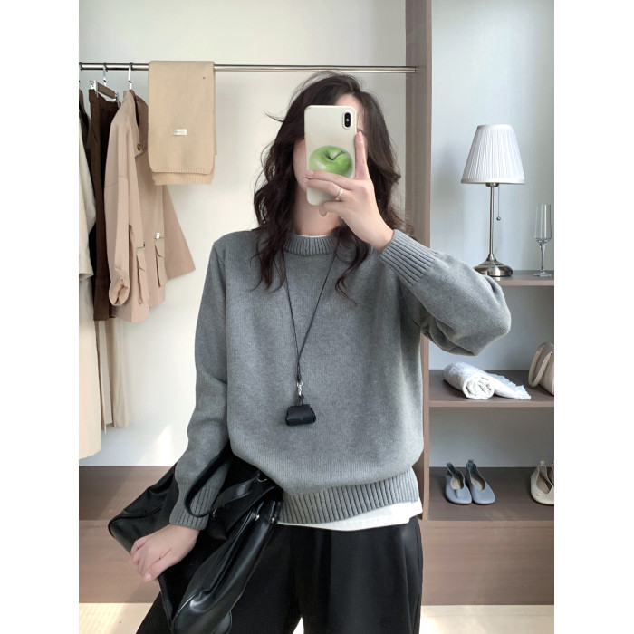 100%棉 純棉圓領毛衣女秋冬新款寬松灰色厚款套頭針織打底衫上衣