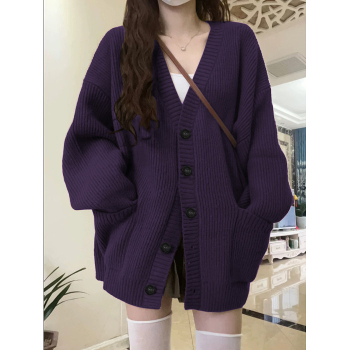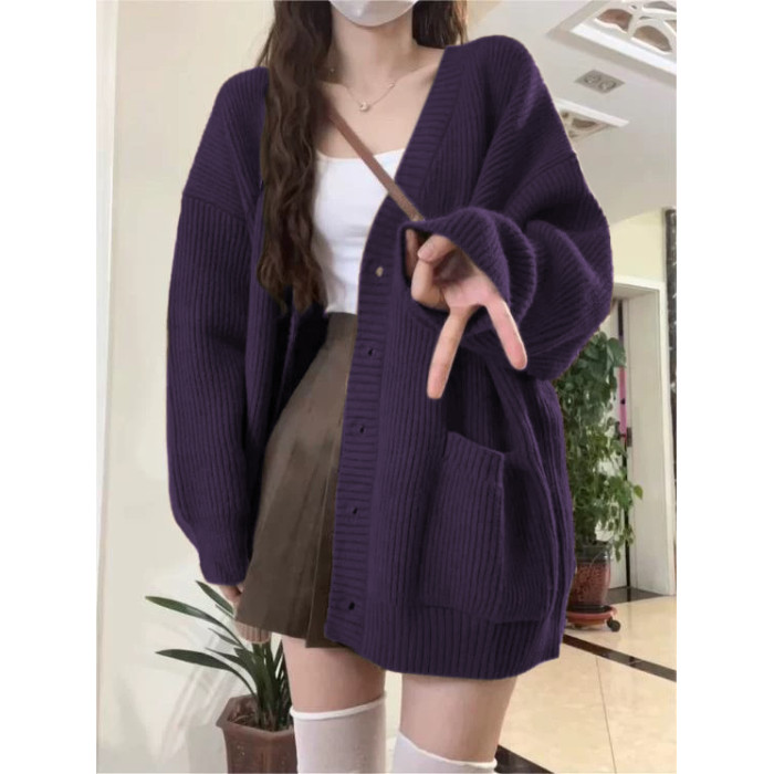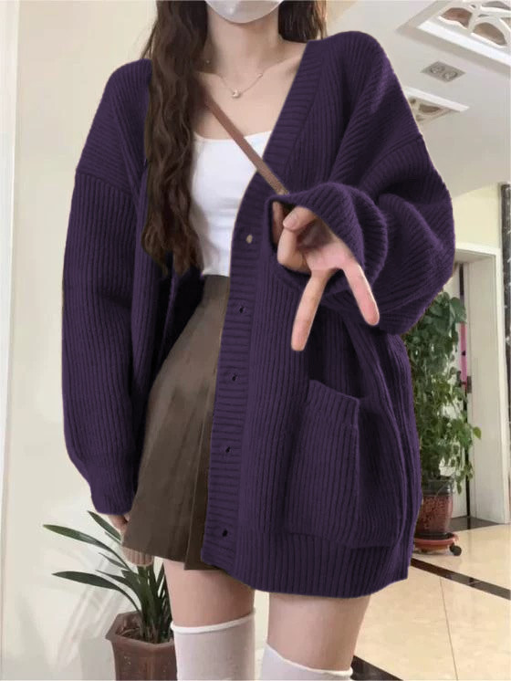 大碼胖MM紫色V領毛衣開衫外套女秋冬軟糯慵懶寬松高級感超好針織