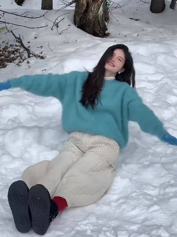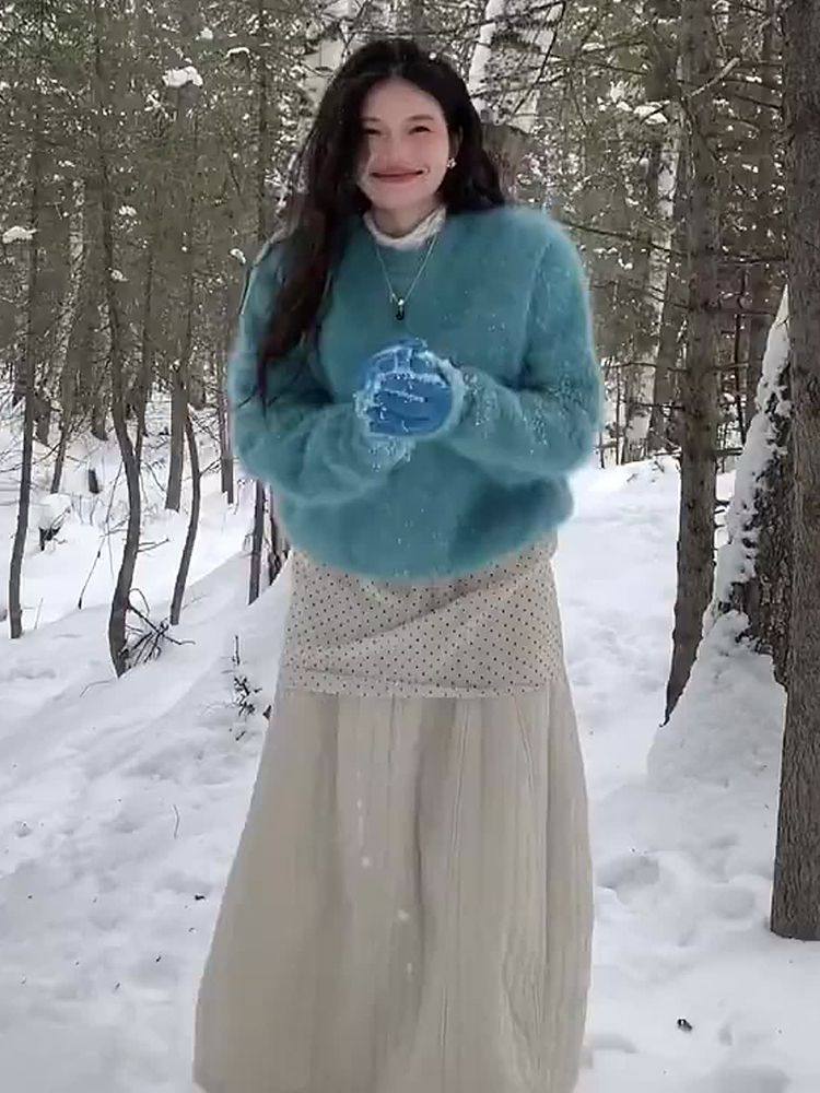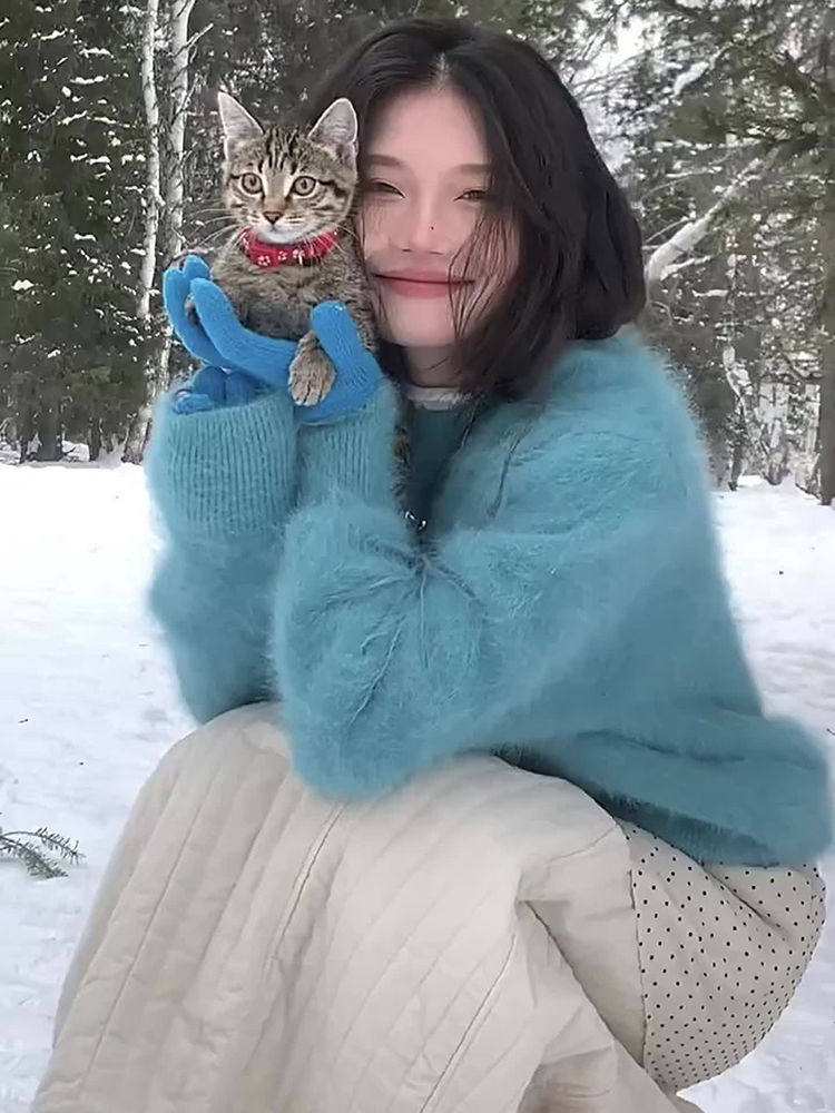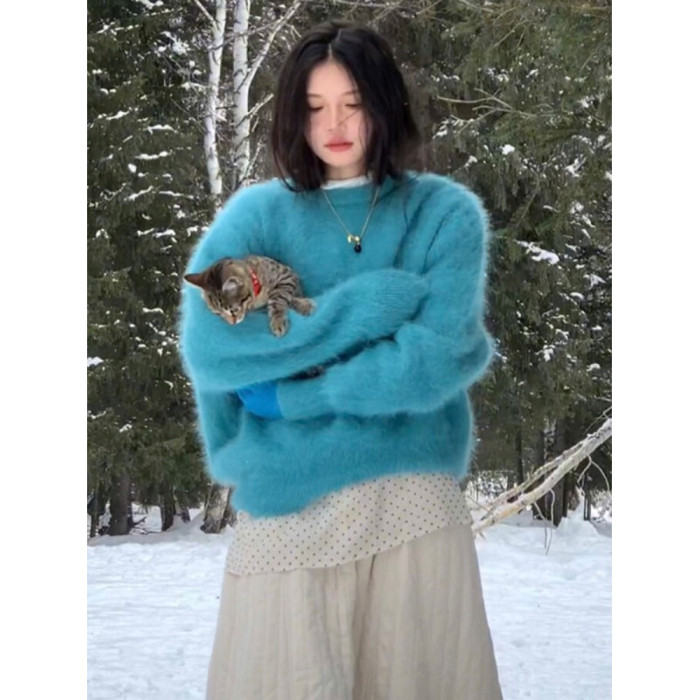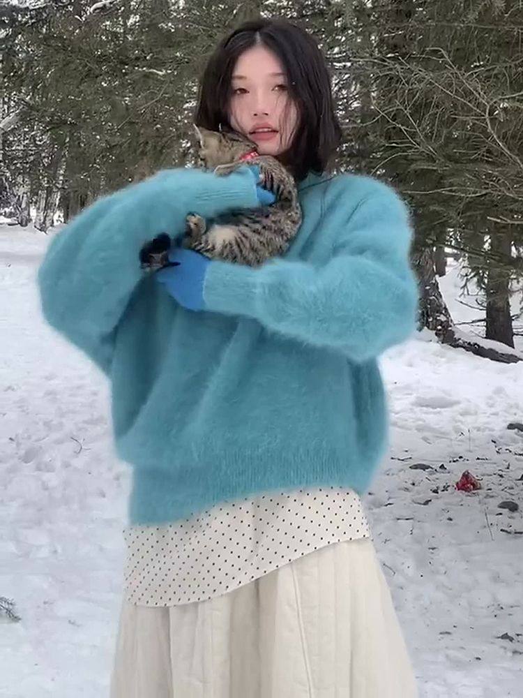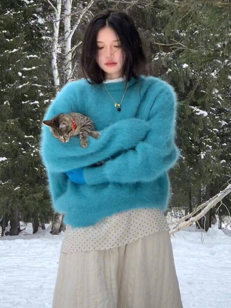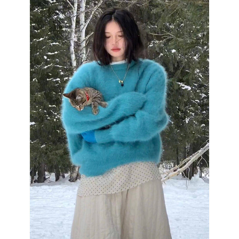 湖藍色仿貂絨軟糯套頭毛衣女秋冬小衆不撞款針織衫顯白毛茸茸上衣