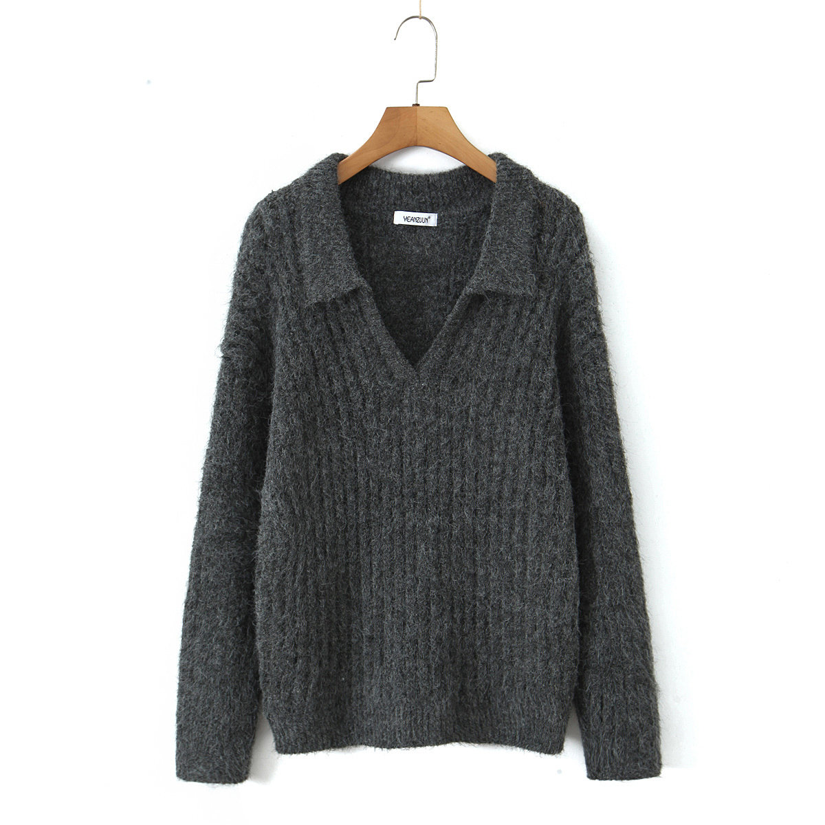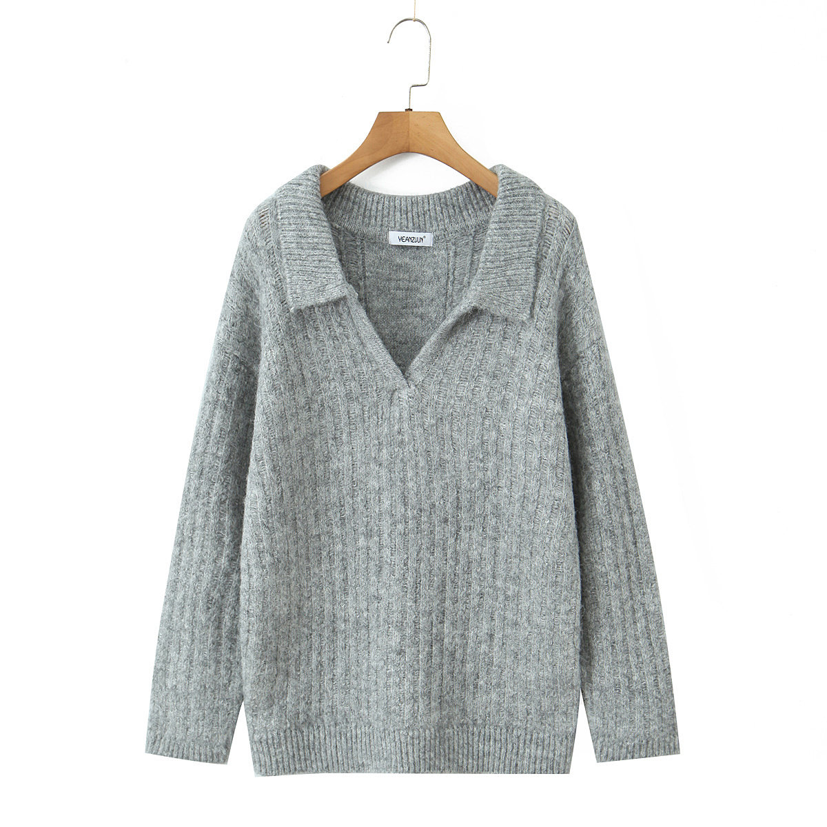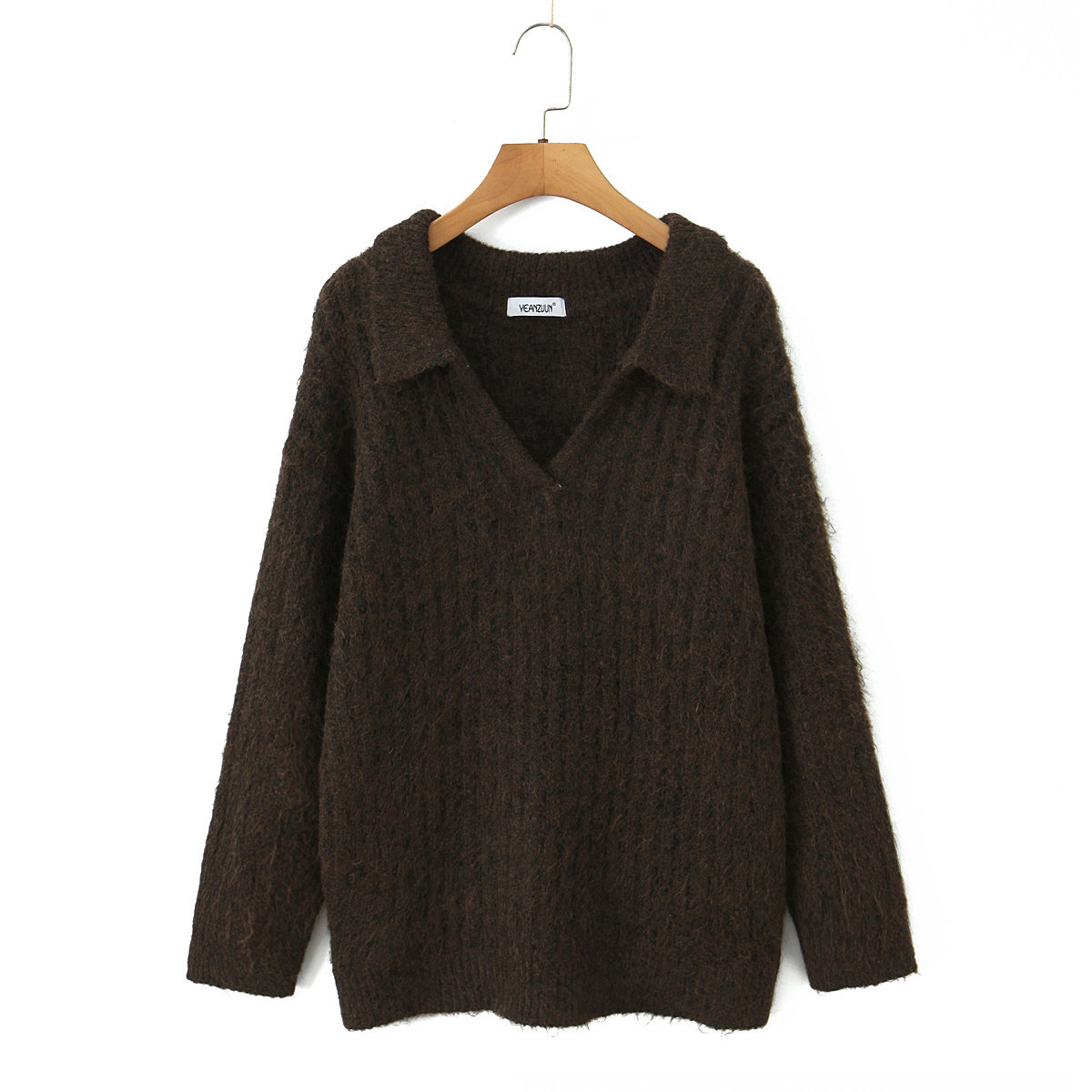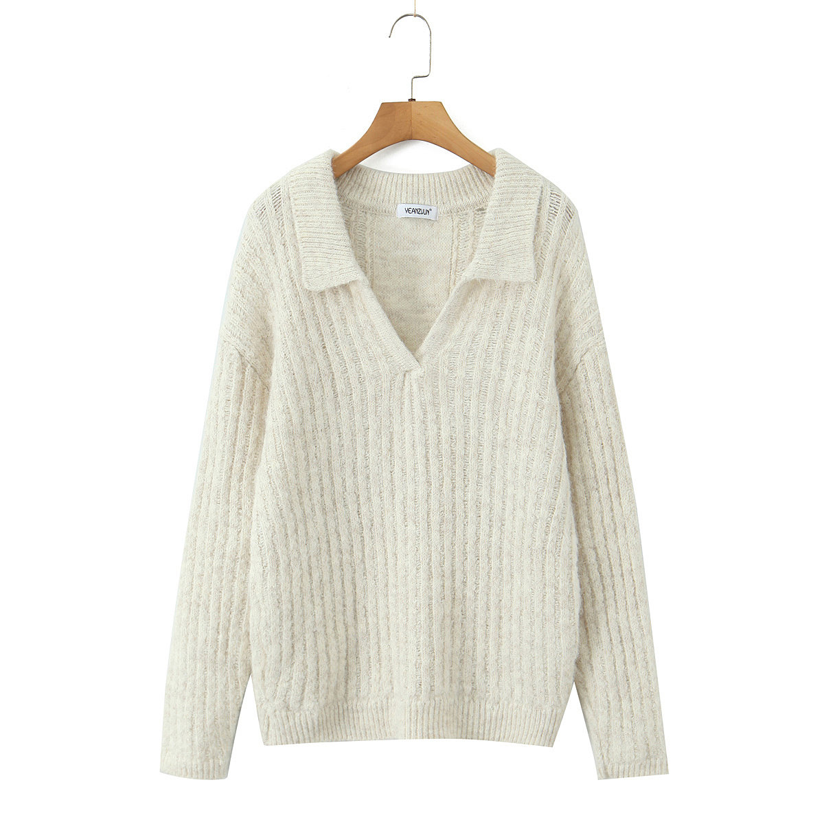 法式簡約慵懶風套頭翻領復古毛衣韓系V領顯瘦打底衫休閒寬松上衣