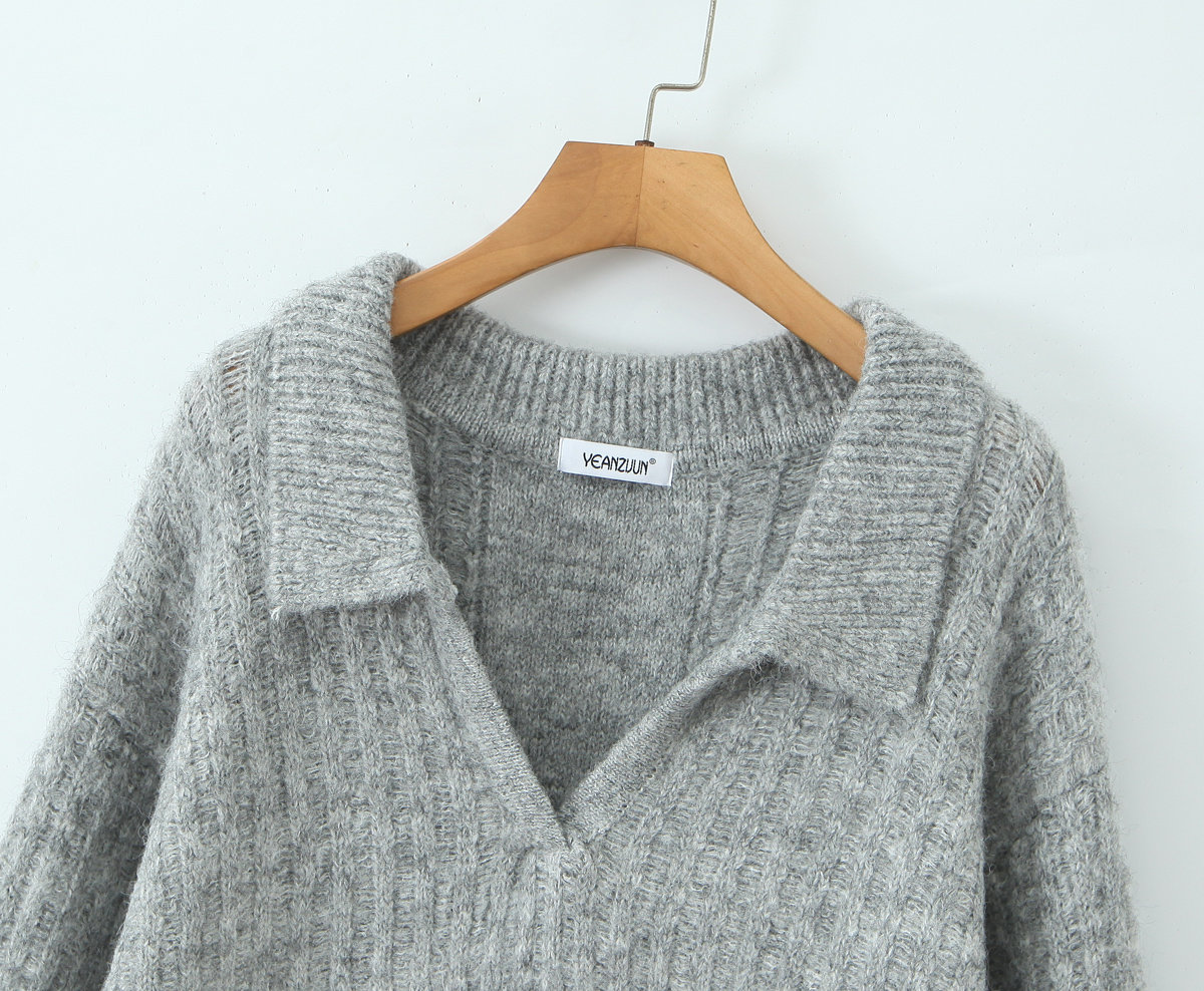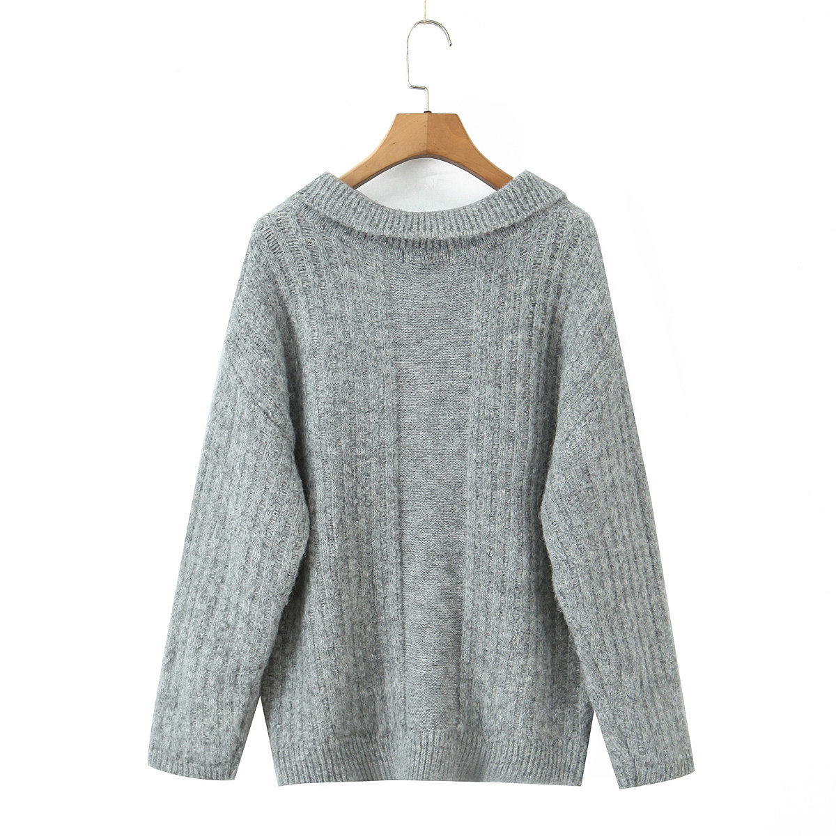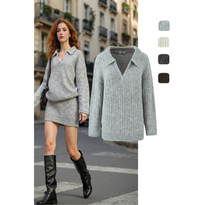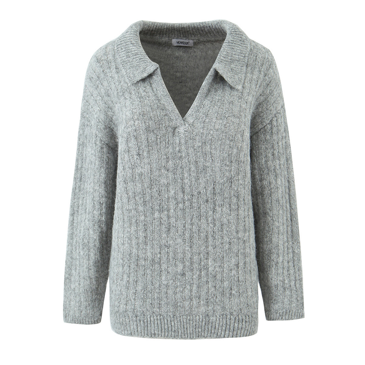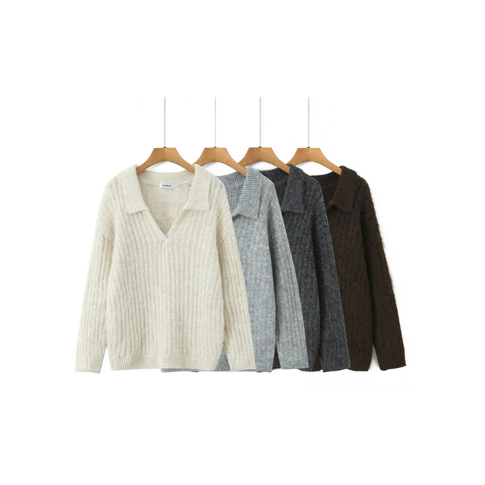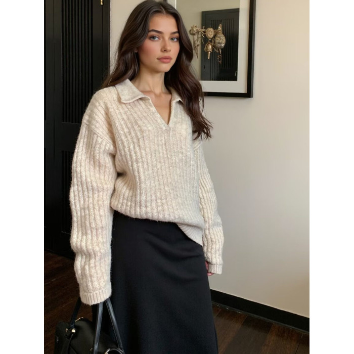 法式簡約慵懶風套頭翻領復古毛衣韓系V領顯瘦打底衫休閒寬松上衣
