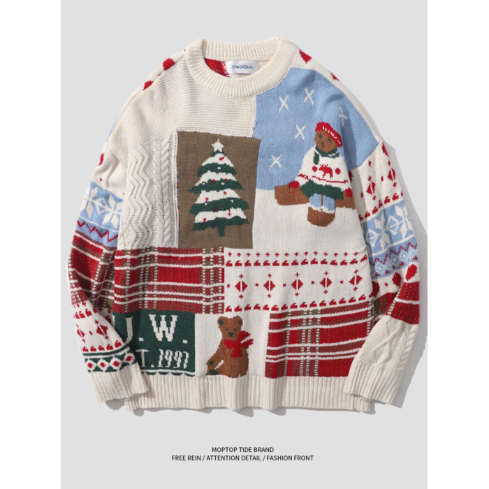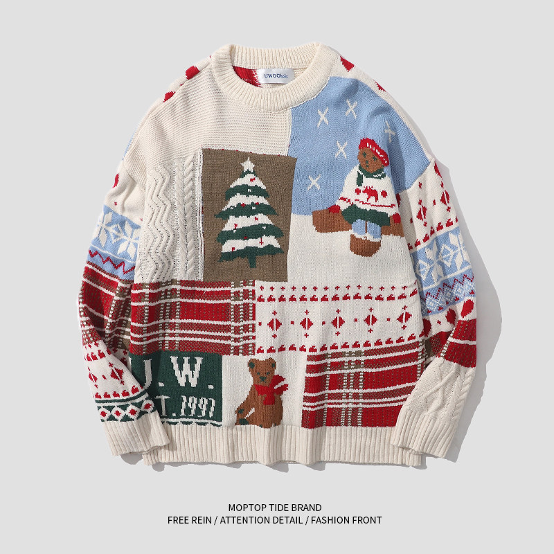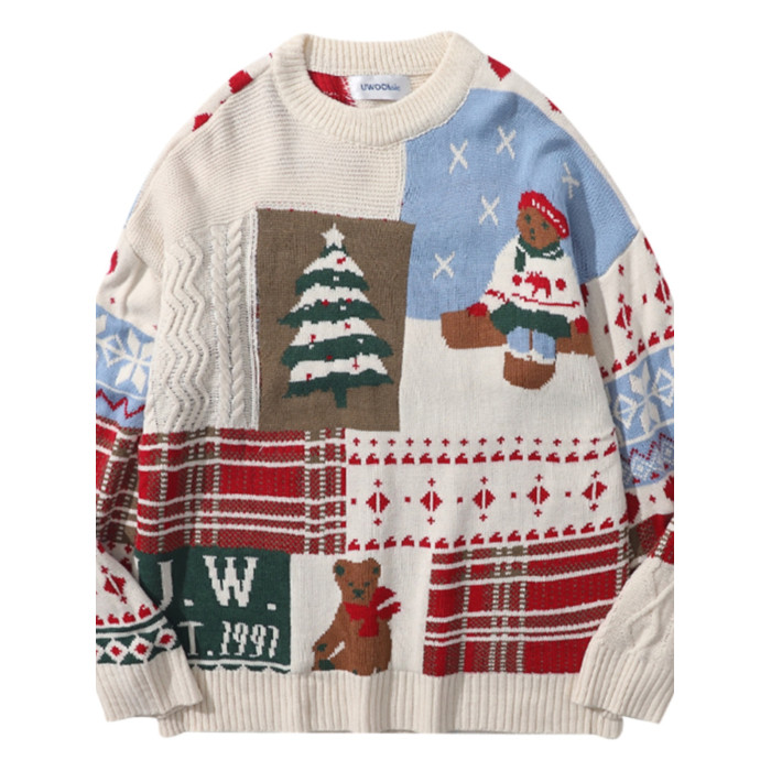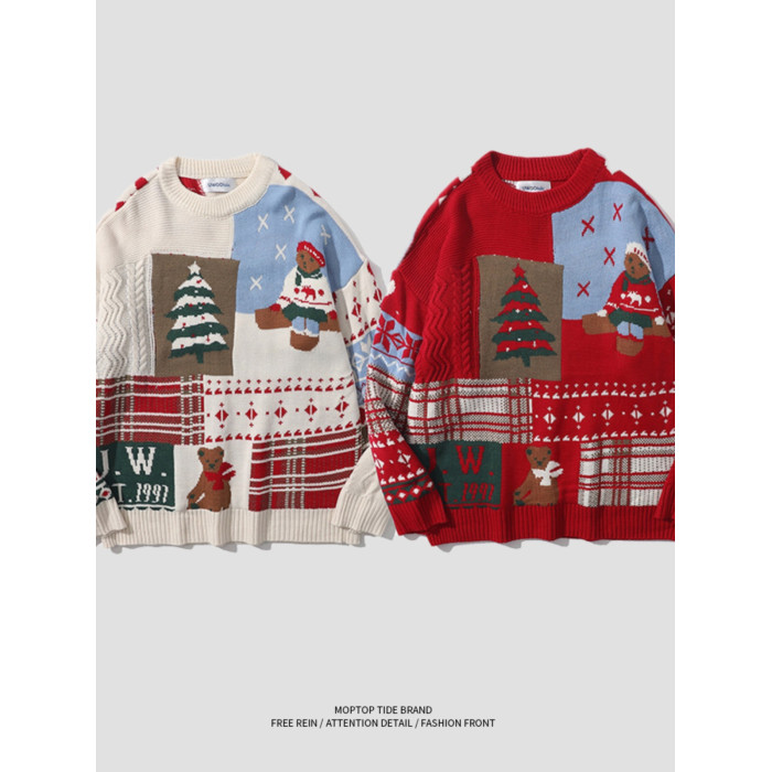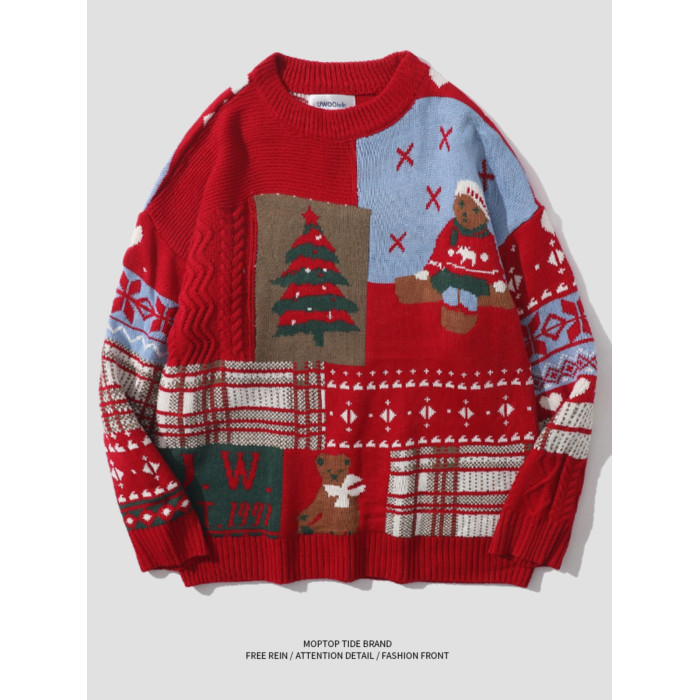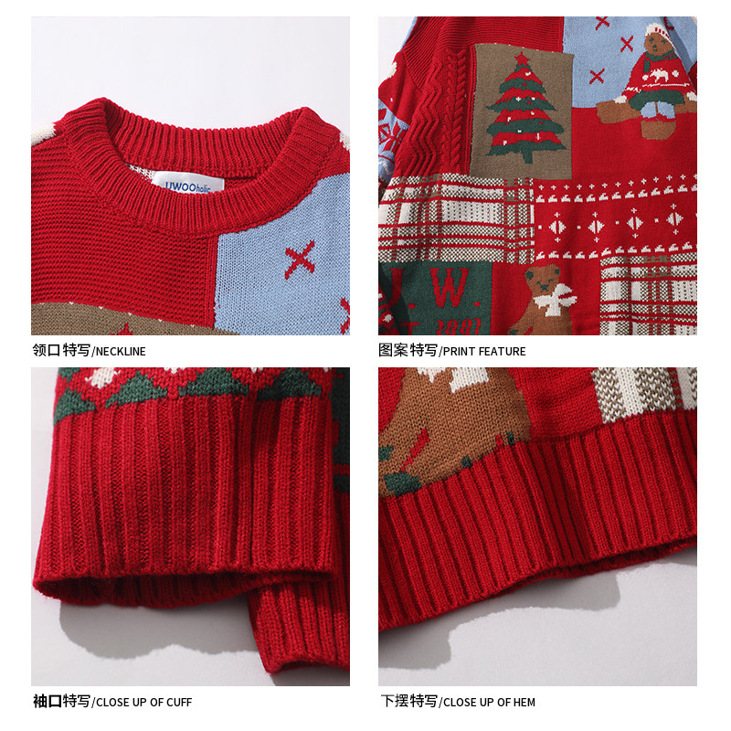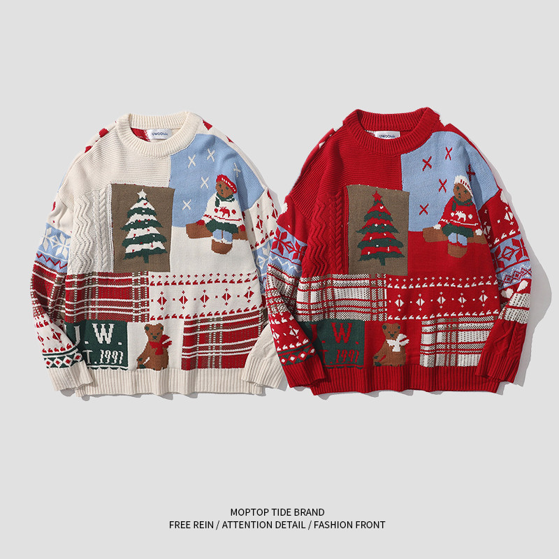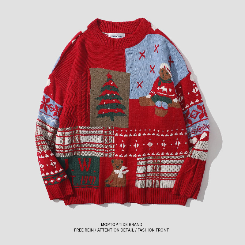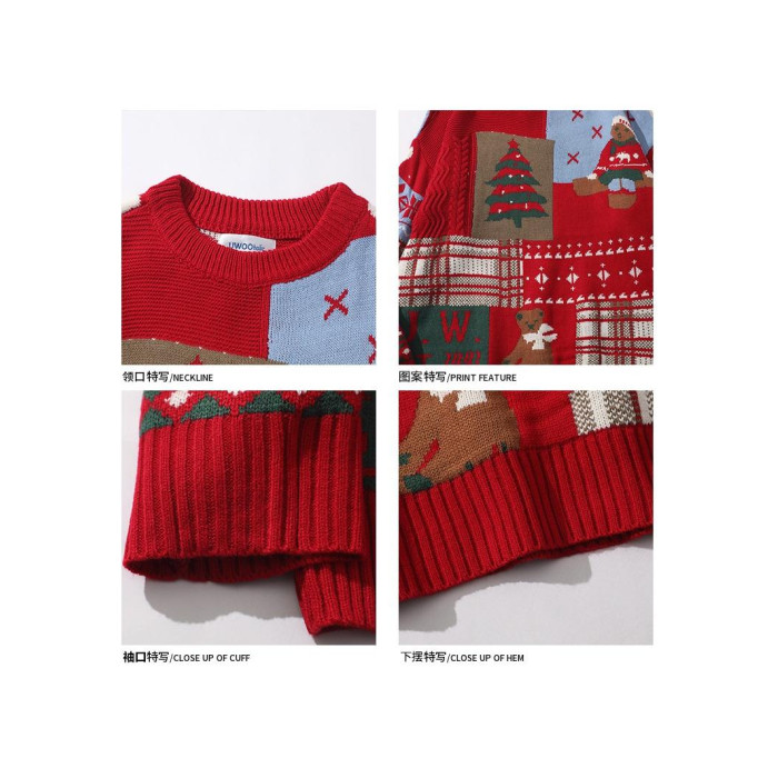 紅色過年聖誕節毛衣男女秋冬季潮流復古小熊慵懶風情侶圓領針織衫