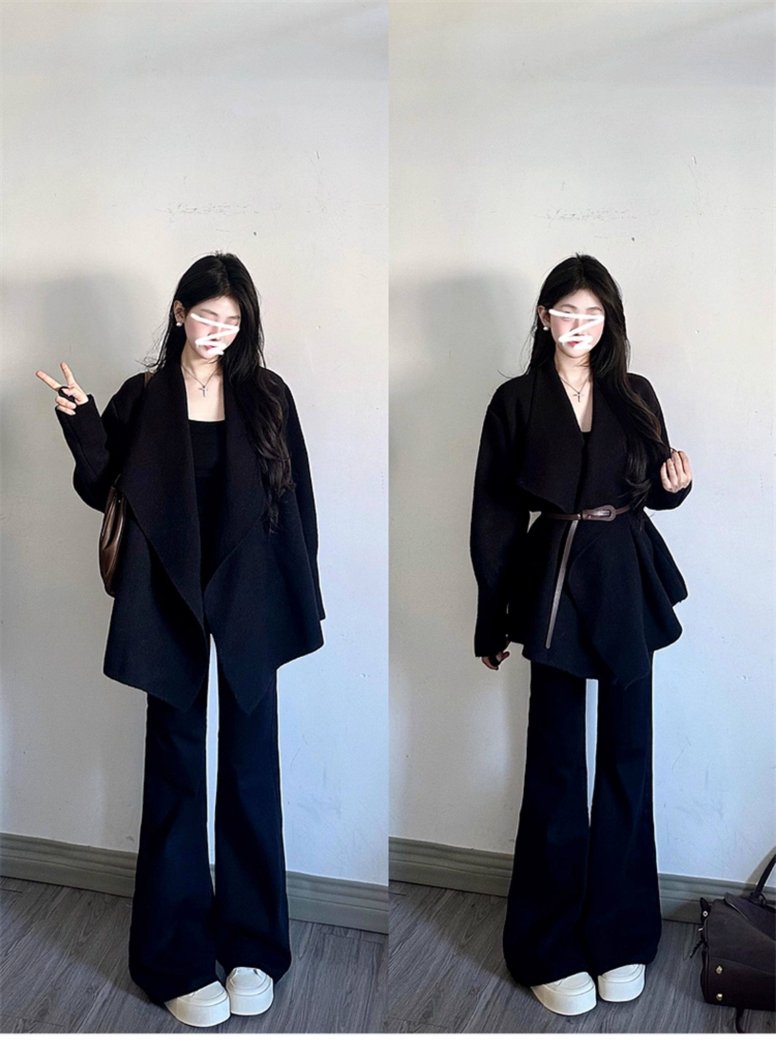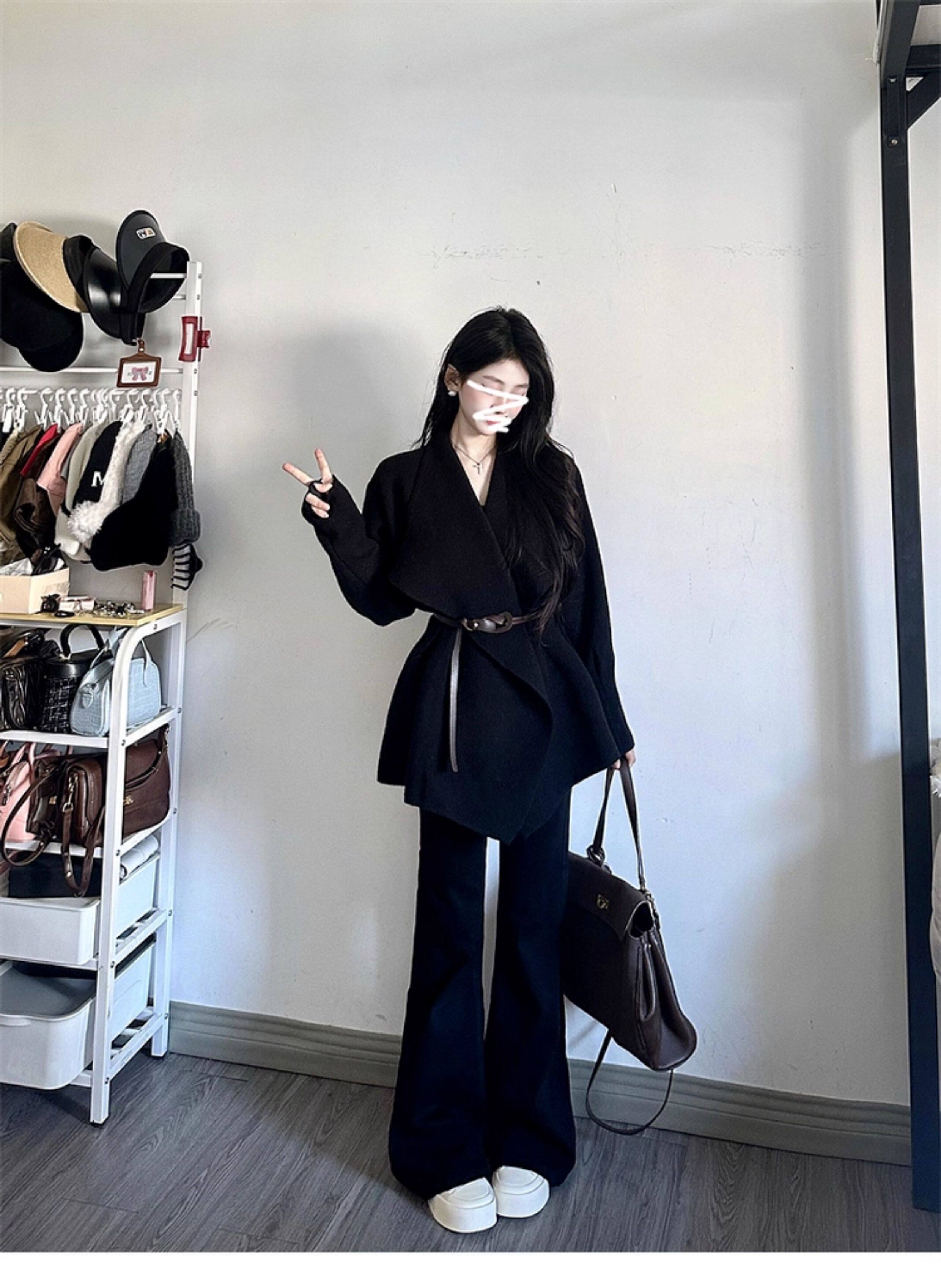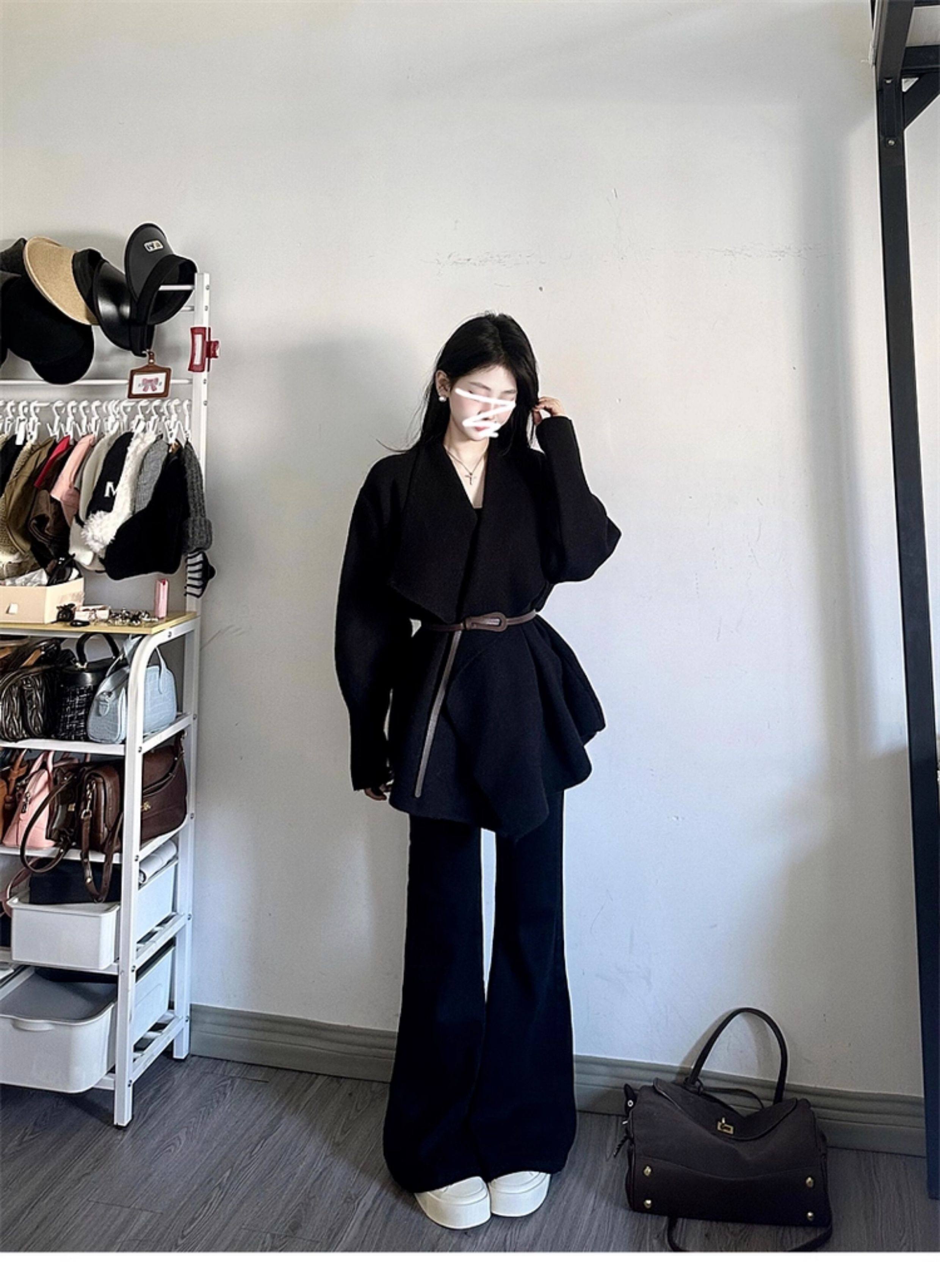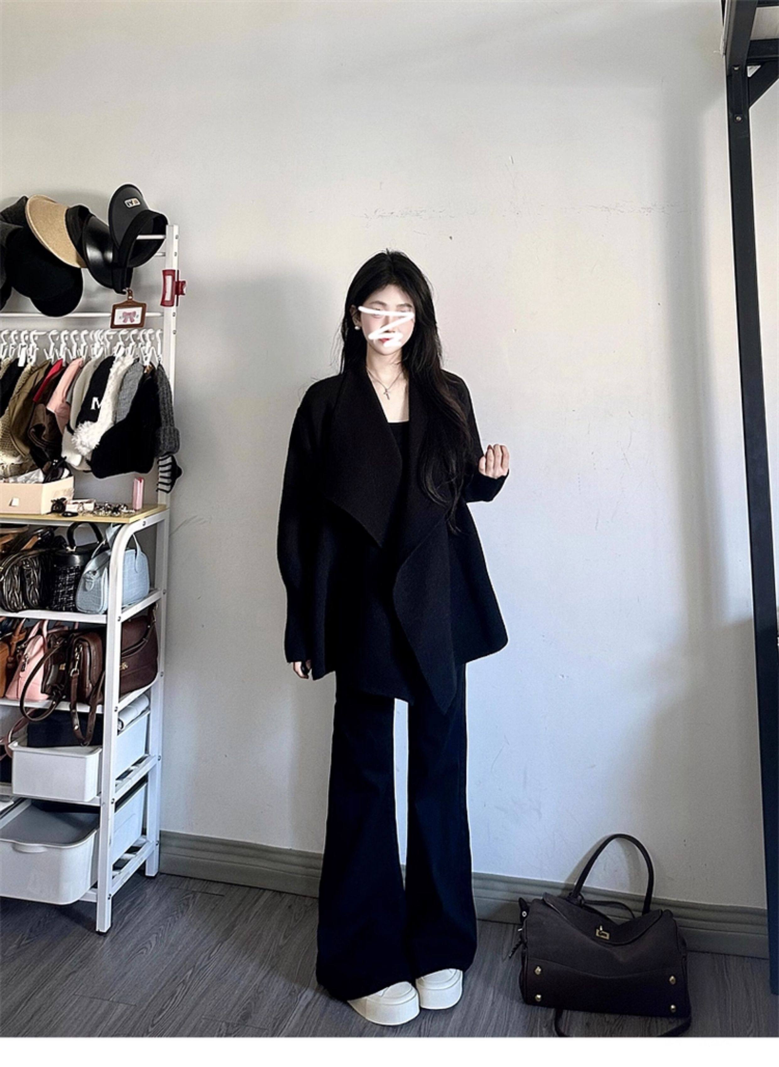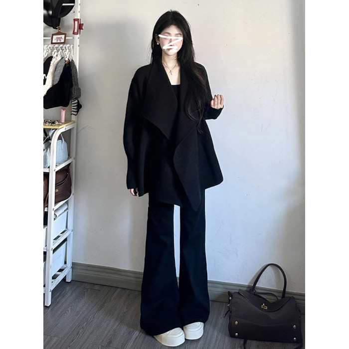 2025新款慵懶風韓系高級感黑色翻領針織開衫毛衣外套女秋冬小個子