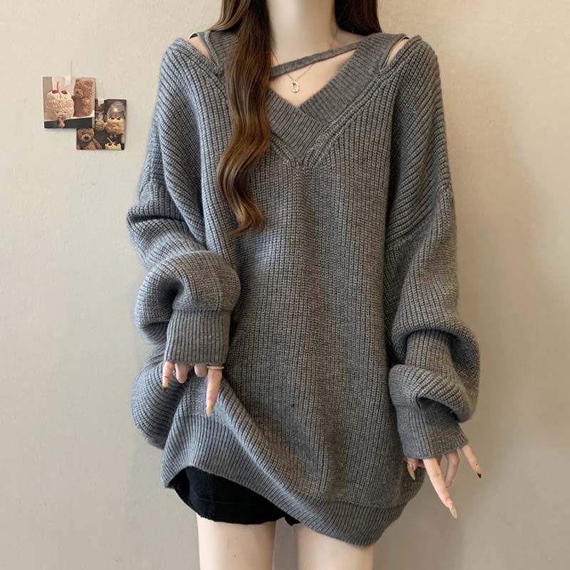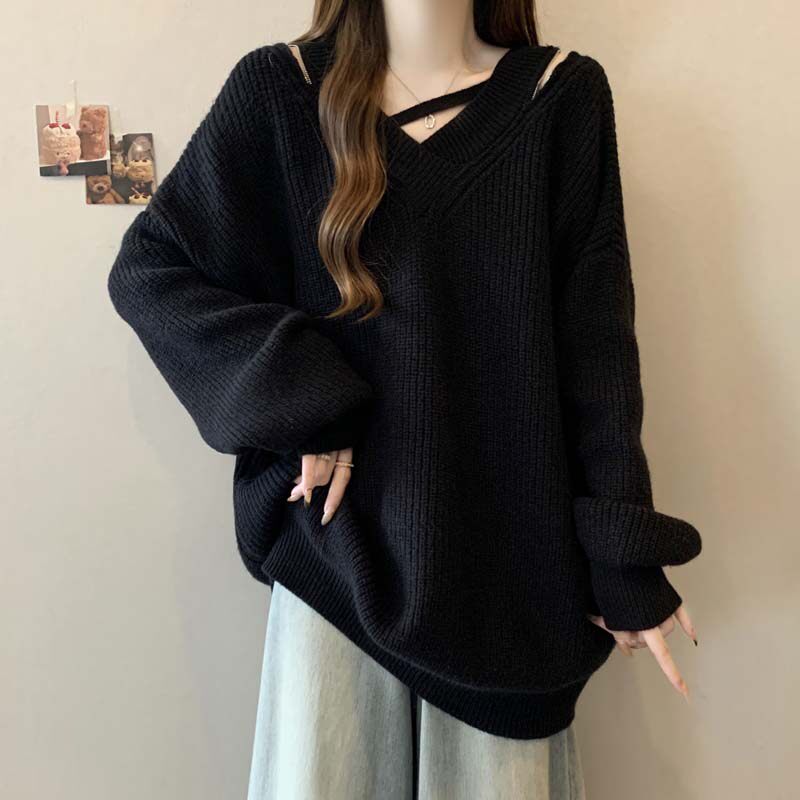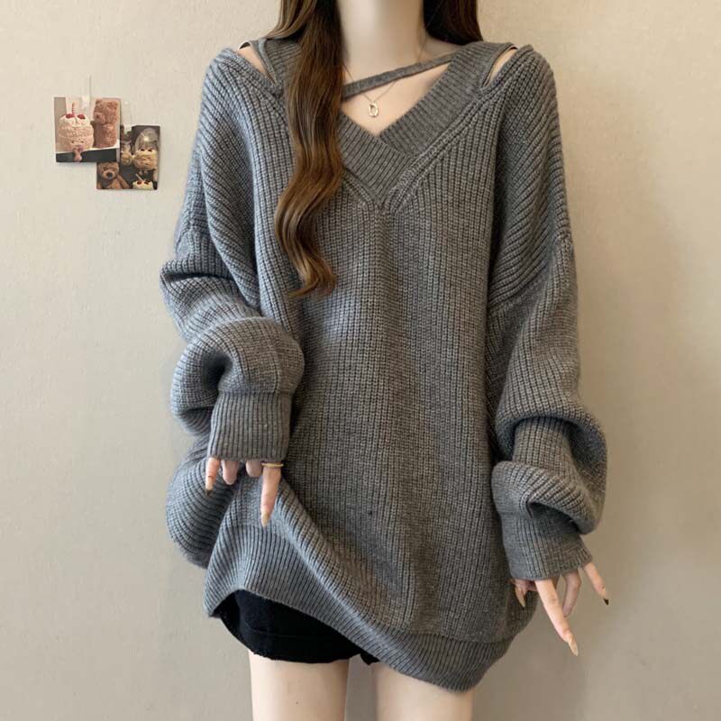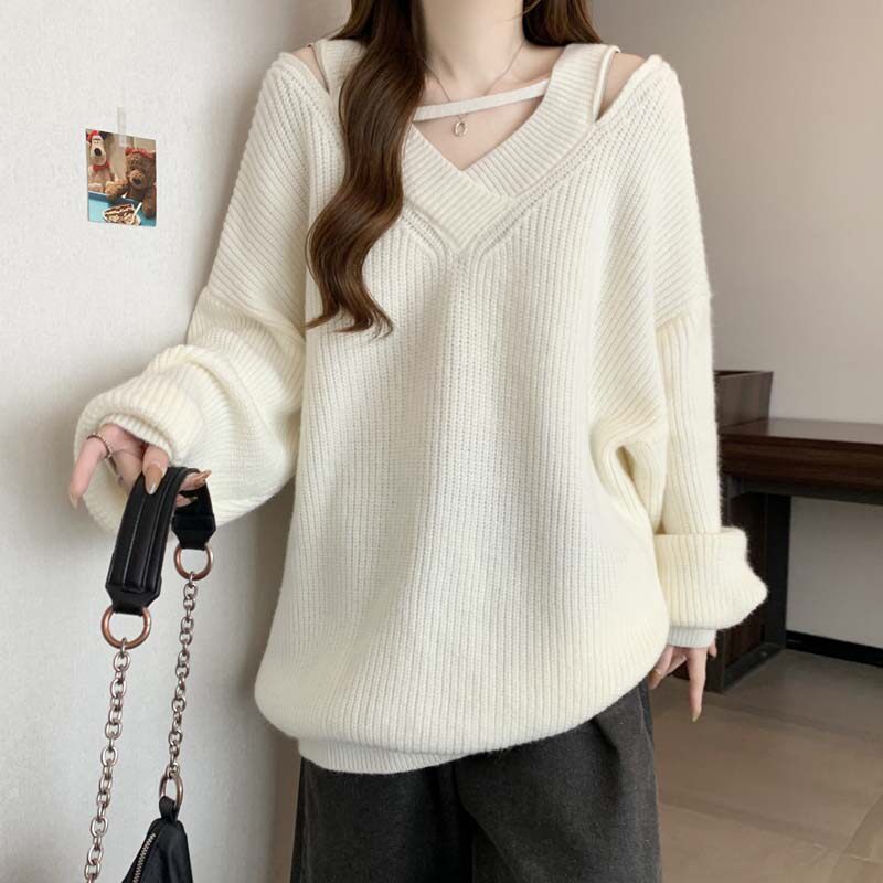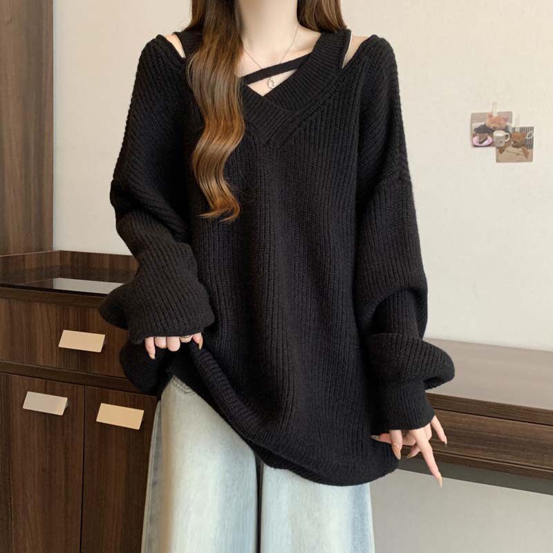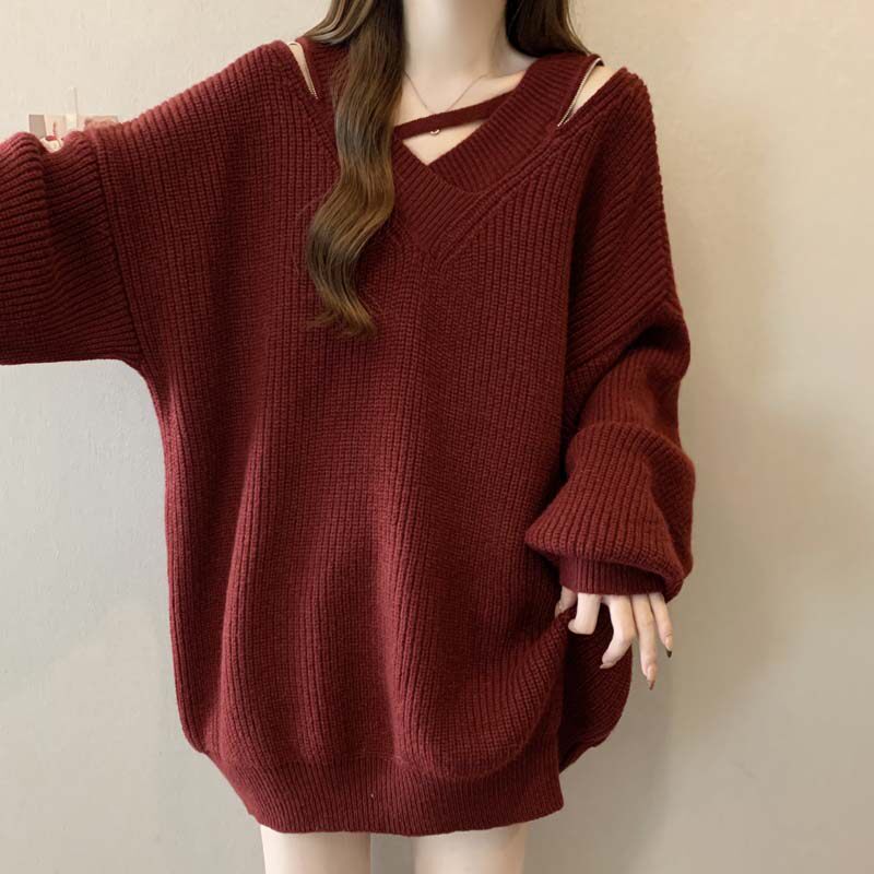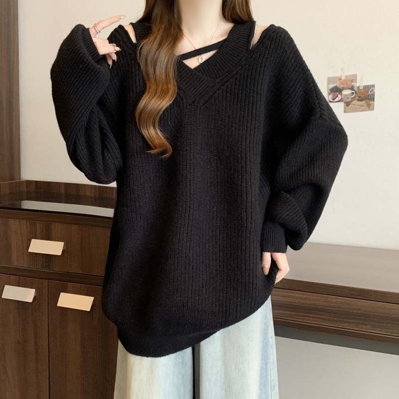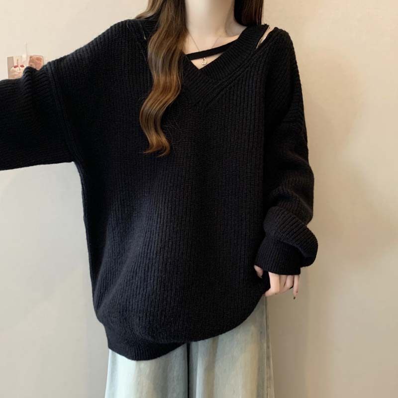 設計感鏤空露肩毛衣女春秋大碼胖mm下裝消失上衣慵懶風V領針織衫